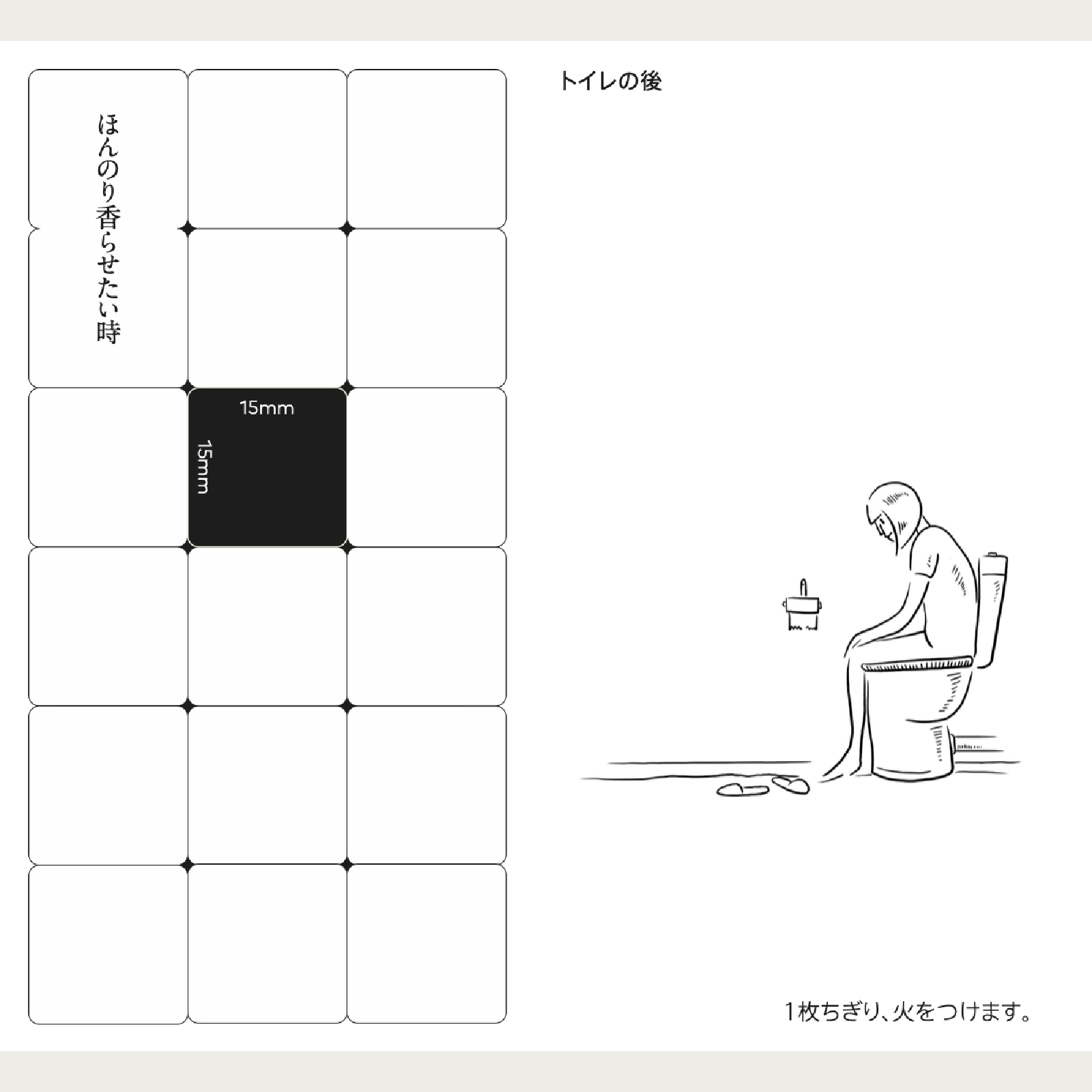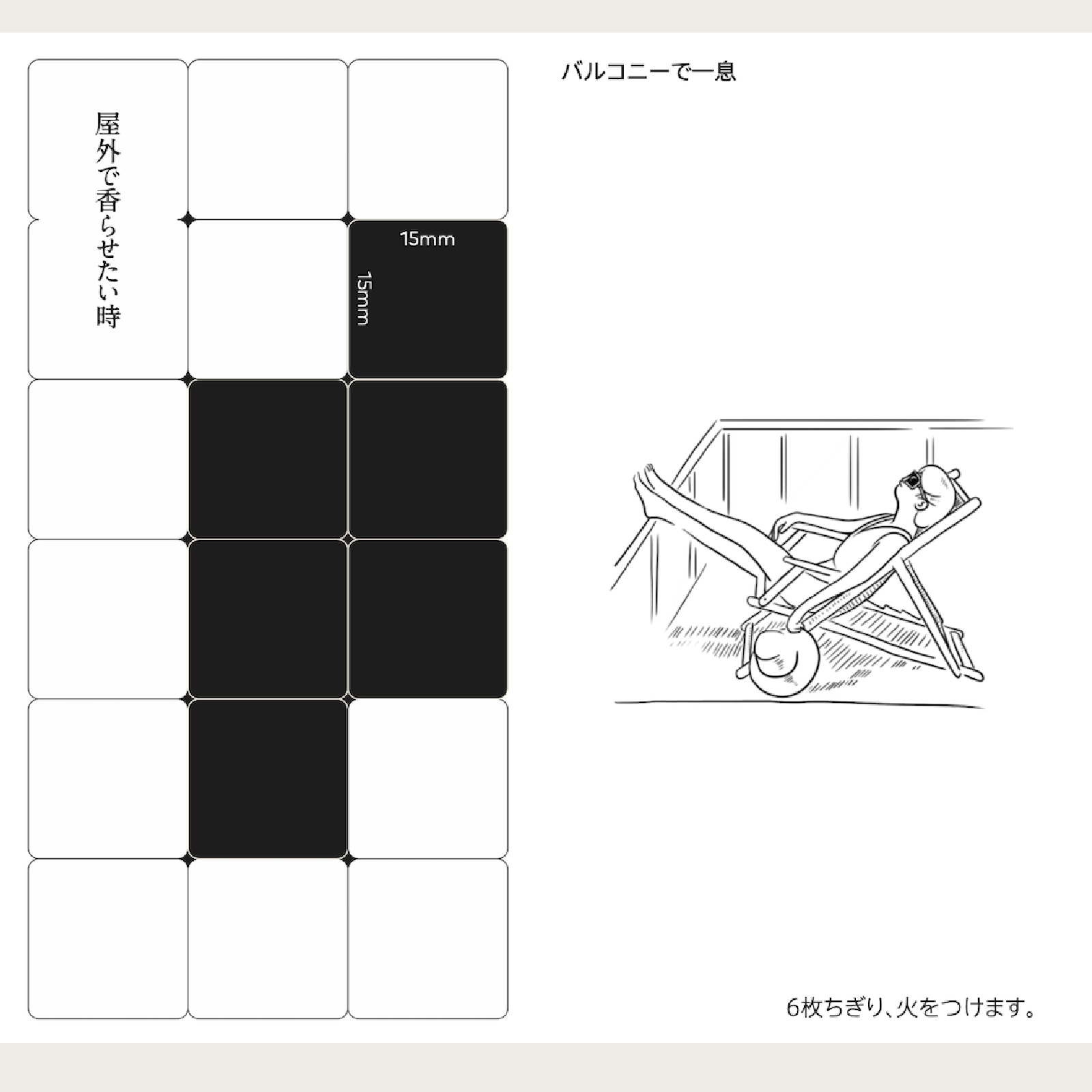 (1)ミシン目に沿ってちぎり、火をつけます。 (2)灰皿等にのせた不燃マットの上に置き、くゆる香りをお楽しみください。 その他、クローゼットや箪笥の引き出し、お財布や名刺ケースに忍ばせたり、手紙に添えて大切な人に香りを届けたり…火をつけなくても香りが立ちますので、色々な方法でお楽しみください。