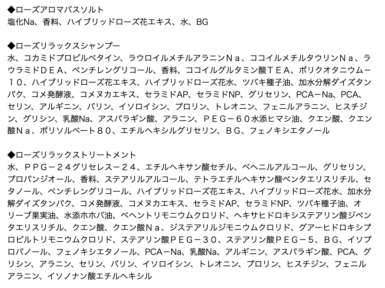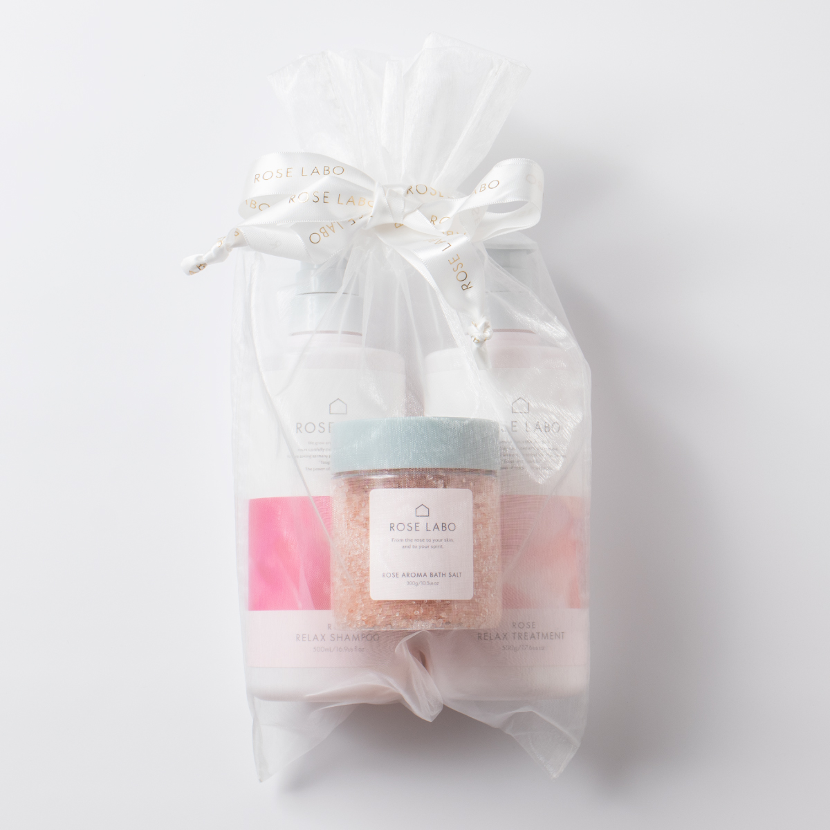 | 内容量/内容物 | ローズアロマバスソルト 300g(約15回分) ローズリラックスシャンプー 500mL ローズリラックストリートメント 500g |