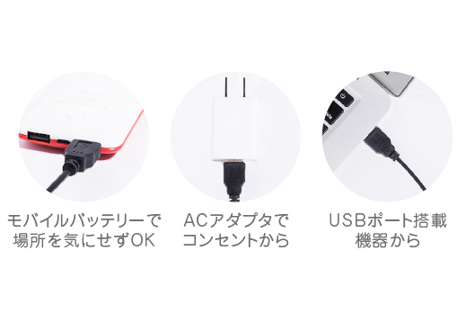 モバイルバッテリーで使えるので、場所を選ばずお気に入りの場所でリラックスタイムを過ごすことができます。 USB対応アダプタ(別売)でもご使用いただけます。