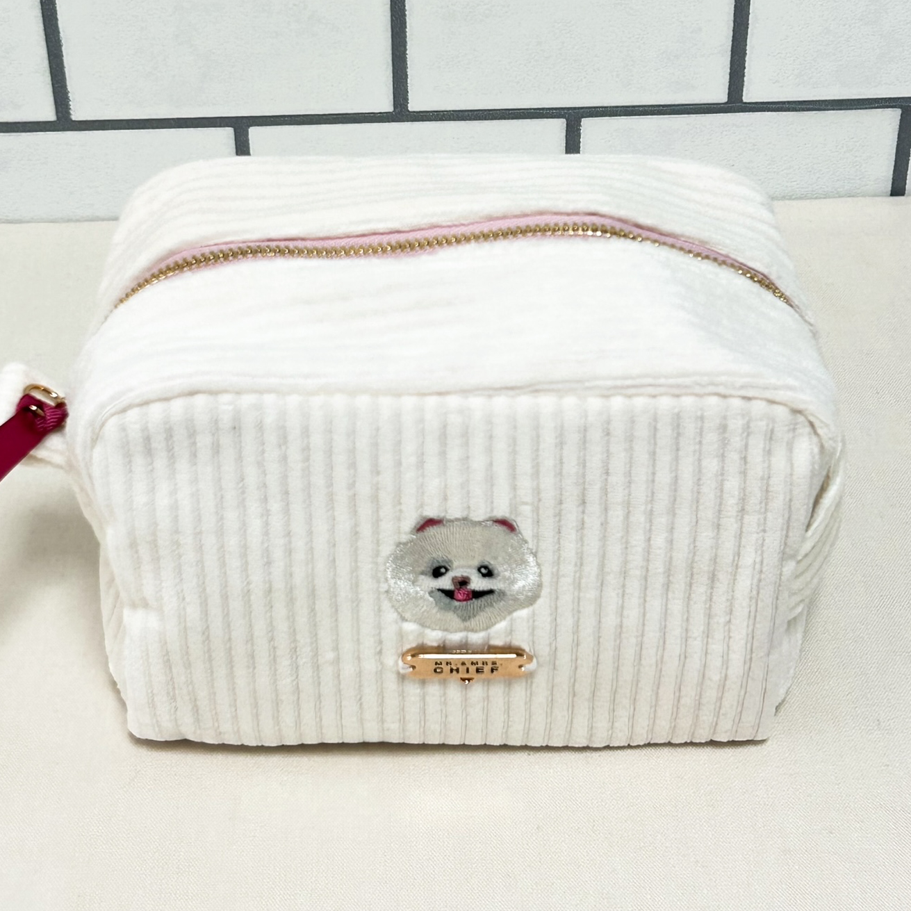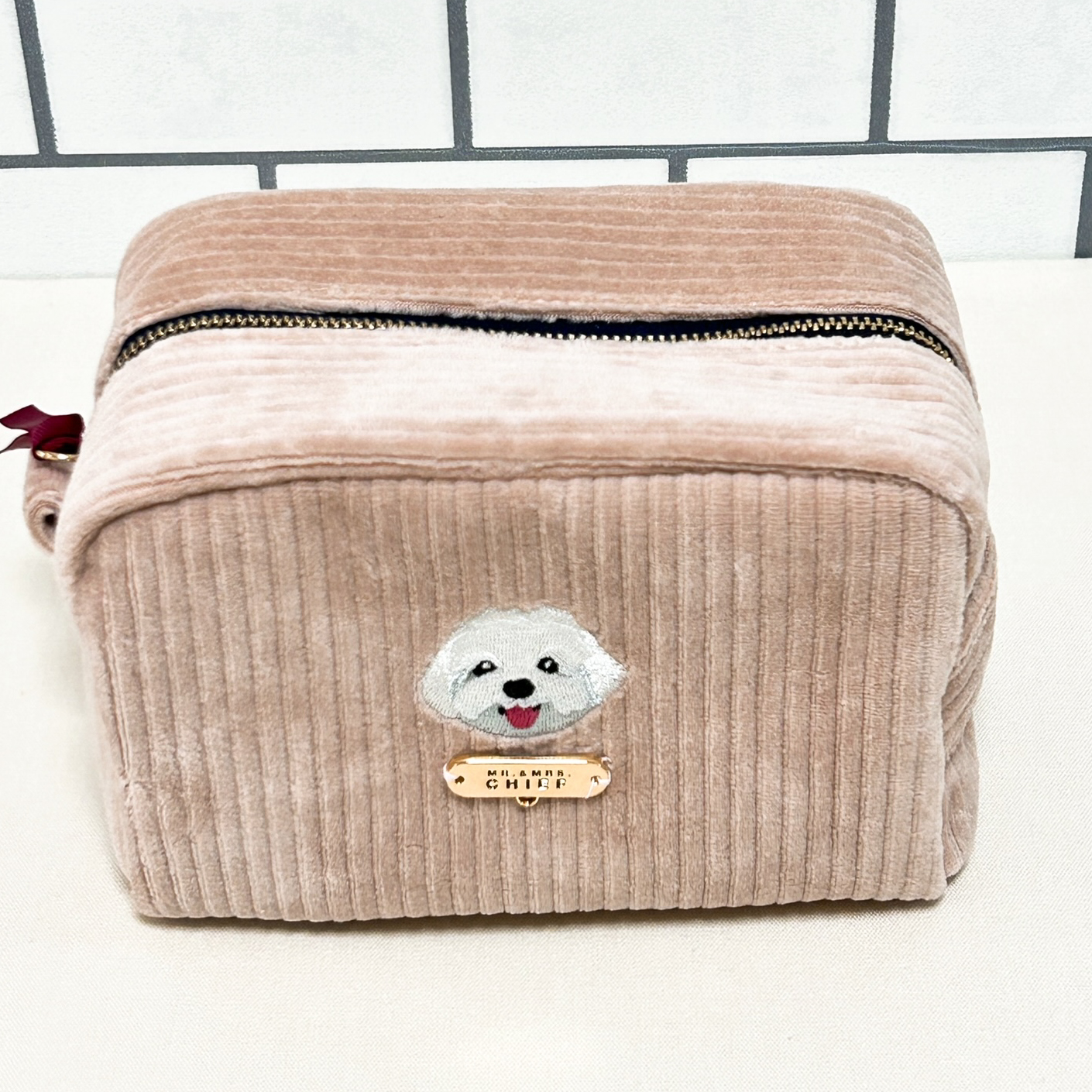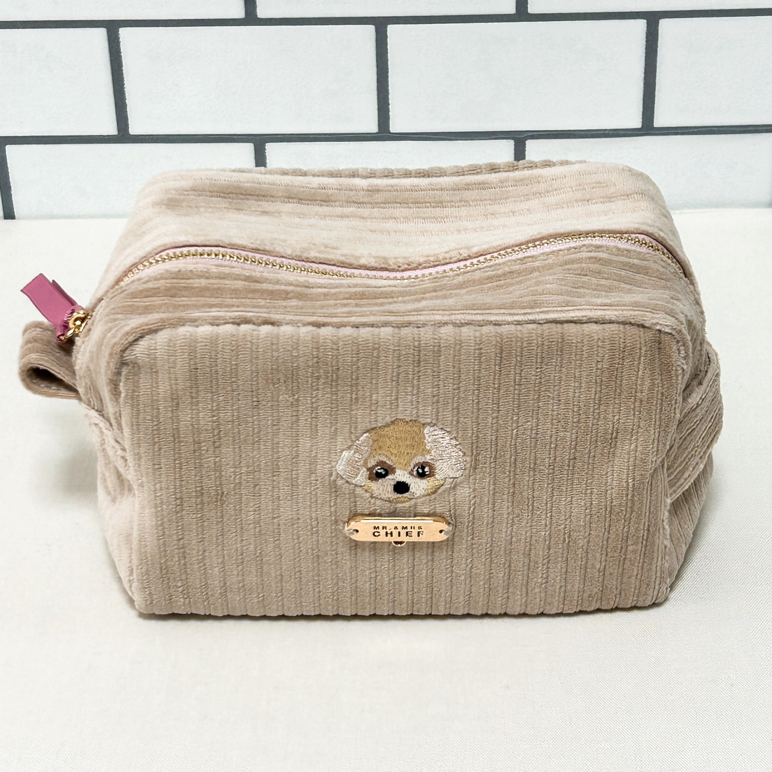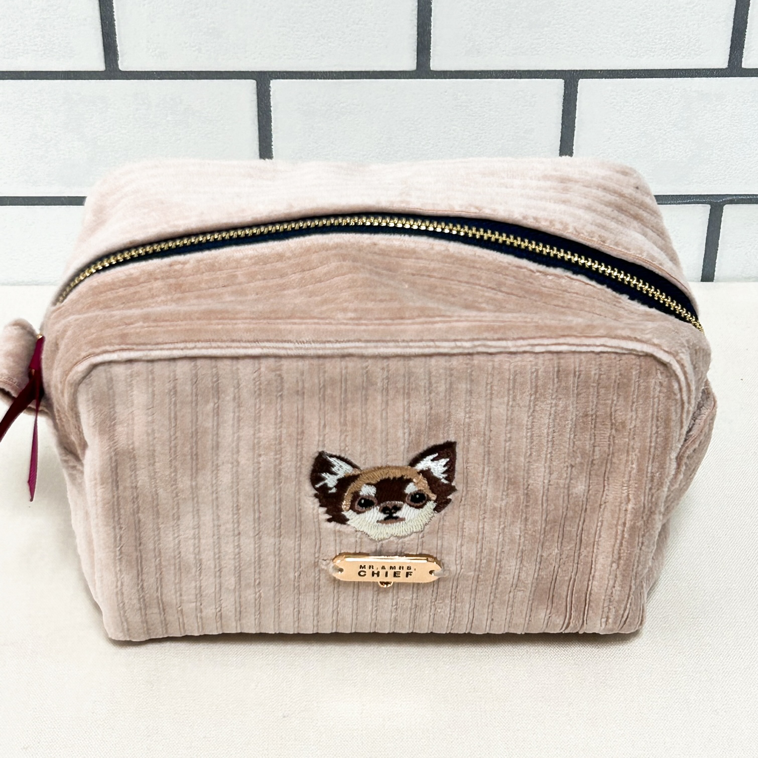 色の可愛いコーデユロイ生地にINUの刺繍をあしらった「INU POUCH」。マチが10cmあり、化粧品などたっぷり入ります。プレートやファスナー部にチャームをつければご自分だけの仕様に。