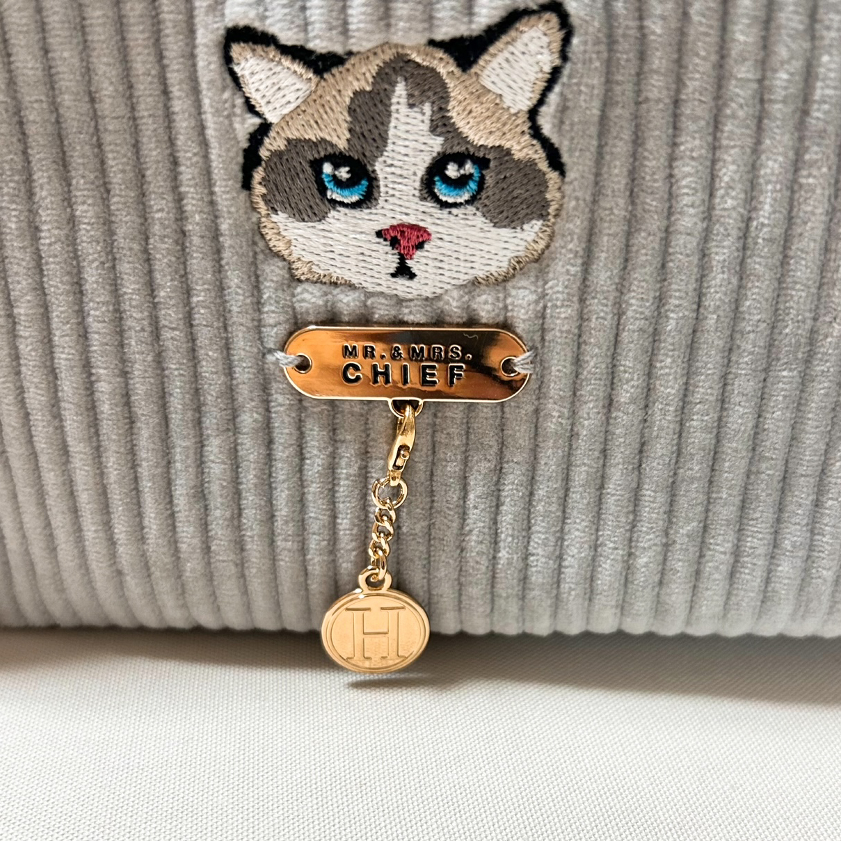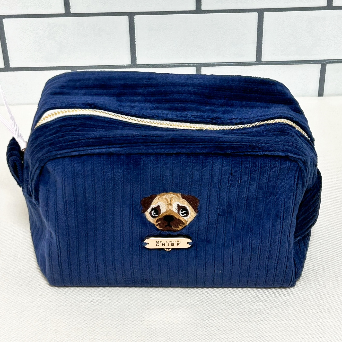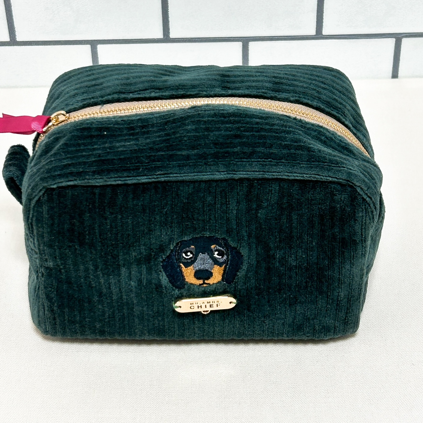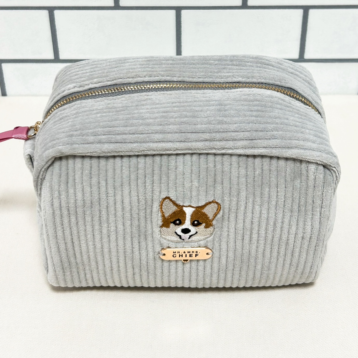 色の可愛いコーデユロイ生地にINUの刺繍をあしらった「INU POUCH」。マチが10cmあり、化粧品などたっぷり入ります。プレートやファスナー部にチャームをつければご自分だけの仕様に。