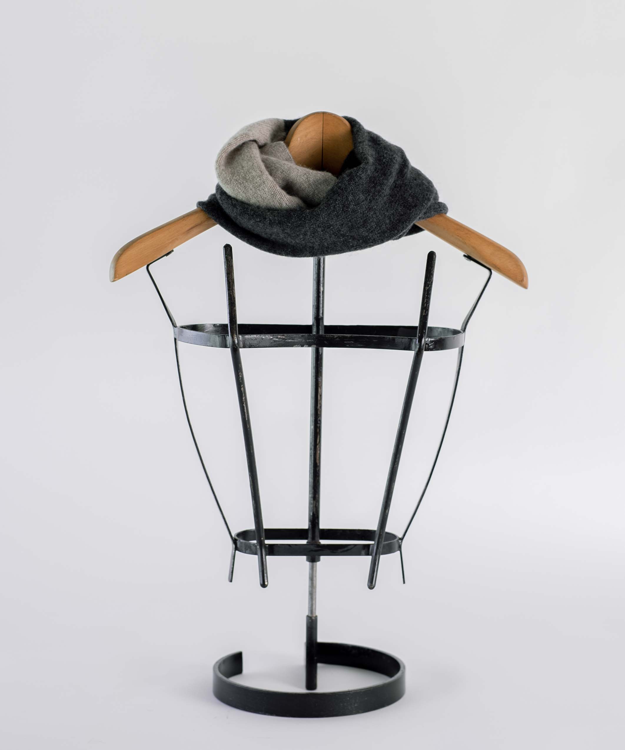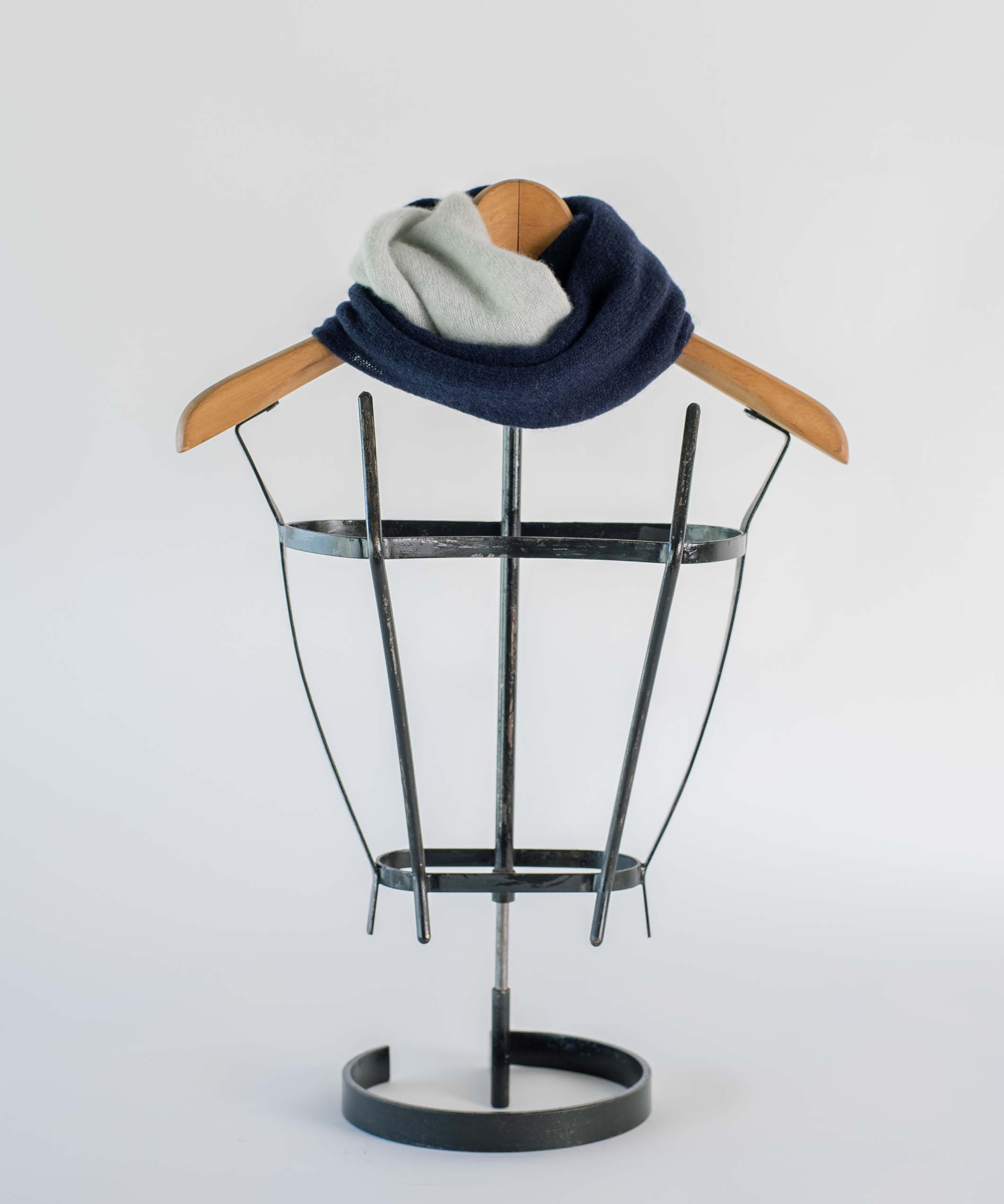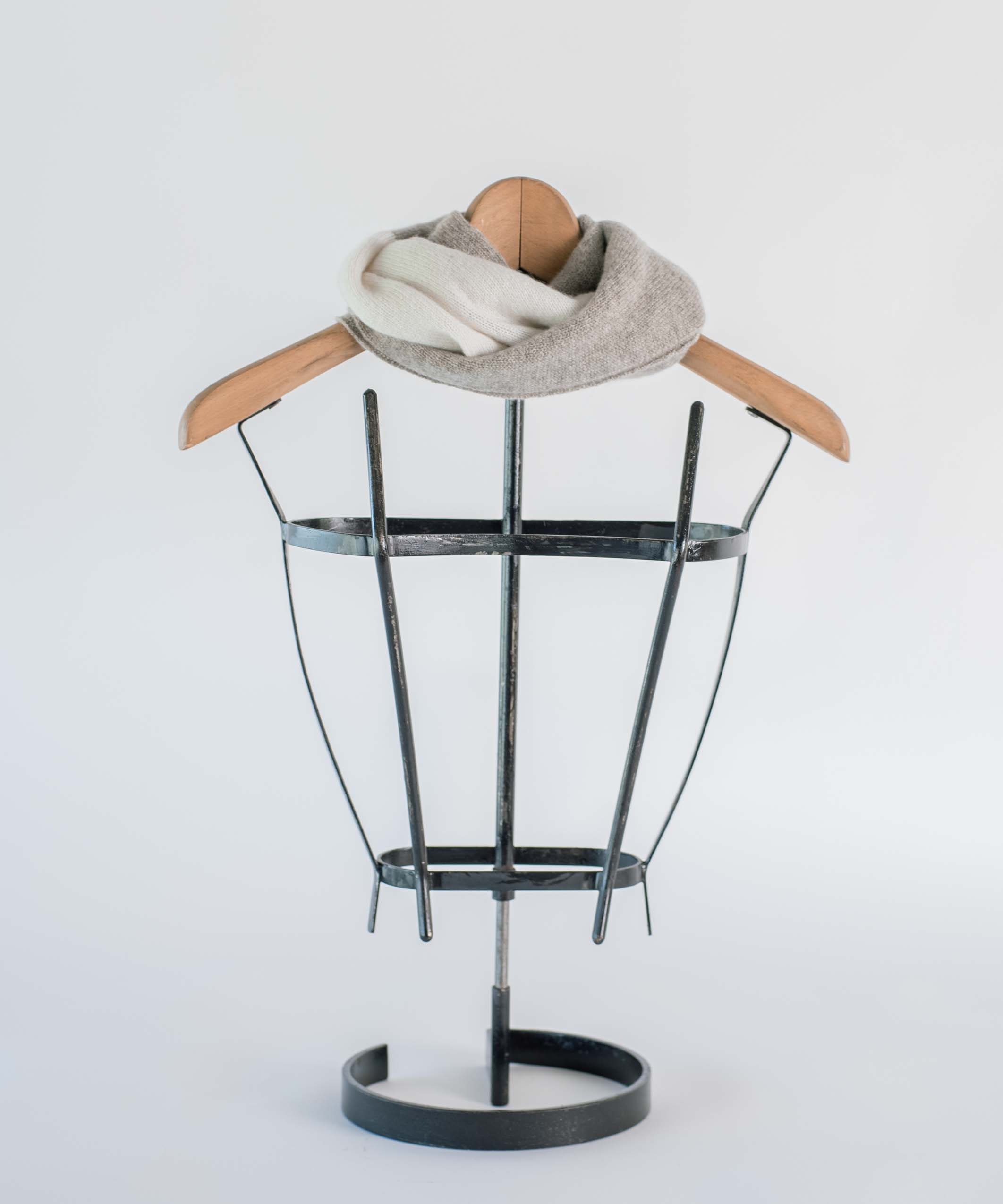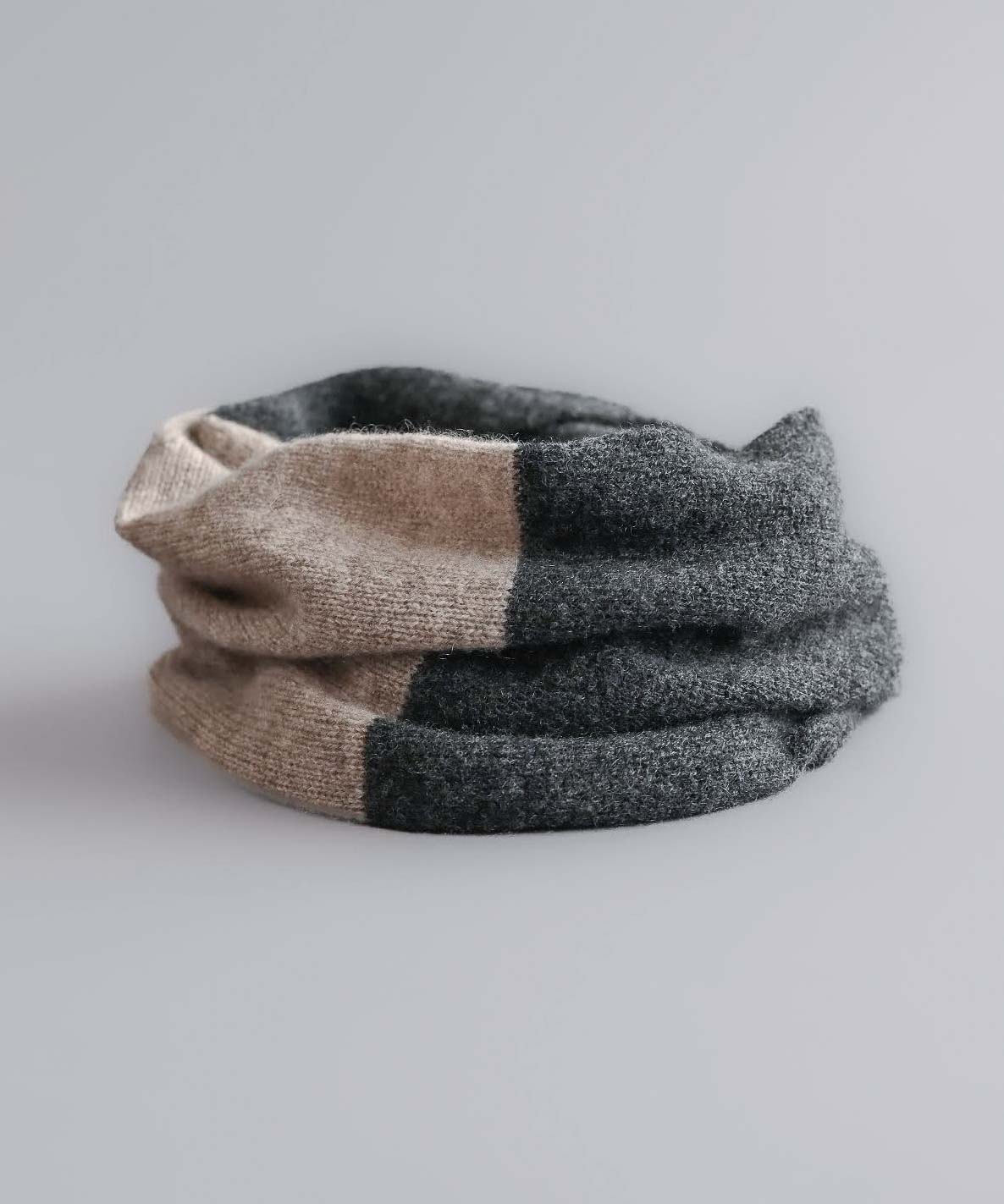 国内有名ブランドのOEMも手がける工房で昔ながらの手編み機にて、人の手で編み機のキャリッジを動かして編んで作ったスヌードです。編み機で編むときには、糸を張るテンションと、編地を下に引っ張るテンションが大事です。それを人の手と目で具合を見ながら優しく編むことによって、非常に軽く柔らかく暖かいスヌードができました。使うほどに柔らかさと暖かさが増し、特別な日常のひとときを彩ります。