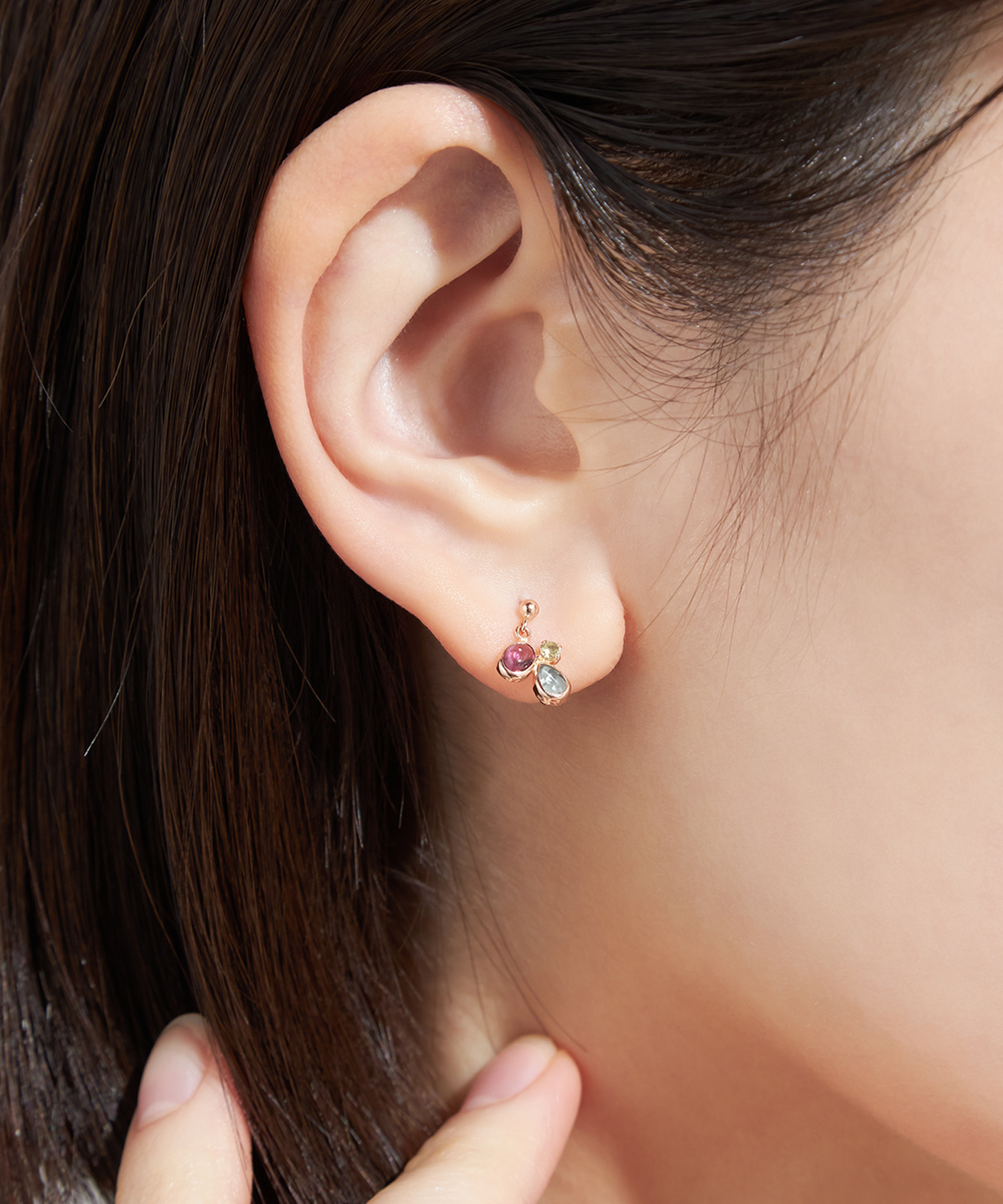 繊細な色合いのロードライトガーネット、スカイブルートパーズ、ハニーキュービックジルコニアが絶妙に組み合わさった、高級感あふれるピアス。それぞれの石が放つ光が耳元を彩り、上品な装いを演出します。