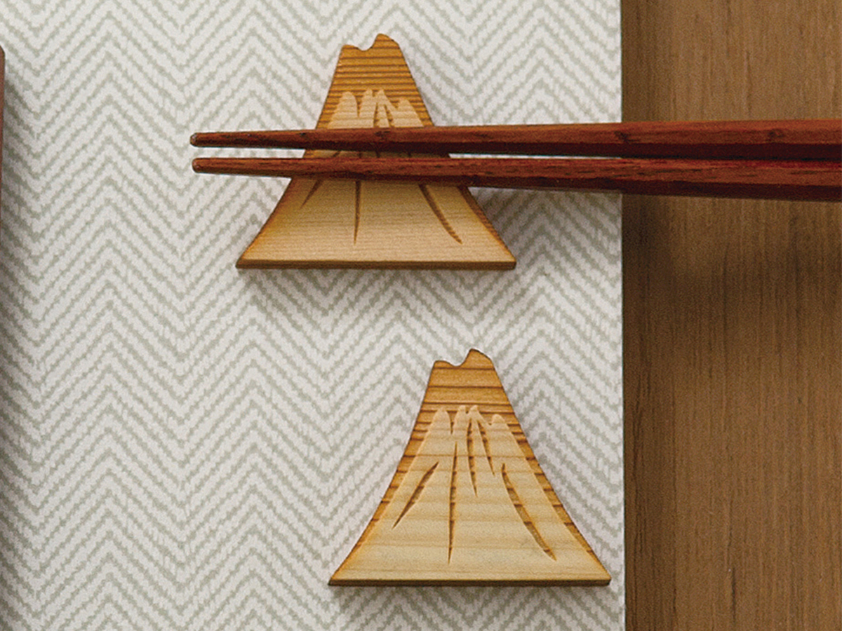 箸置きは檜の木を使用しています。縁起の良い富士山をモチーフにしています。檜の色を活かし、末広がりなすそ野が丁寧に描かれています。