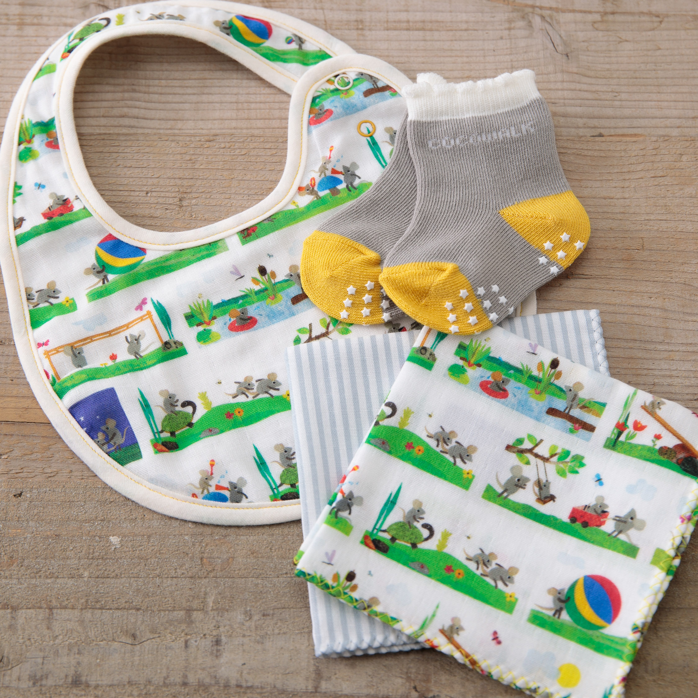 | 素材/繊維 | スタイ:綿100% ハンカチ:綿100% ソックス:綿56%、アクリル24%、ナイロン15%、ポリウレタン2% |