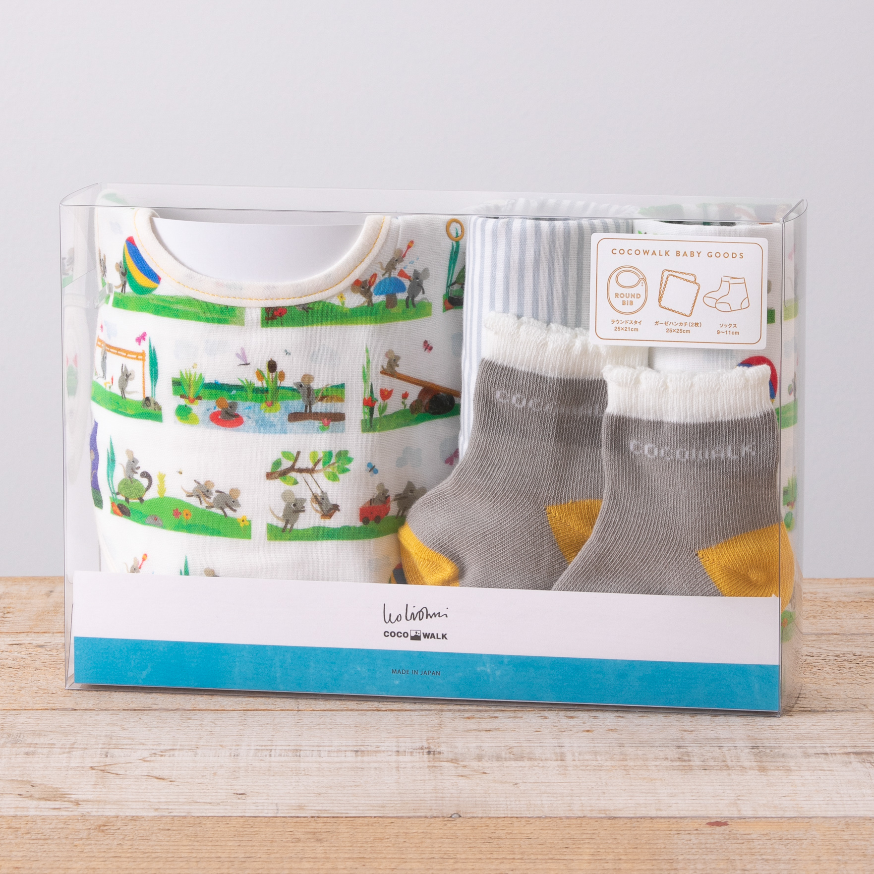 大人気キャラクターのオリジナルギフトセット。何枚あっても困らないガーゼハンカチとスタイとソックスのギフトセットです。
