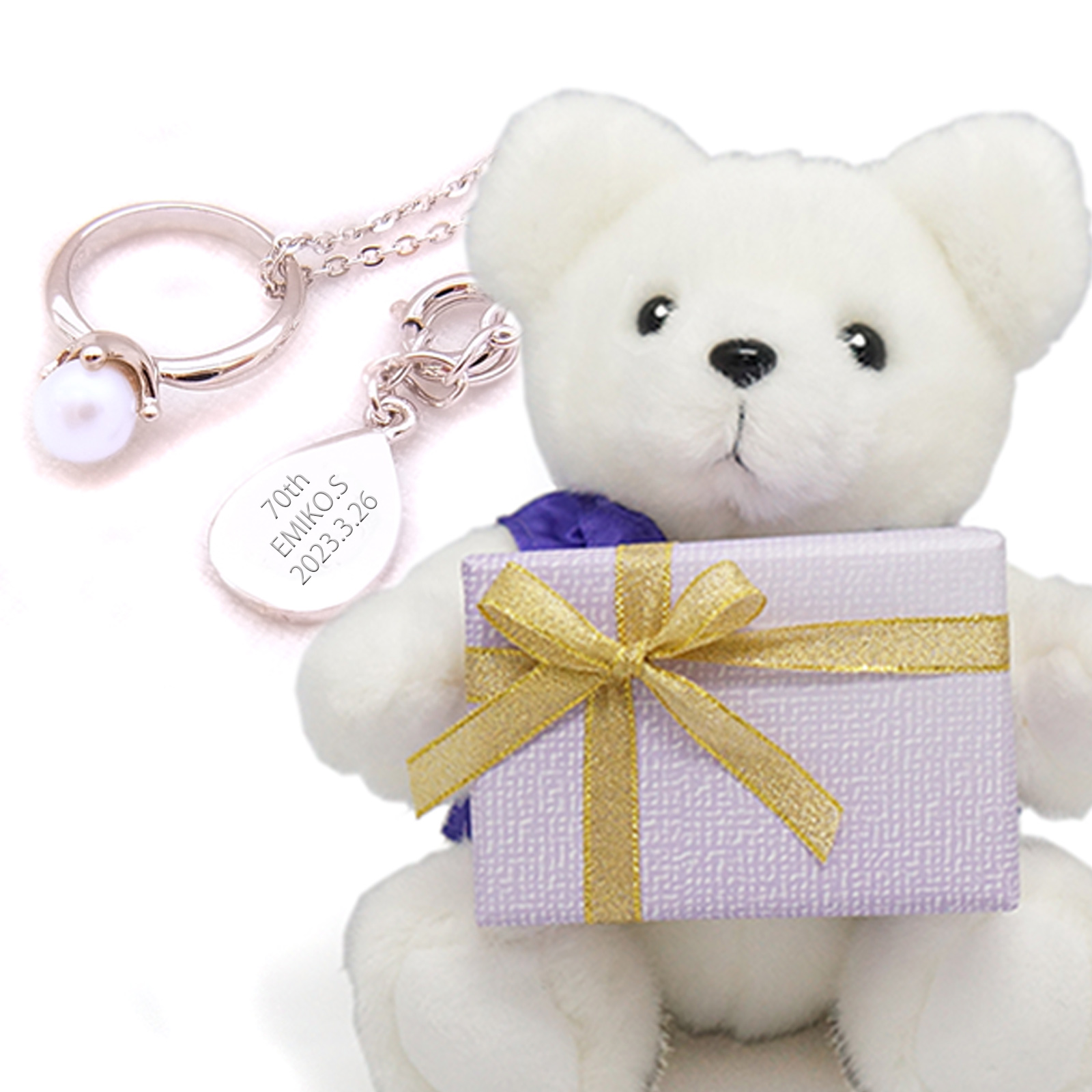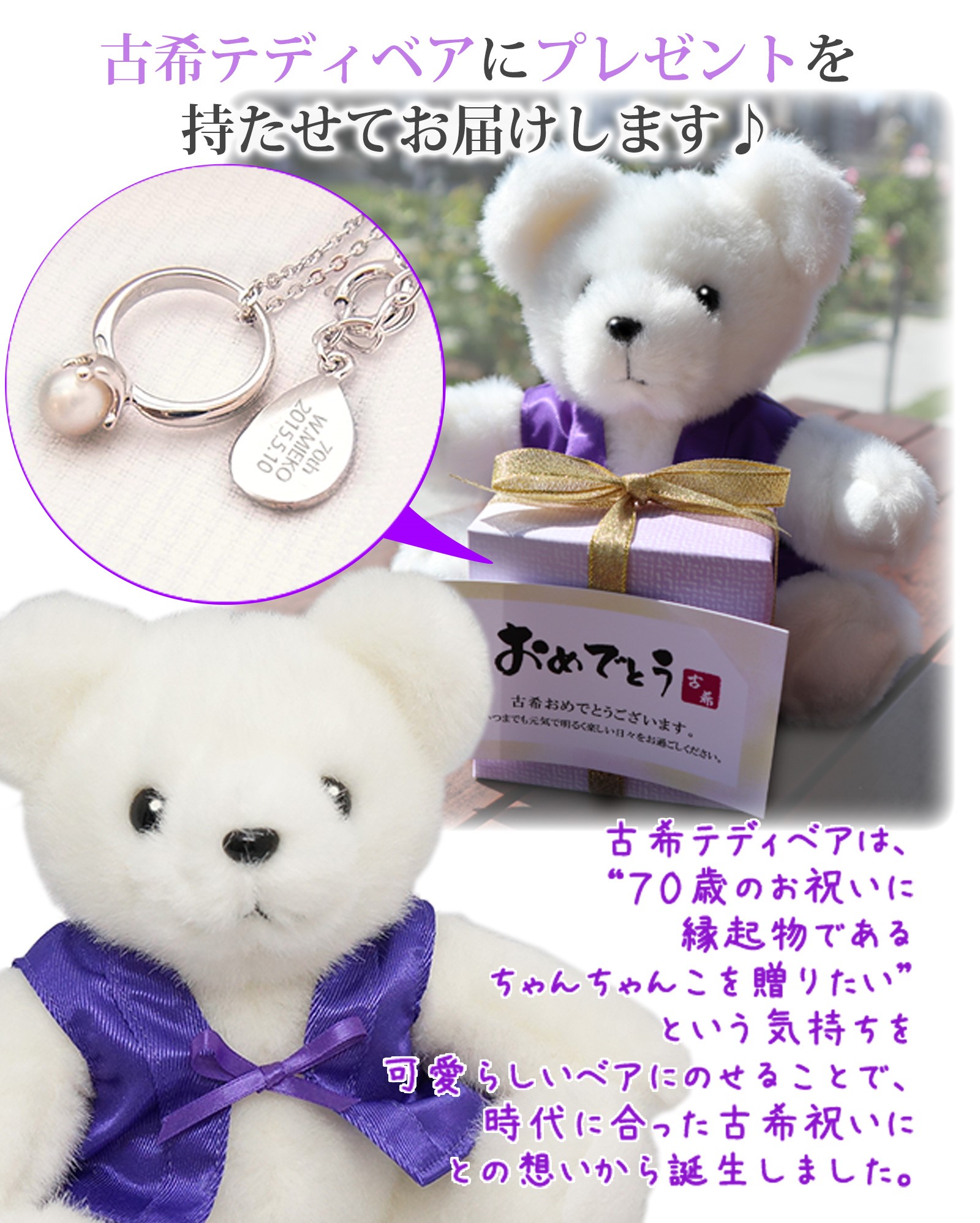 大口注文・法人のお問い合わせはこちらベビーリングペンダントは記念の日付やお名前を刻印できるプレート付き。 お守りの意味もあり、これからも元気でいて欲しいお母さんへの贈り物にぴったりです。 そんなパールベビーリングペンダントを、お母さんの代わりに紫のちゃんちゃんこを着た古希ベアに持たせてプレゼント!