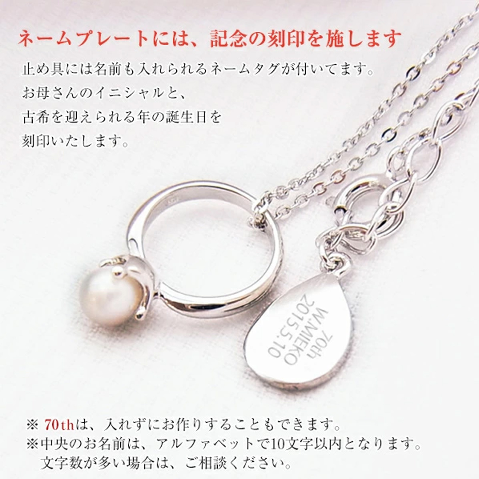 ベビーリングペンダントの止め具には名前も入れられるネームタグが付いています。 お母さんのイニシャルと、古希を迎えられる年の誕生日を刻印いたします。