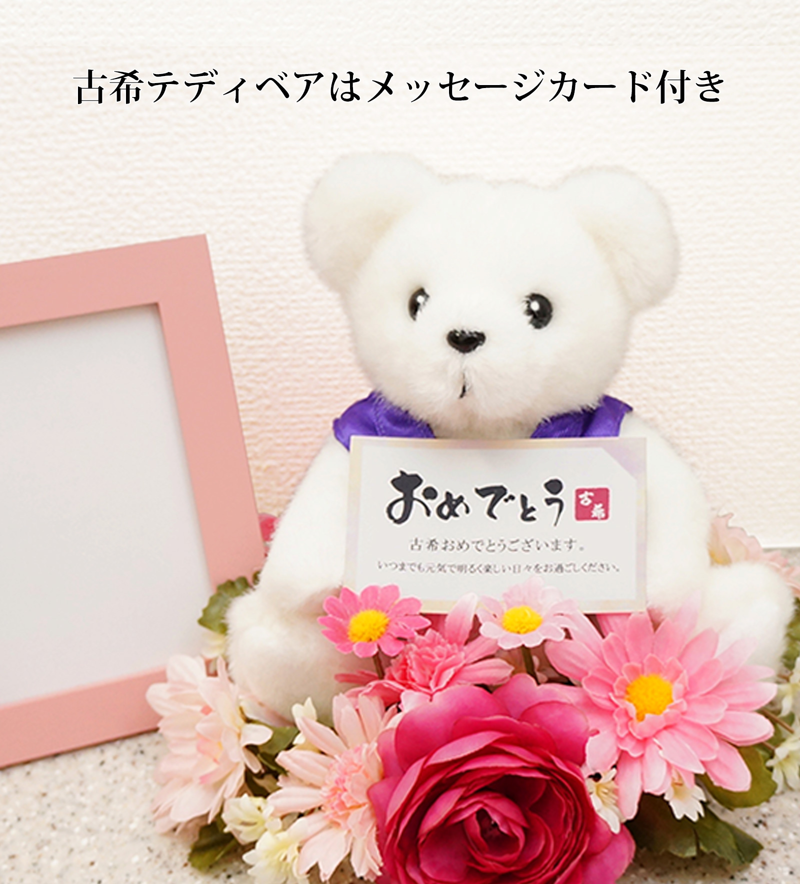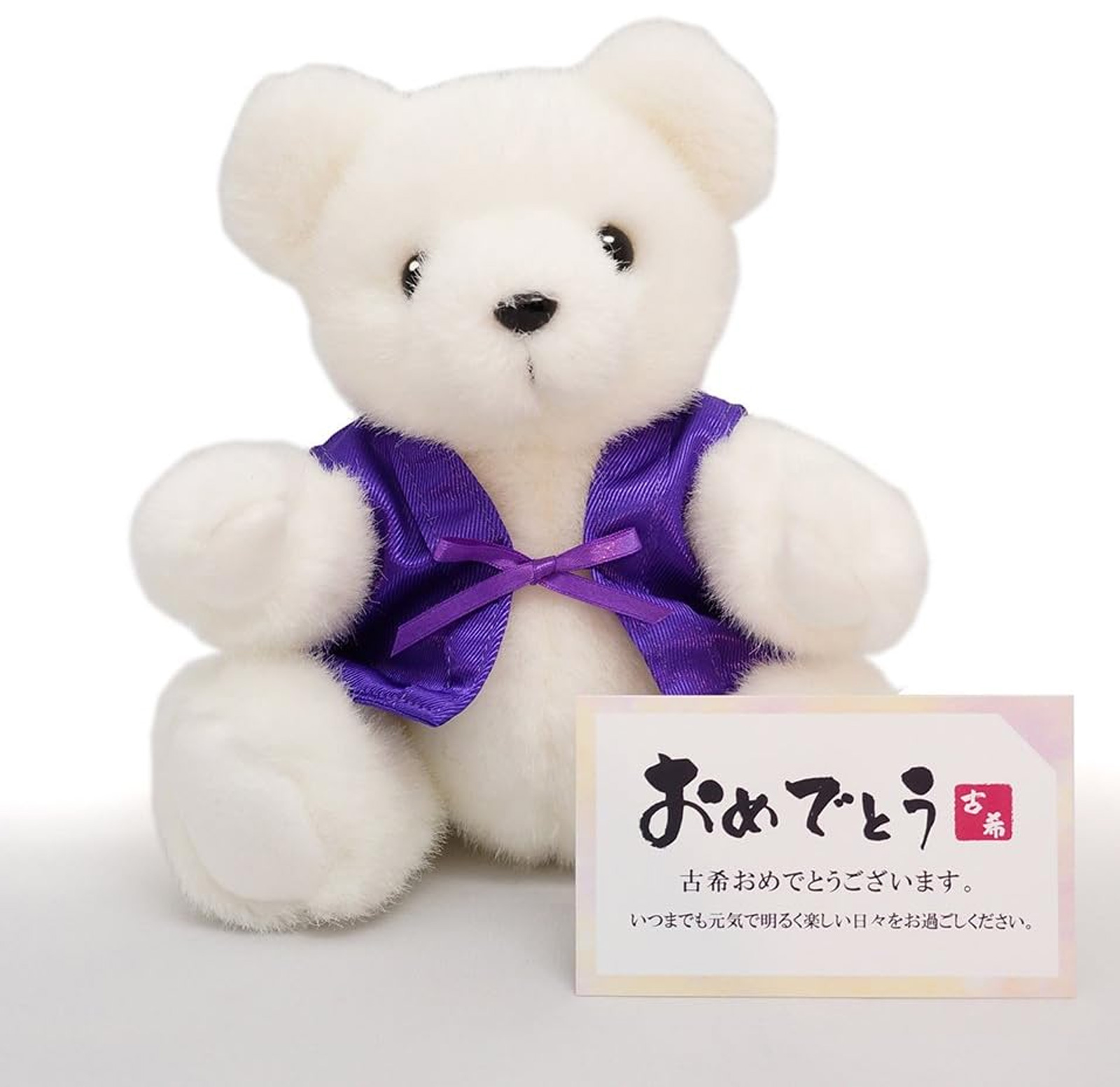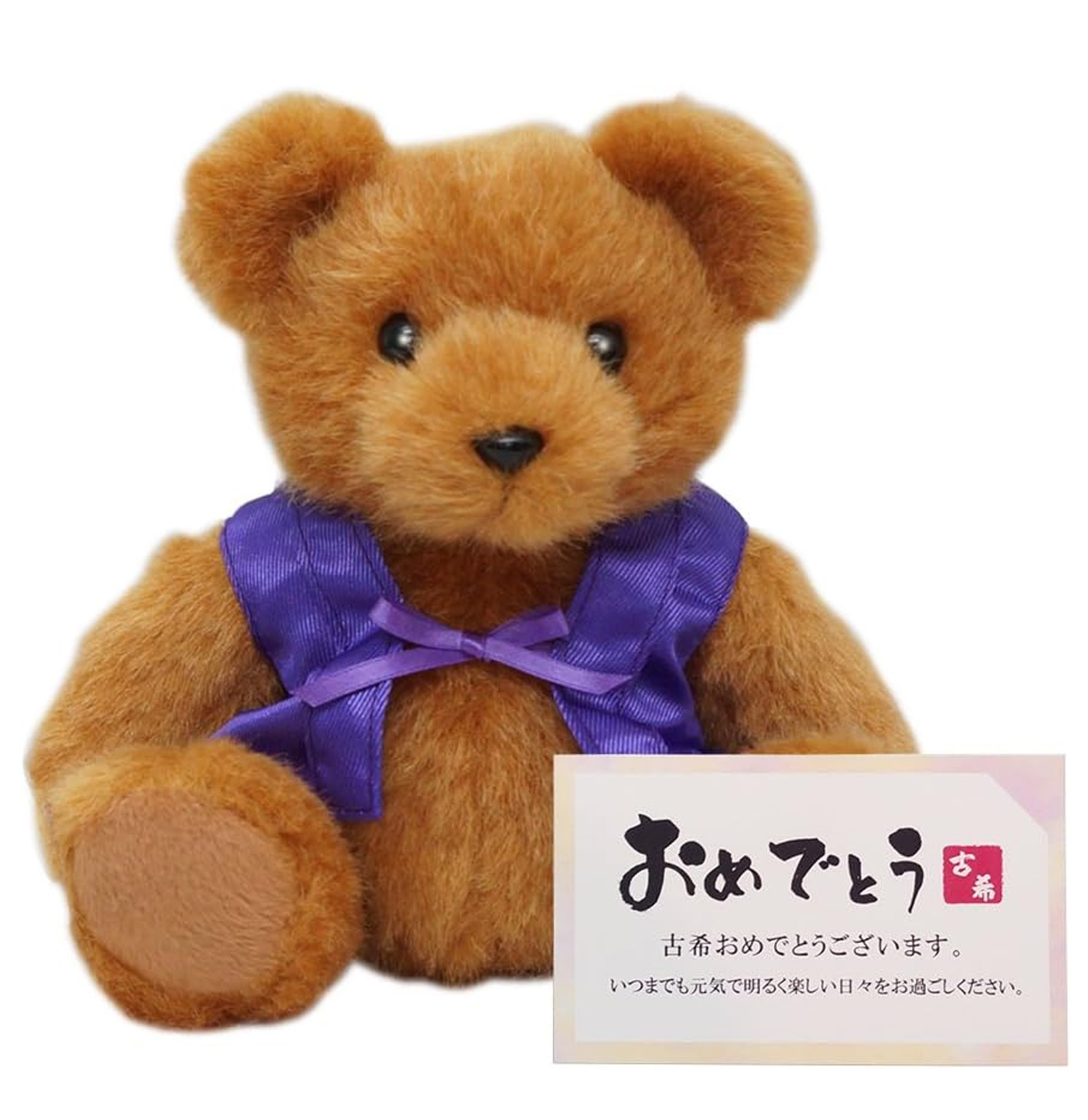 古希ベアには無料でメッセージカードをお付けできます。 カードはシチュエーションに合わせて3種類からお選びいただけます。