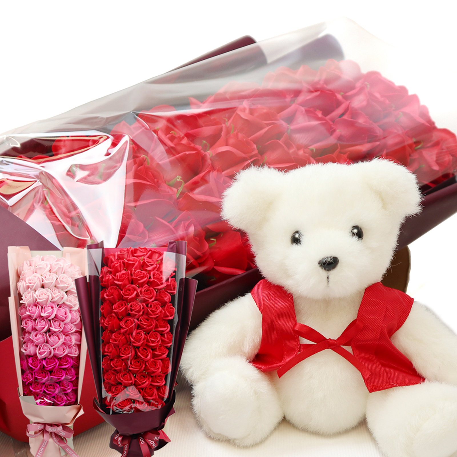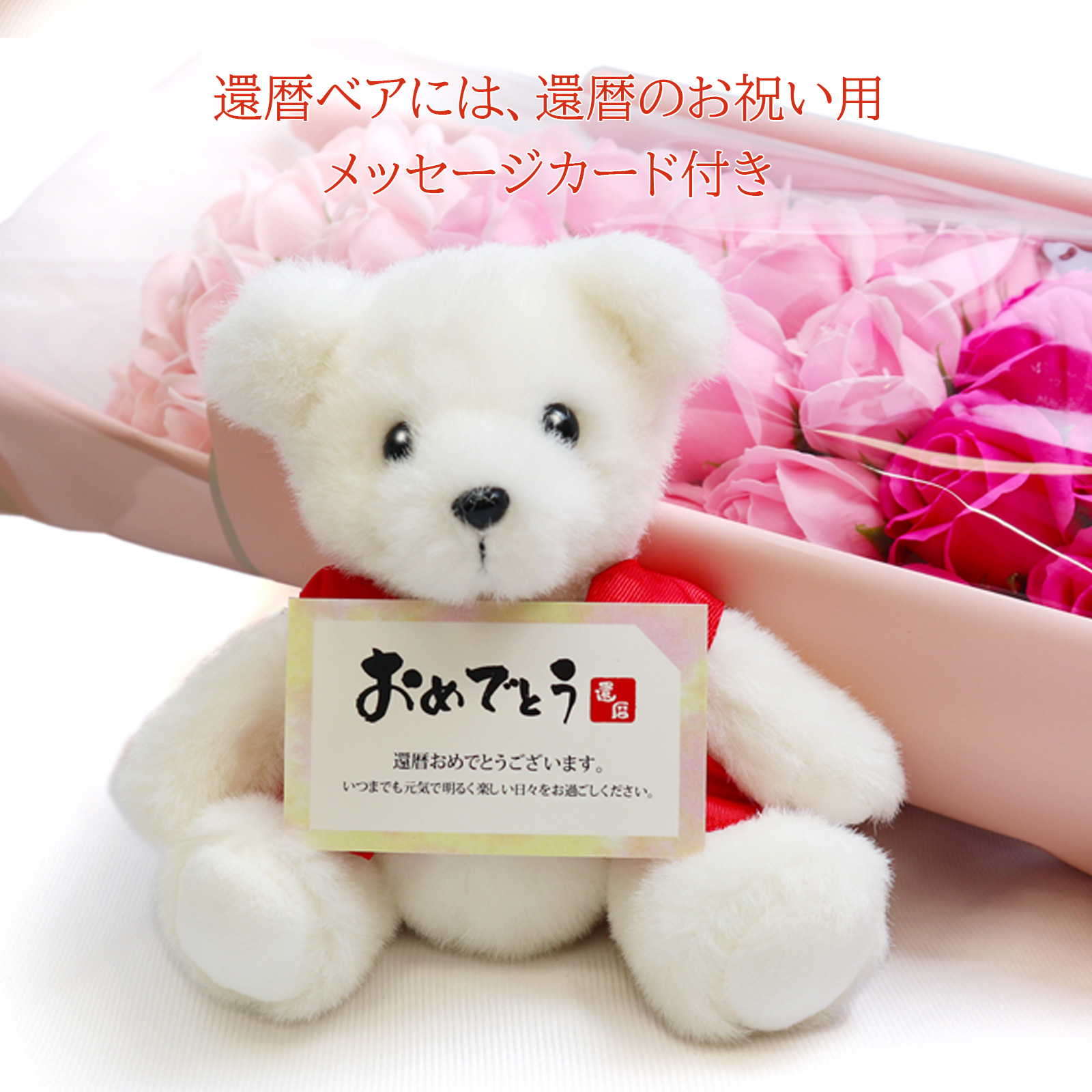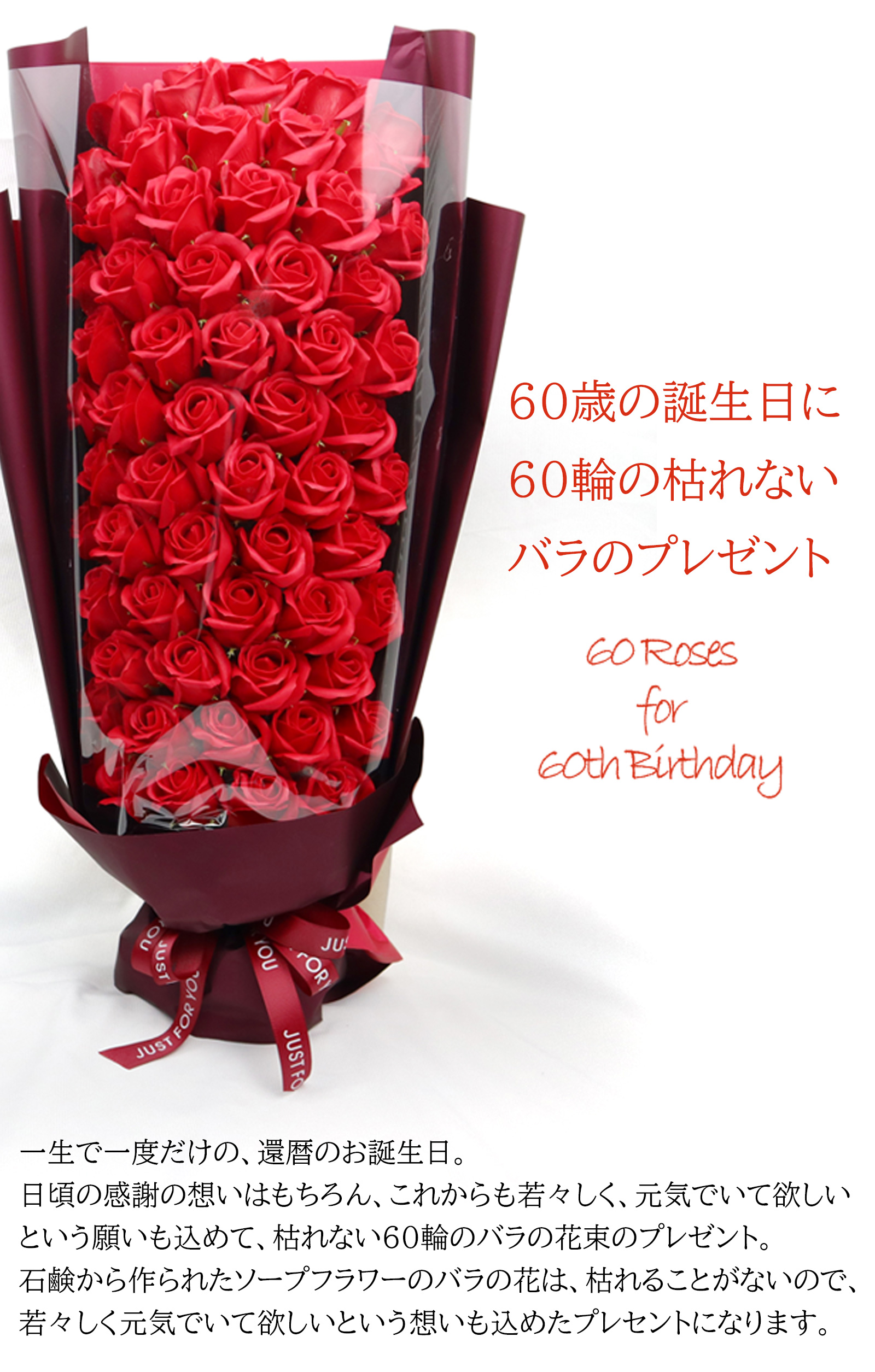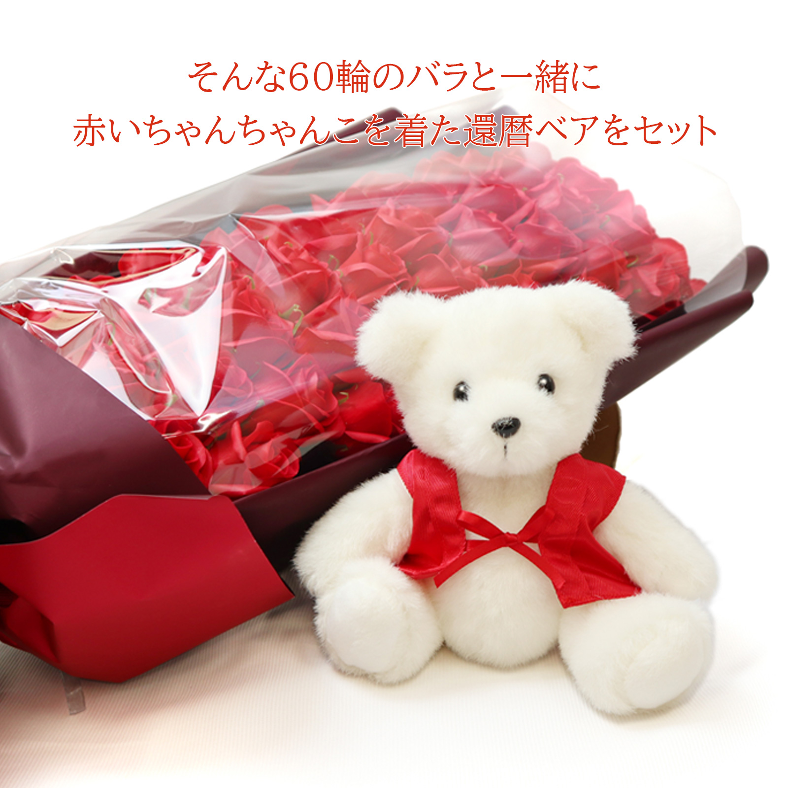 大口注文・法人のお問い合わせはこちら石鹸で出来ているので、枯れることのないソープフラワーでアレンジした60輪のバラの花束と、還暦のお祝いに赤いちゃんちゃんこを着た還暦ベアとのセットです。 お部屋に飾れば、優しいフレグランス・ソープの香りがお楽しみ頂けます。 ※観賞用の為、手洗いやお風呂に入れたり等の利用はしないでください。