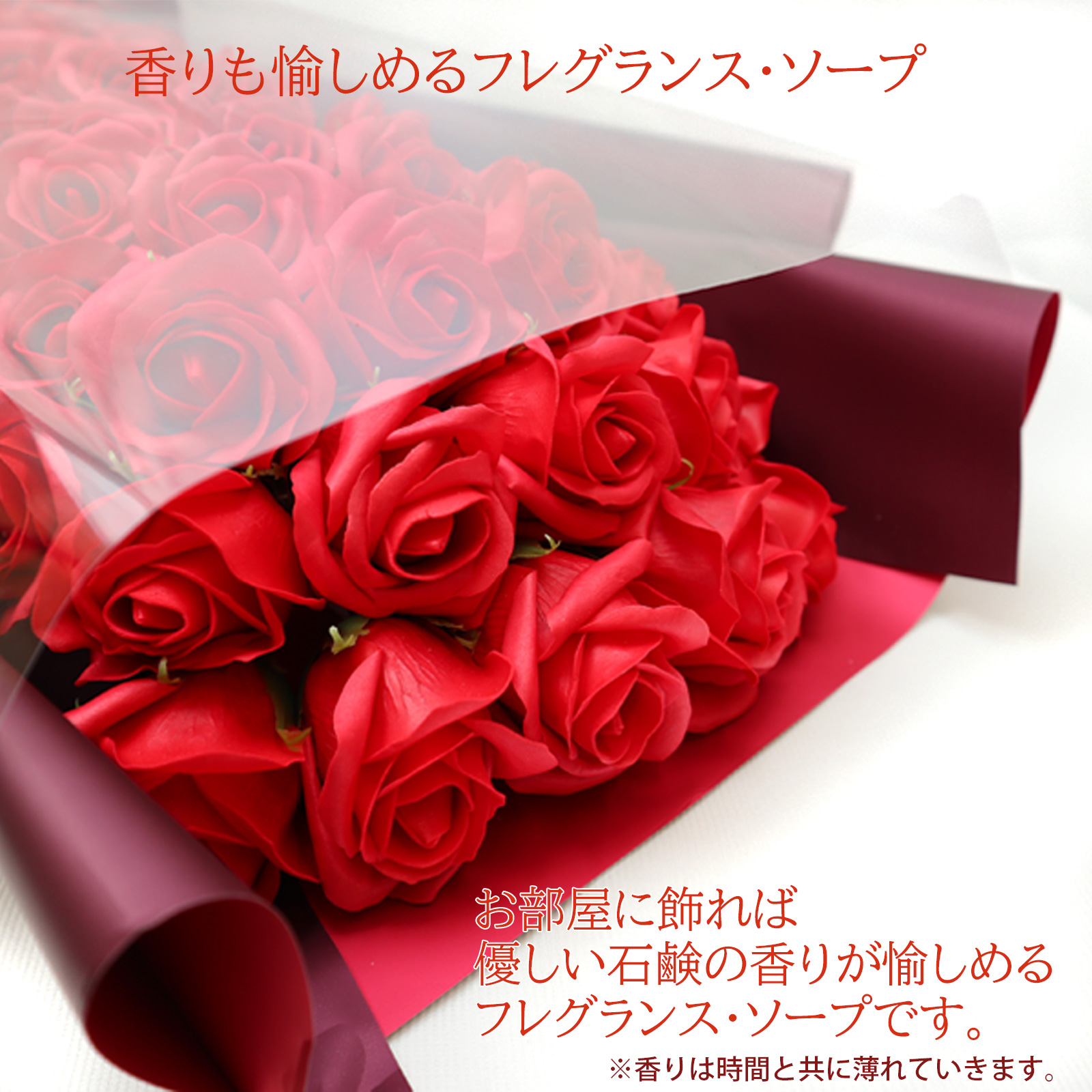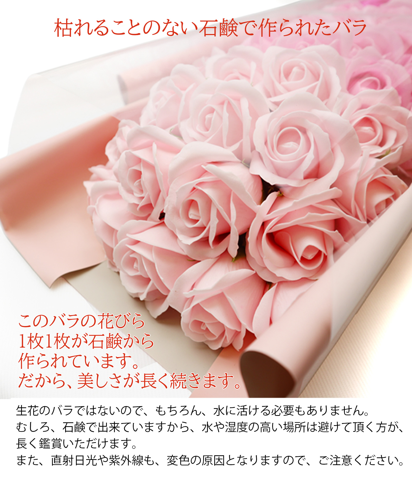 | 材質 | バラの花びらは石鹸素材で出来ています。 観賞用として作られた石鹸ですので、手洗いやお風呂に入れたり等の利用はしないでください。 また、熱や湿気、水分に触れると変形することがございますので、ご注意ください。 |