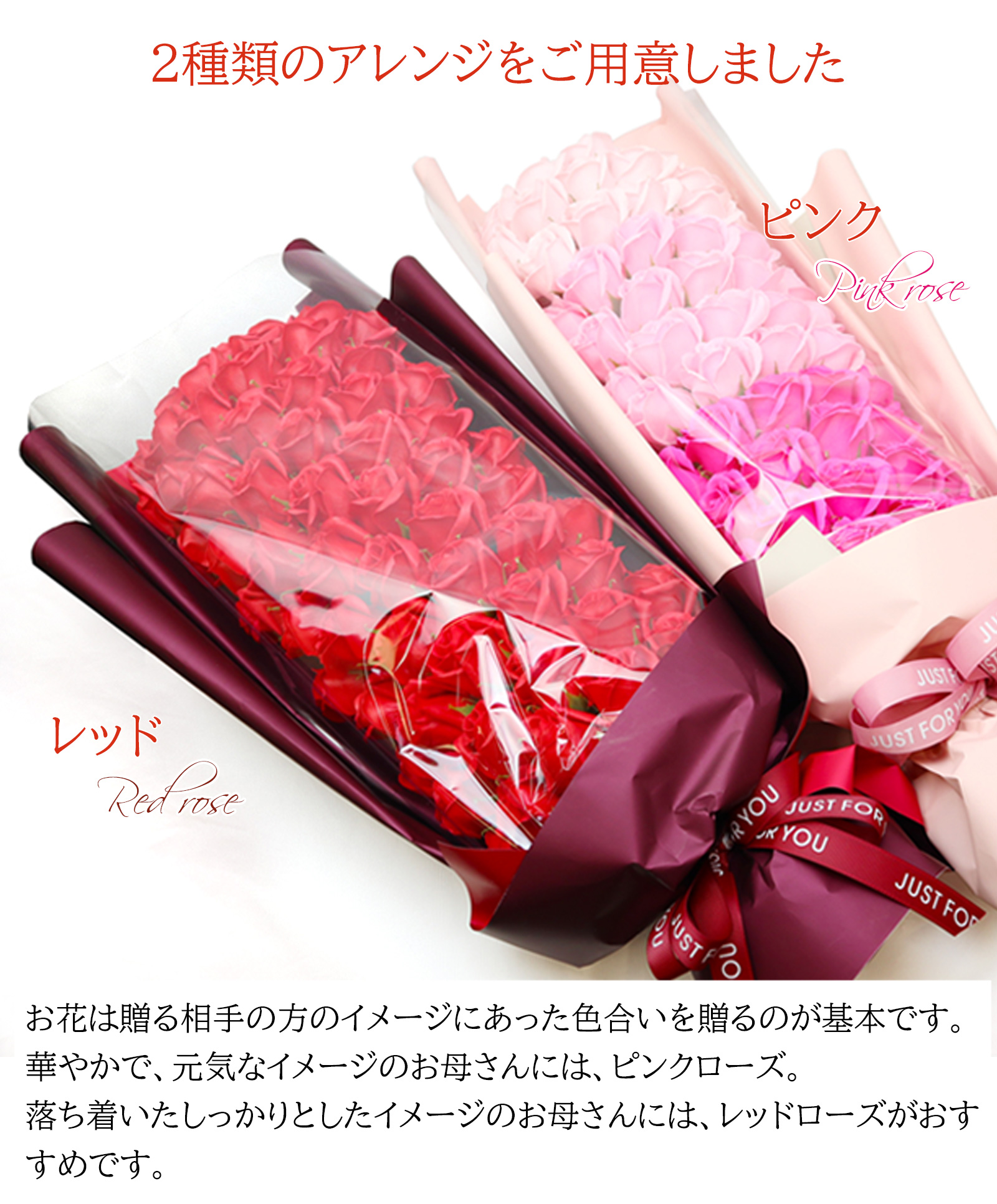 石鹸から作られたソープフラワーのバラの花は、枯れることがないので、若々しく元気でいて欲しいという想いも込めたプレセントになります。