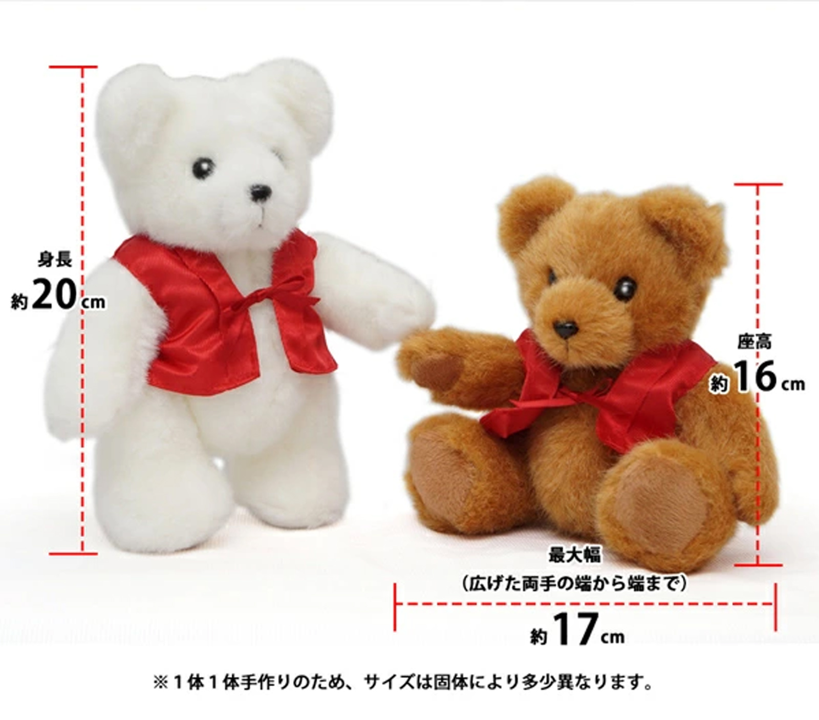 | サイズ | 〈還暦ベア 〉 足を伸ばした時:高さ約20cm、横幅約17cm ひとつひとつ手作りのため、サイズが若干異なる場合があります。 〈花束〉 高さ:約66cm、横幅:約20cm、奥行:約12cm(サイズには個体差があります) 〈ギフトボックス〉 長さ:約70cm、横幅:約22cm、奥行:約14cm |