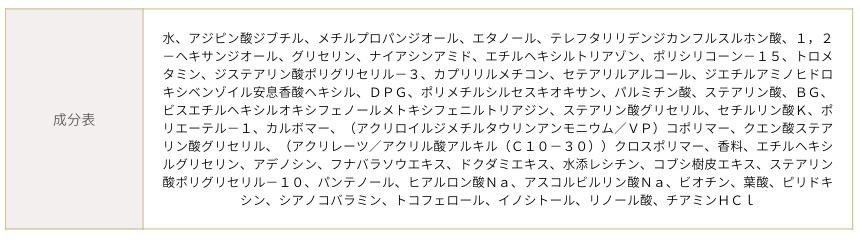 | ご使用上/安全上の注意 | お肌に異常が生じていないかよく注意して使用してください。化粧品がお肌に合わないとき即ち次のような場合には、使用を中止してください。そのまま化粧品類の使用を続けますと、症状を悪化させることがありますので、皮膚科専門医等にご相談されることをおすすめします。 (1)使用中、赤味、はれ、かゆみ、刺激、色抜け(白斑等)や黒ずみ等の異常があらわれた場合 (2)使用したお肌に、直接日光があたって上記のような異常があらわれた場合。傷やはれもの、しっしん等、異常のある部位にはお使いにならないでください。 |