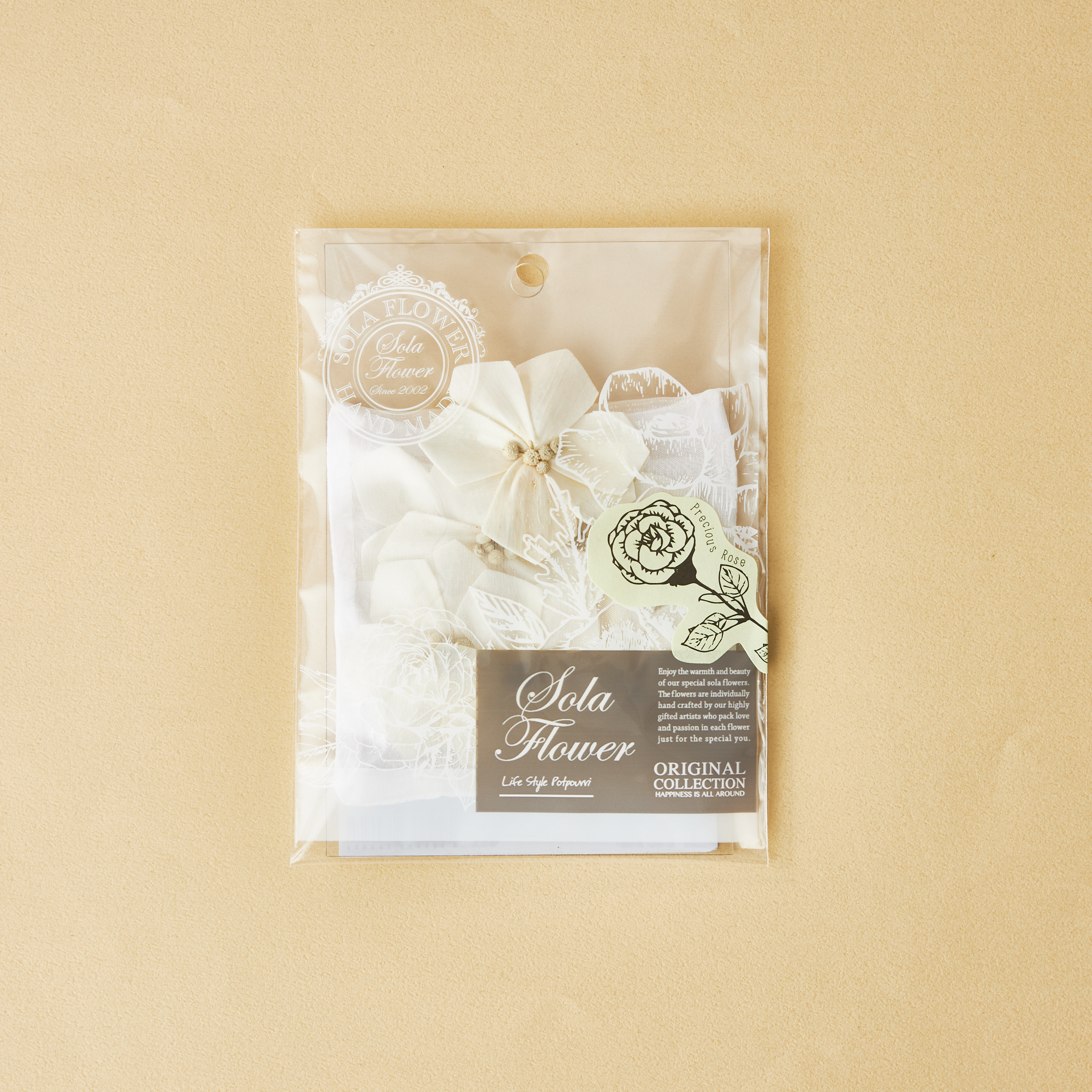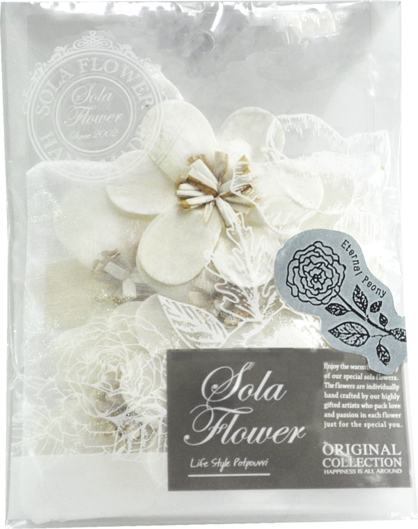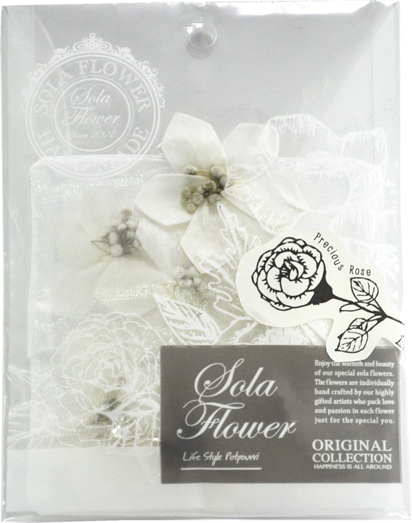 大口注文・法人のお問い合わせはこちらかつては水田に生える邪魔な雑草だったソラの木。しかし、米農家の方々の工夫と愛情により、美しいペーパーフラワー『ソラフラワー』へと生まれ変わりました。この美しさを小さなオーガンジーの袋に詰めたサシェは、紐付きでどこでも飾れる逸品です。クローゼットやお部屋で、その魅力を感じてください。