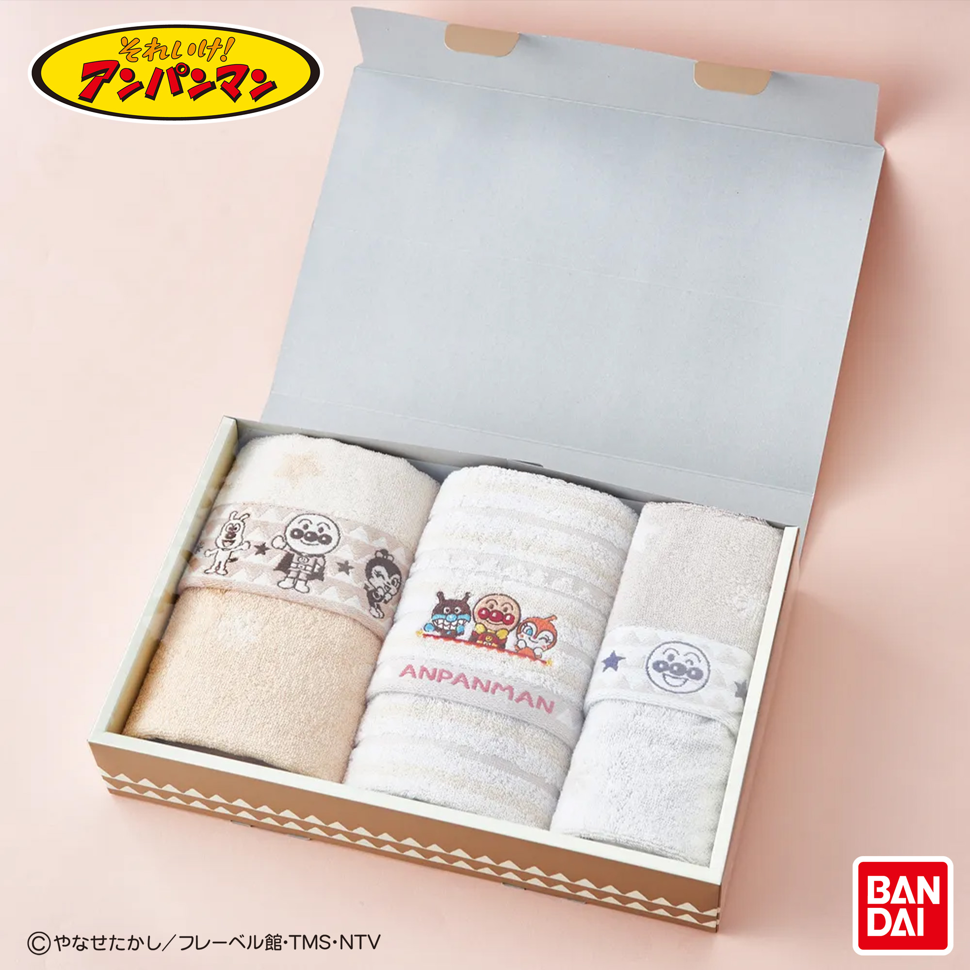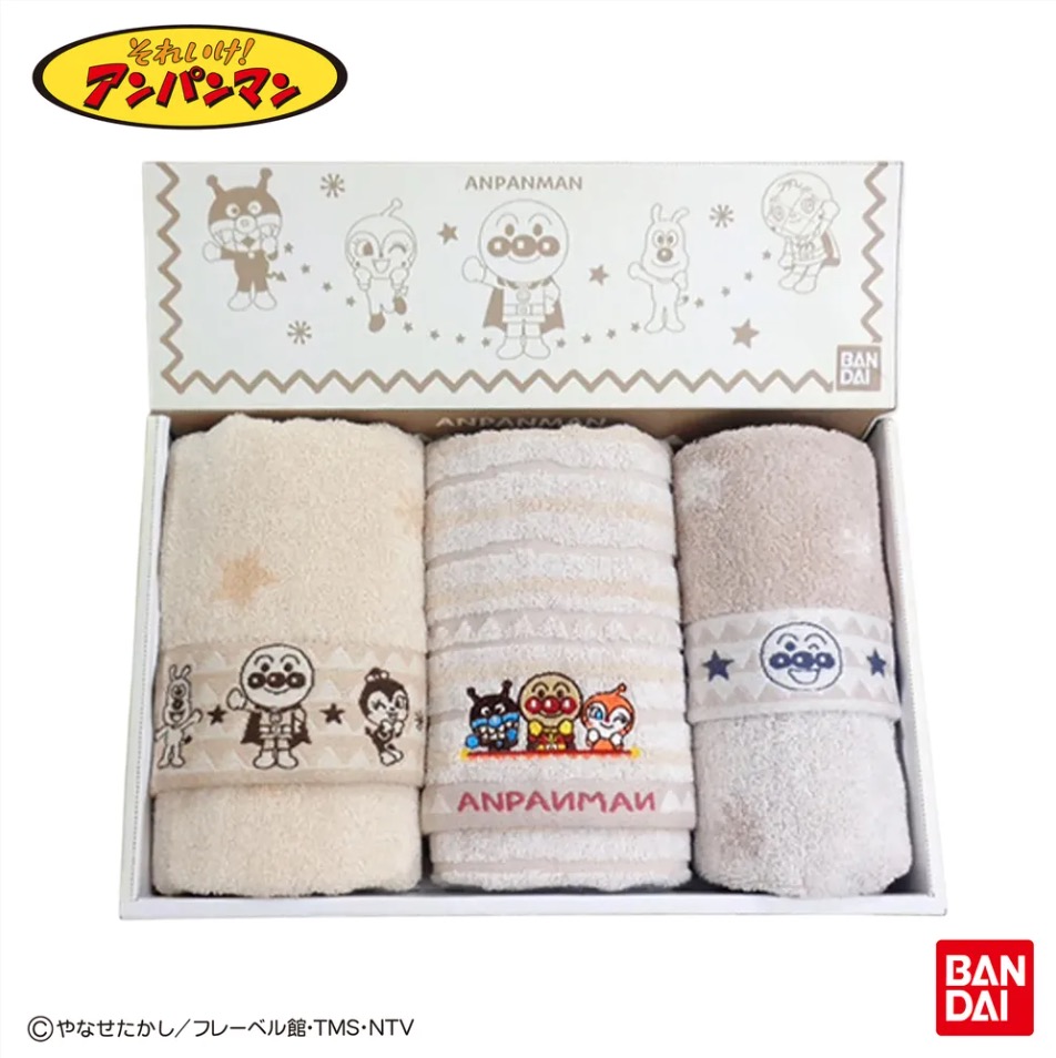 大口注文・法人のお問い合わせはこちら1975年に発売された「それいけ!アンパンマン」から幼児たちの心を掴み続けているアンパンマン。この可愛らしいキャラクターを活かしたタオルシリーズが登場しました。 『アースカラー』と名付けられたベージュを基調とした落ち着いたデザインのタオルギフトセットは、出産、入園、入学などの特別なお祝いにぴったり。さまざまな用途に合わせたパッケージもご用意しています。