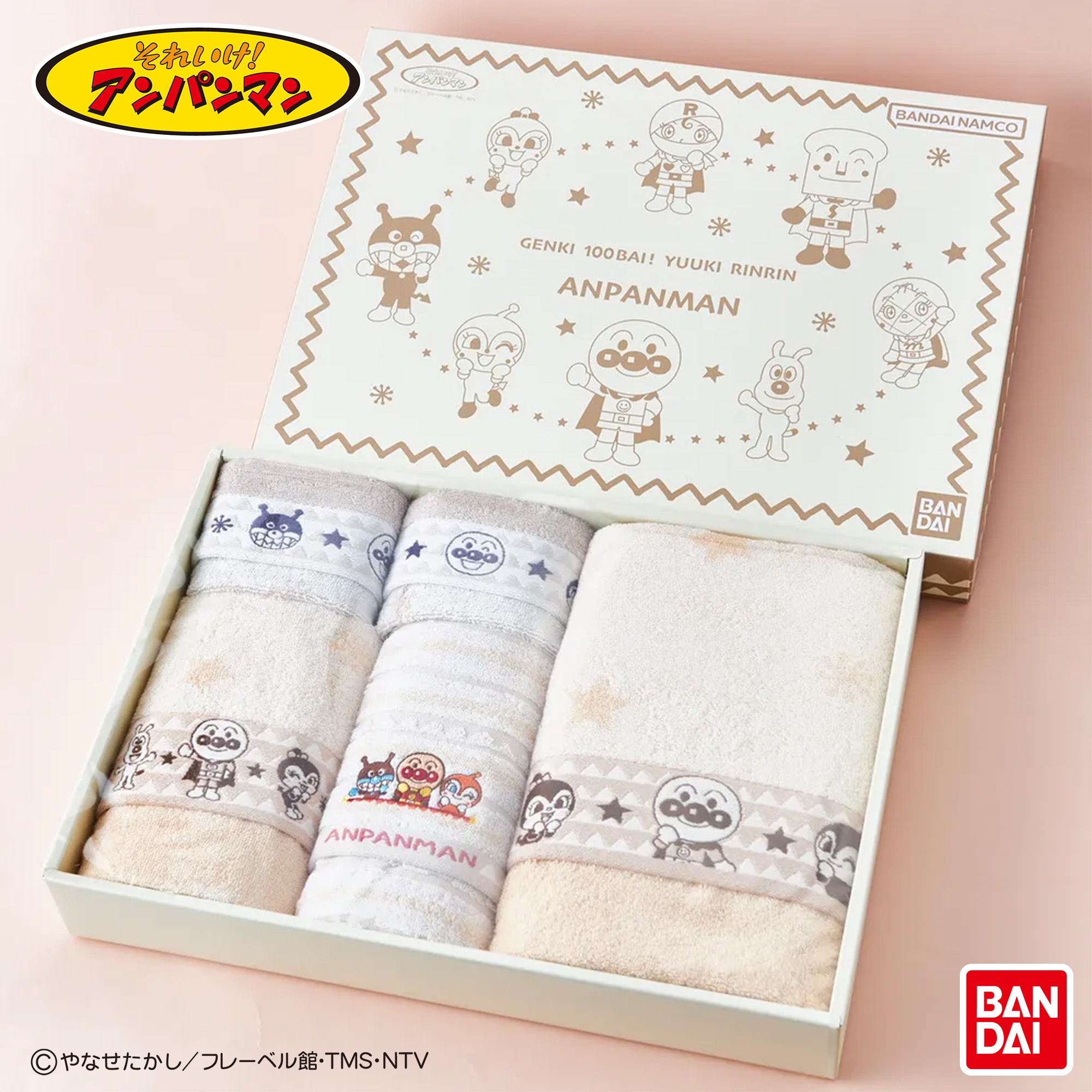 ベージュを基調にした落ち着いた色合いの「アースカラー」バスタオル1枚とフェイスタオル2枚、ハンドタオル2枚のセット。幼児たちの心を掴み続けている『それいけ!アンパンマン』の魅力が詰まったタオルシリーズです。