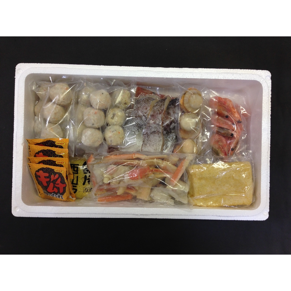 | 内容量/数量 | 白菜キムチ100g×4、ボイル海老12尾、ボイル帆立6個、ゆでずわいがにカット200g、かに入つみれ6個、えび入つみれ6個、とりごぼうつみれ6個、ツボ抜きいか100g×2、油揚げ2枚、助宗鱈切身40g×3、冷凍生ラーメン80g×1、たれ(濃縮:キムチ仕立て)30g×4※3~4人前 |