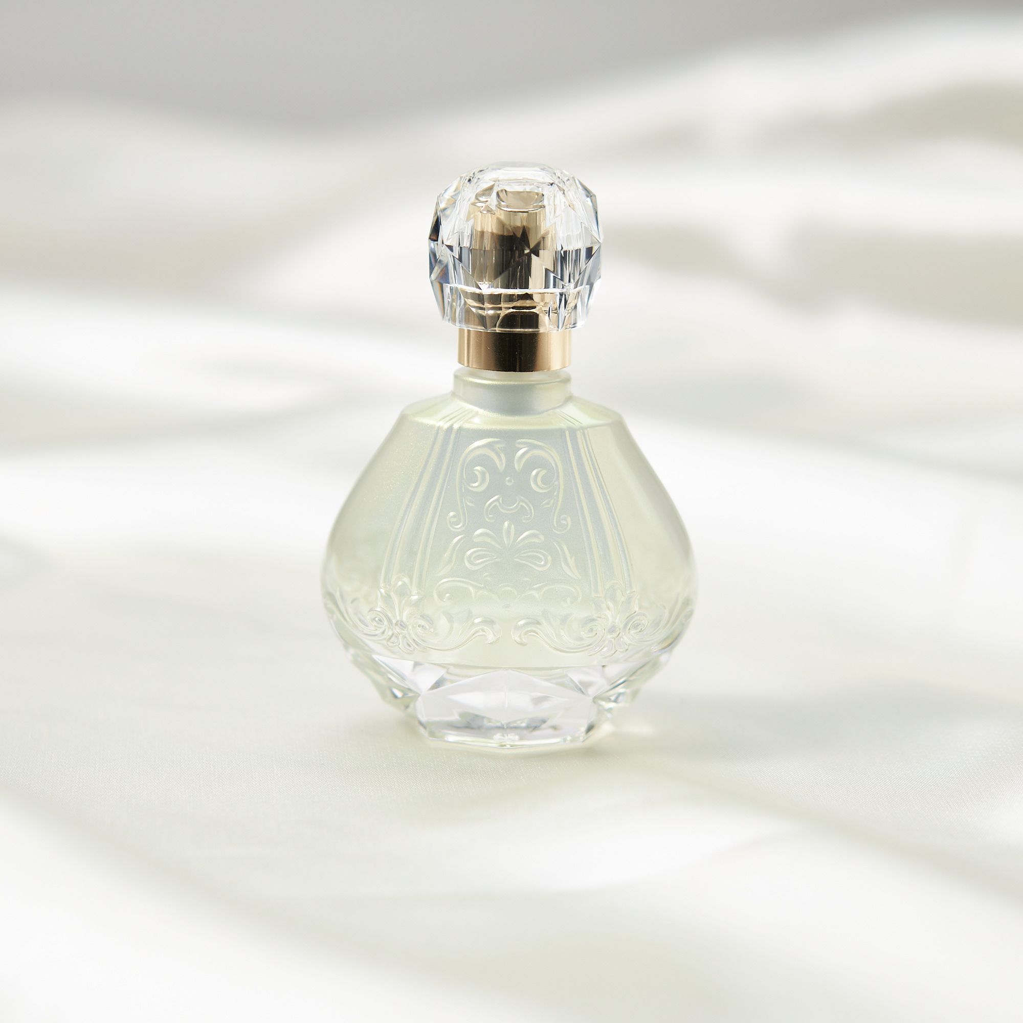 大口注文・法人のお問い合わせはこちら優しいフローラルブーケにアップルフラワーやローズの香りを閉じ込めた、華やかで周りをふんわり包み込むような温かみのある香り。 ボトルデザインは「描く幸せ」をテーマに、美術品のように優雅な重厚感がありつつも、ゆらめく美しい曲線につながるように細かいカッティングをあしらった、柔らかさときらめきが融合したデザイン。