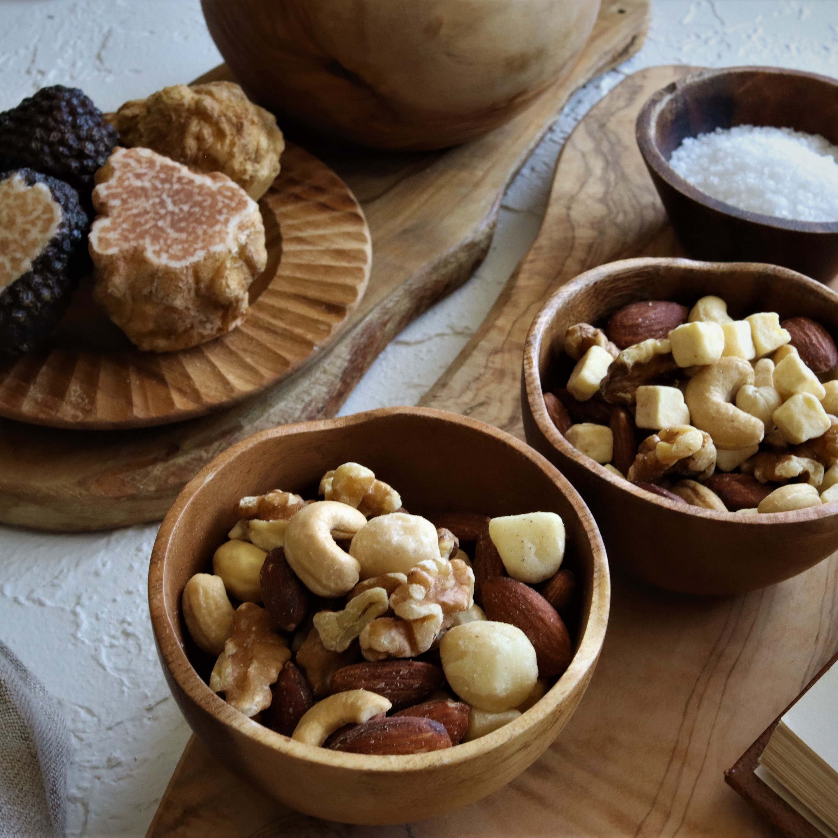 パッケージを開けた瞬間に広がる芳醇な黒トリュフの香りをお楽しみいただくため、トリュフの本場フランスよりゲランド産黒トリュフ塩を使用。アーモンド、カシューナッツ、マカデミアナッツ、くるみの4種のナッツがお楽しみいただけます。 トリュフの旨味を引き立たせるため、上質なトリュフ入りエキストラヴァージンオリーブオイルで味付けしたミックスナッツは、ちょっとリッチな午後のスナックにおすすめです。