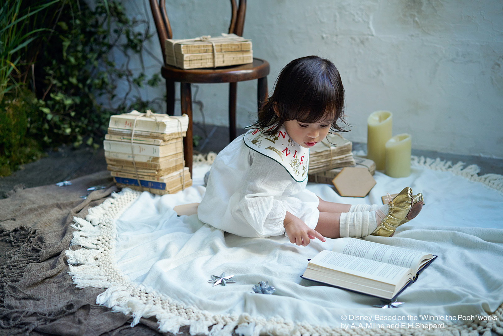 本を読んだり、ハチミツをとりに行ったり。傘に乗って水たまりに浮かんだり、靴を履くのを助けたり、共に悩んだり。何気ない日常や、ワクワクするような冒険の日々をスタイいっぱいに散りばめました。