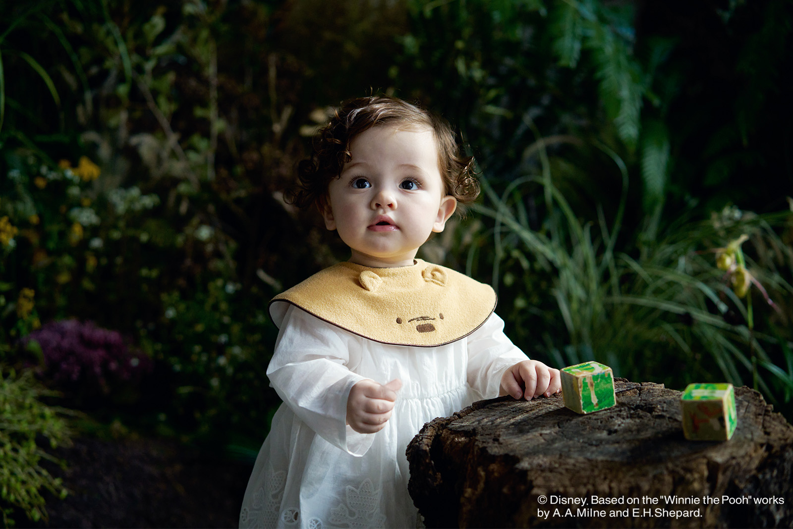 「MARLMARL(マールマール)」が贈る今年のホリデーコレクションClassic Poohをモチーフにしたスタイ。首元からプーさんのお顔がのぞいているようなチャーミングなスタイで、見た目にもベビーの肌にも優しい1枚です。