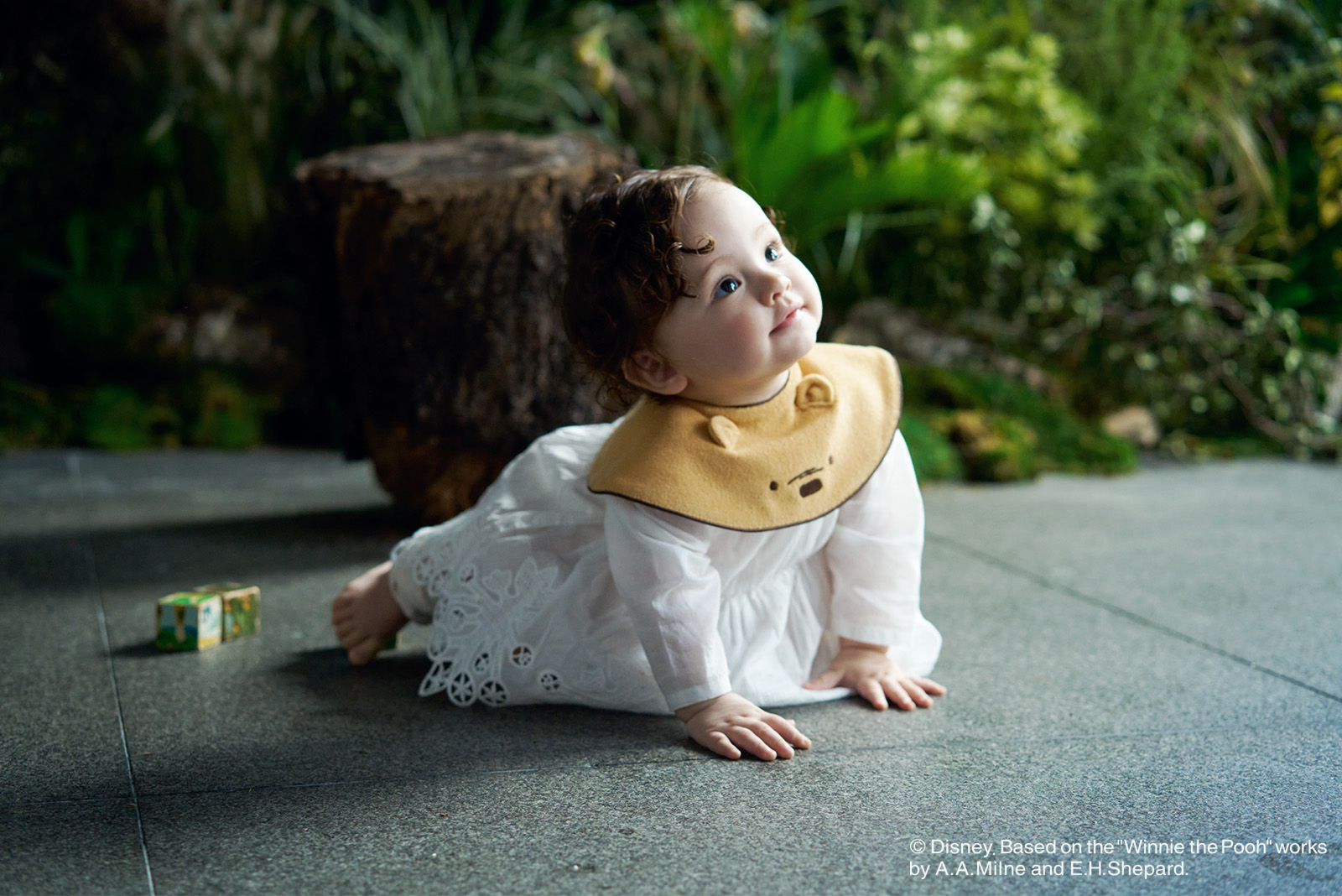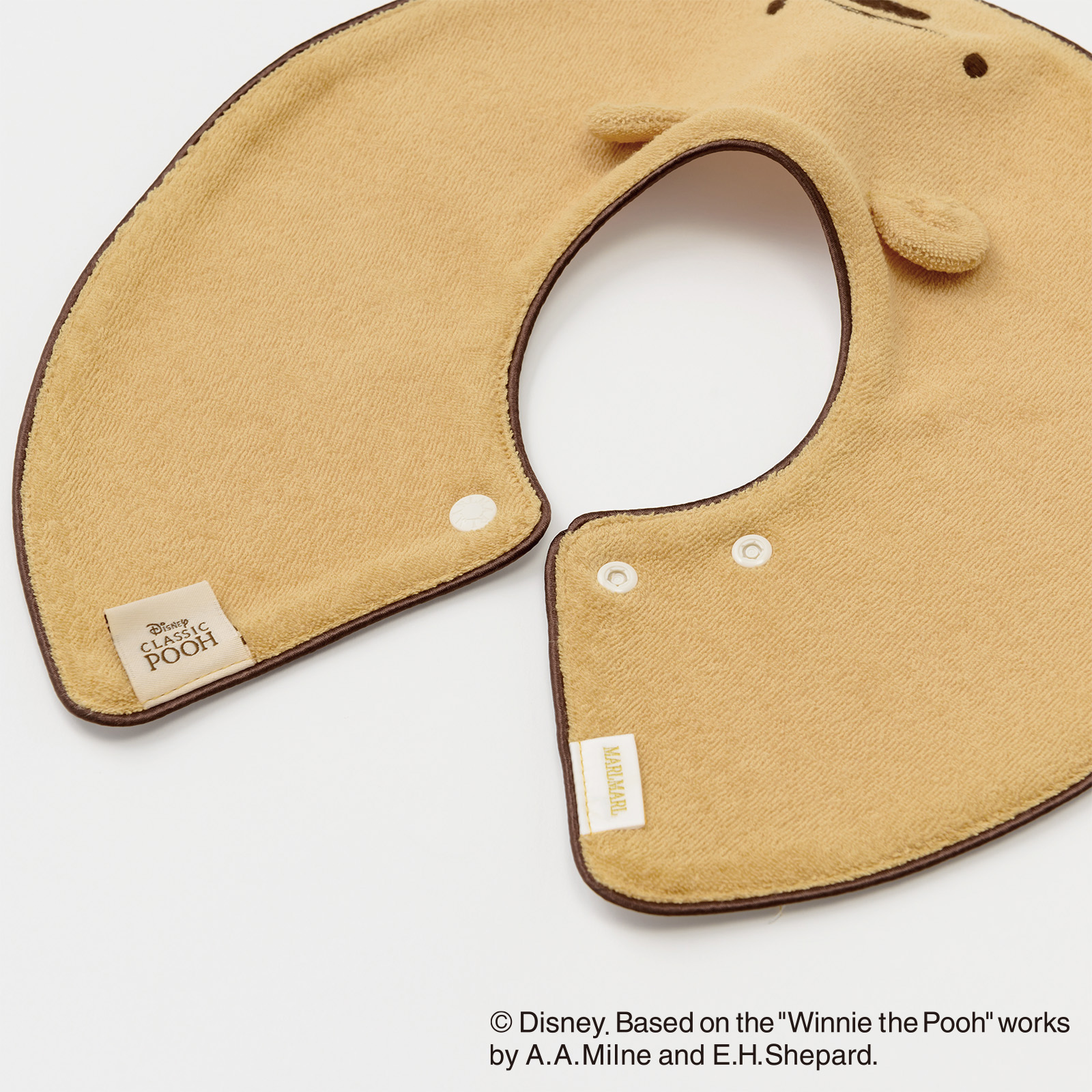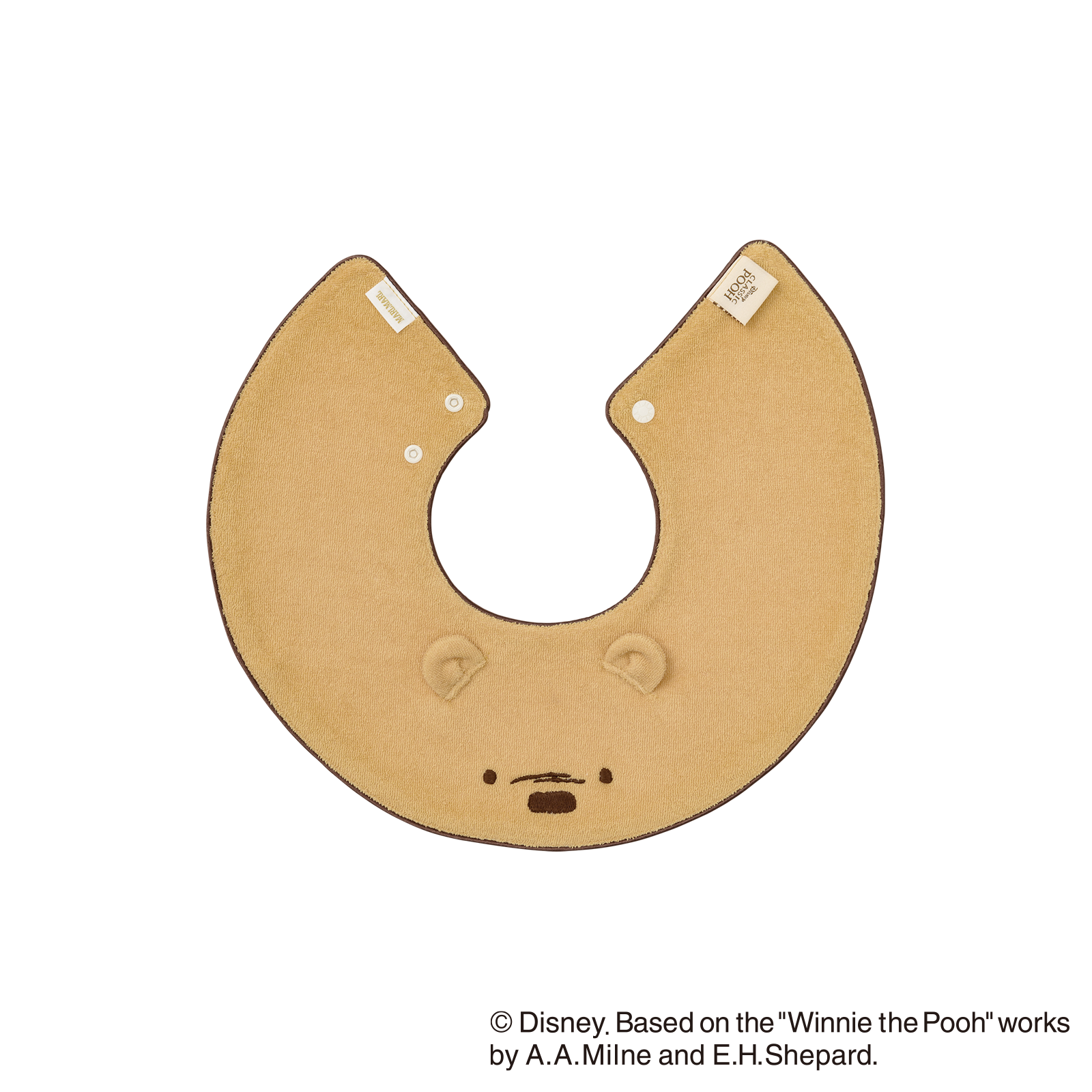 大口注文・法人のお問い合わせはこちらお出かけするベビーを見守るように、首元からプーさんのお顔がのぞいているようなチャーミングなスタイ。温もりのあるイエローのパイル地は綿100%で、見た目にもベビーの肌にも優しい1枚です。