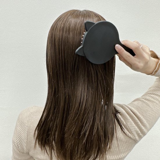 大口注文・法人のお問い合わせはこちら耳がついた黒ネコみたいなコンパクトヘアブラシはクッションがやわらかく、地肌に優しくヘアケアできます。 持ち手はすべりにくく、とても使いやすいヘアブラシです。