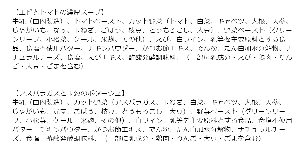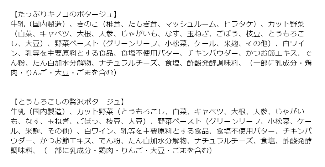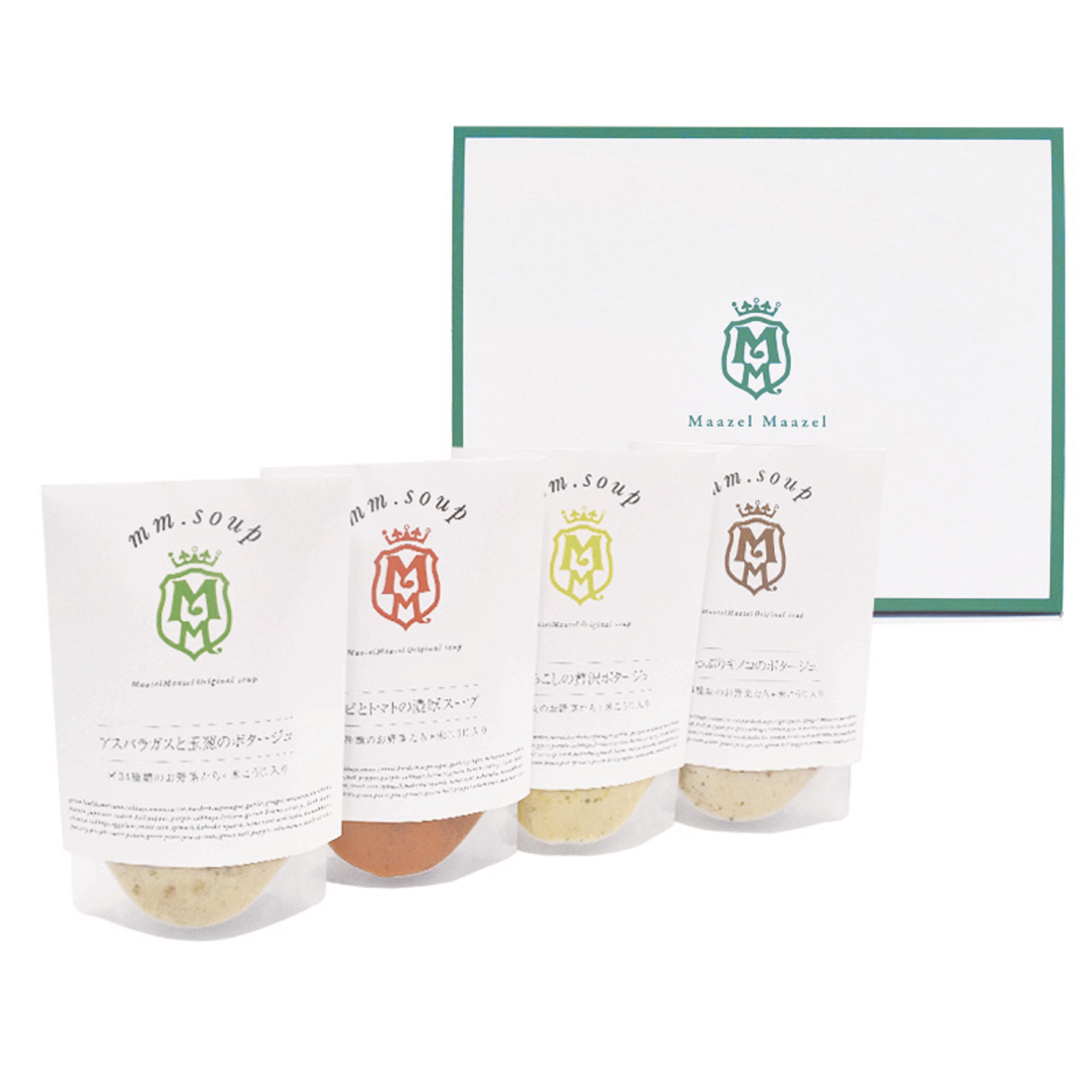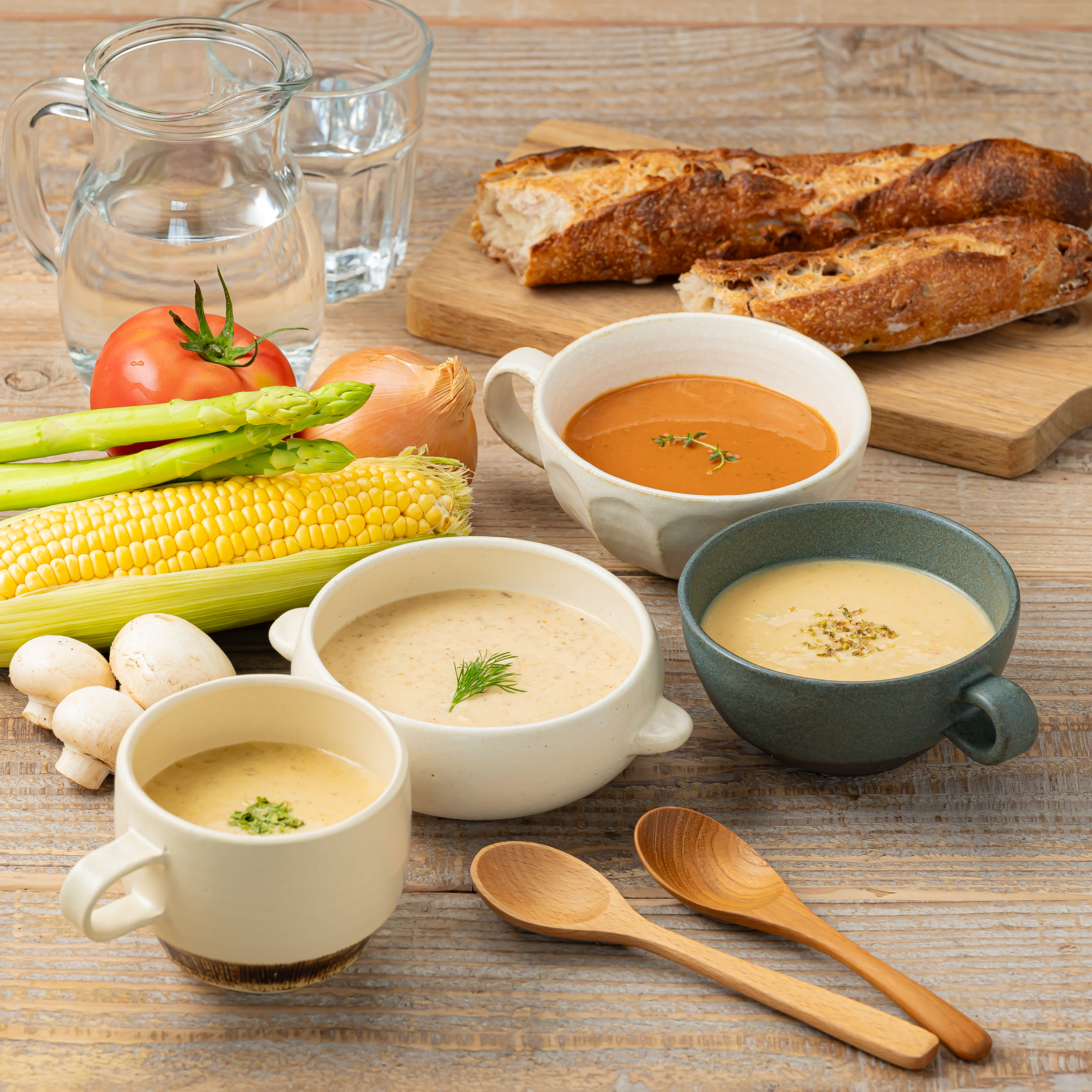 | 内容量/数量 | ・たっぷりキノコのポタージュ ・とうもろこしの贅沢ポタージュ ・エビとトマトの濃厚スープ ・アスパラガスと玉葱のポタージュ 各180g×1 (M24MA4PD) |