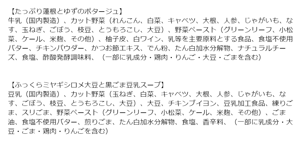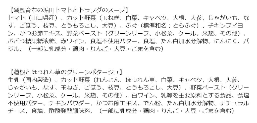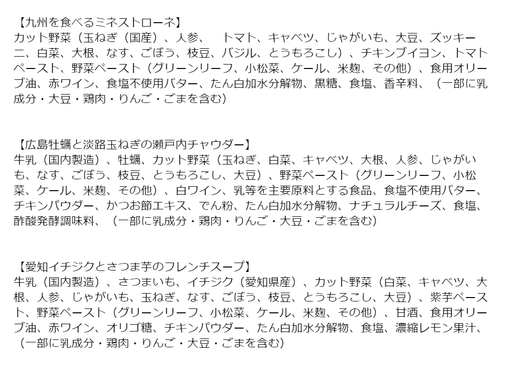 ・潮風育ちの垢田トマトとトラフグのスープ ・蓮根とほうれん草のグリーンポタージュ ・たっぷり蓮根とゆずのポタージュ ・ふっくらミヤギシロメ大豆と黒ごま豆乳スープ ・九州を食べるミネストローネ ・広島牡蠣と淡路玉ねぎの瀬戸内チャウダー ・愛知イチジクとさつま芋のフレンチスープ