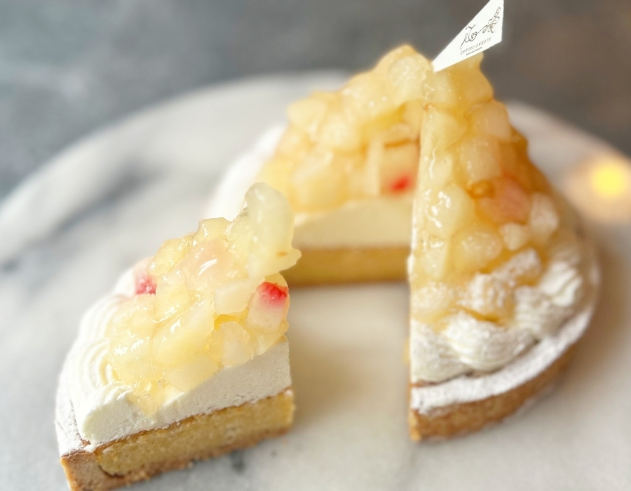 桃色が混じる白桃だけを、贅沢にデコレーションしました。 ホワイトと淡い桃色のグラデーションが美しい、手仕事で丁寧に作るおいしさをぜひお召し上がりください。
