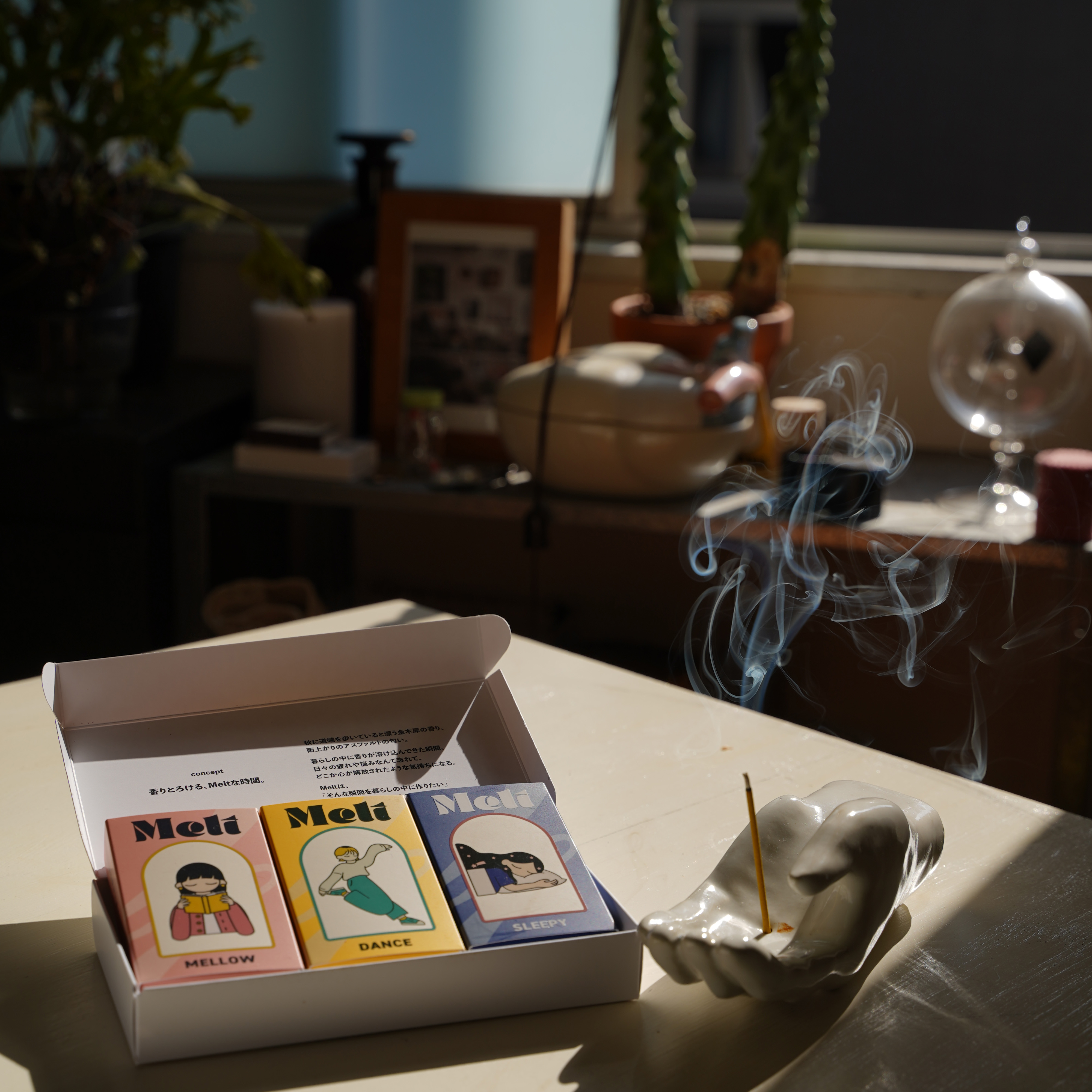 Meltでは、「とろけるような香り」にこだわっています。 日本古来より受け継がれる香文化を土台に、洋風のフレグランスの香りを重ねることで、どこか懐かしく、それでいて現代的なMeltらしい香りを生み出しています。