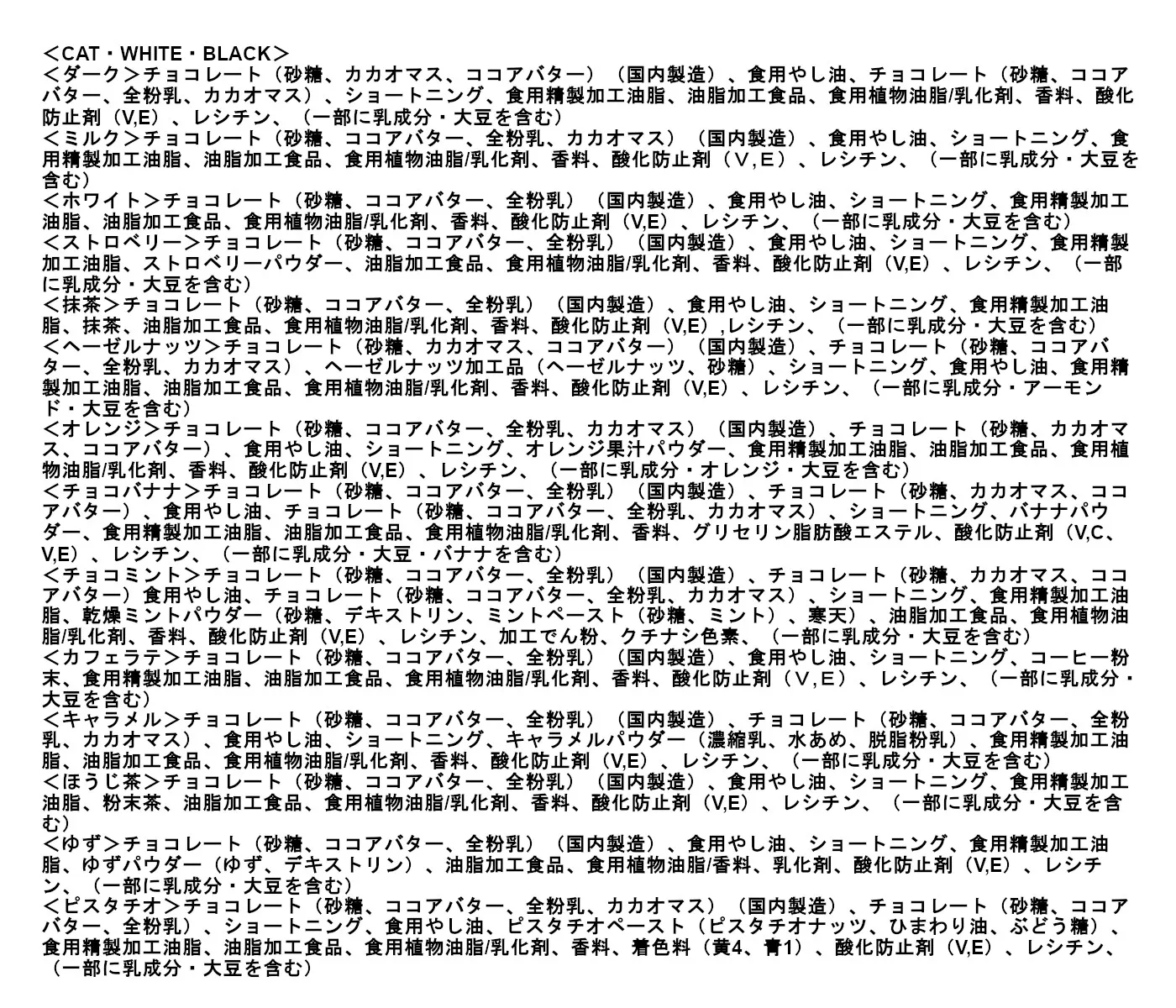 〈切り絵作家・魚谷彩さんとのコラボパッケージ〉 切り絵とは思えない繊細かつ大胆な毛並み、 ジッと見つめる猫の眼差しが印象的。 14フレーバー×1個 : ダーク、ミルク、ホワイト、ストロベリー、抹茶、ヘーゼルナッツ、チョコバナナ、チョコミント、オレンジ、キャラメル、カフェラテ、ほうじ茶、ゆず、ピスタチオ