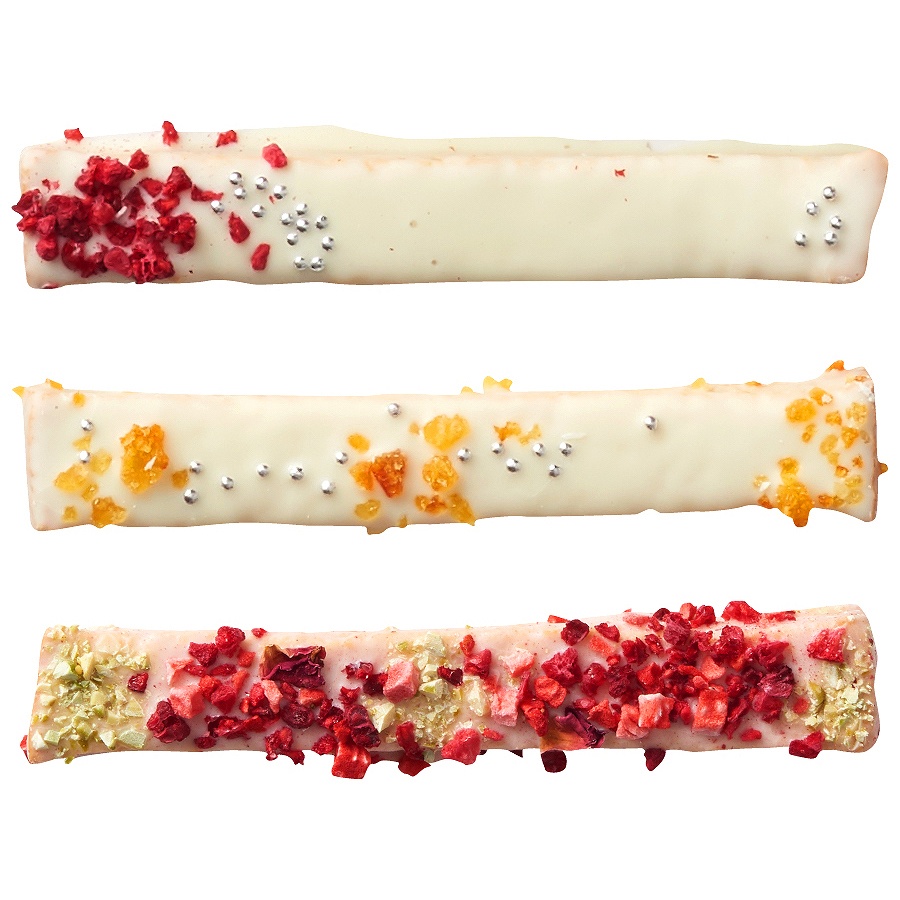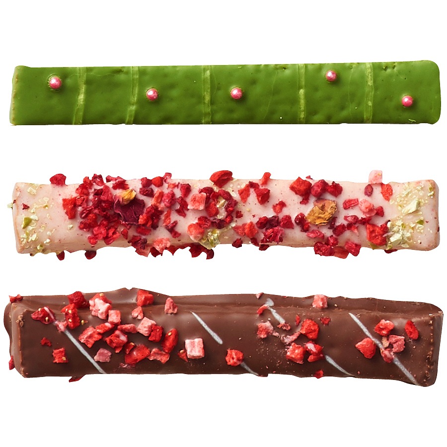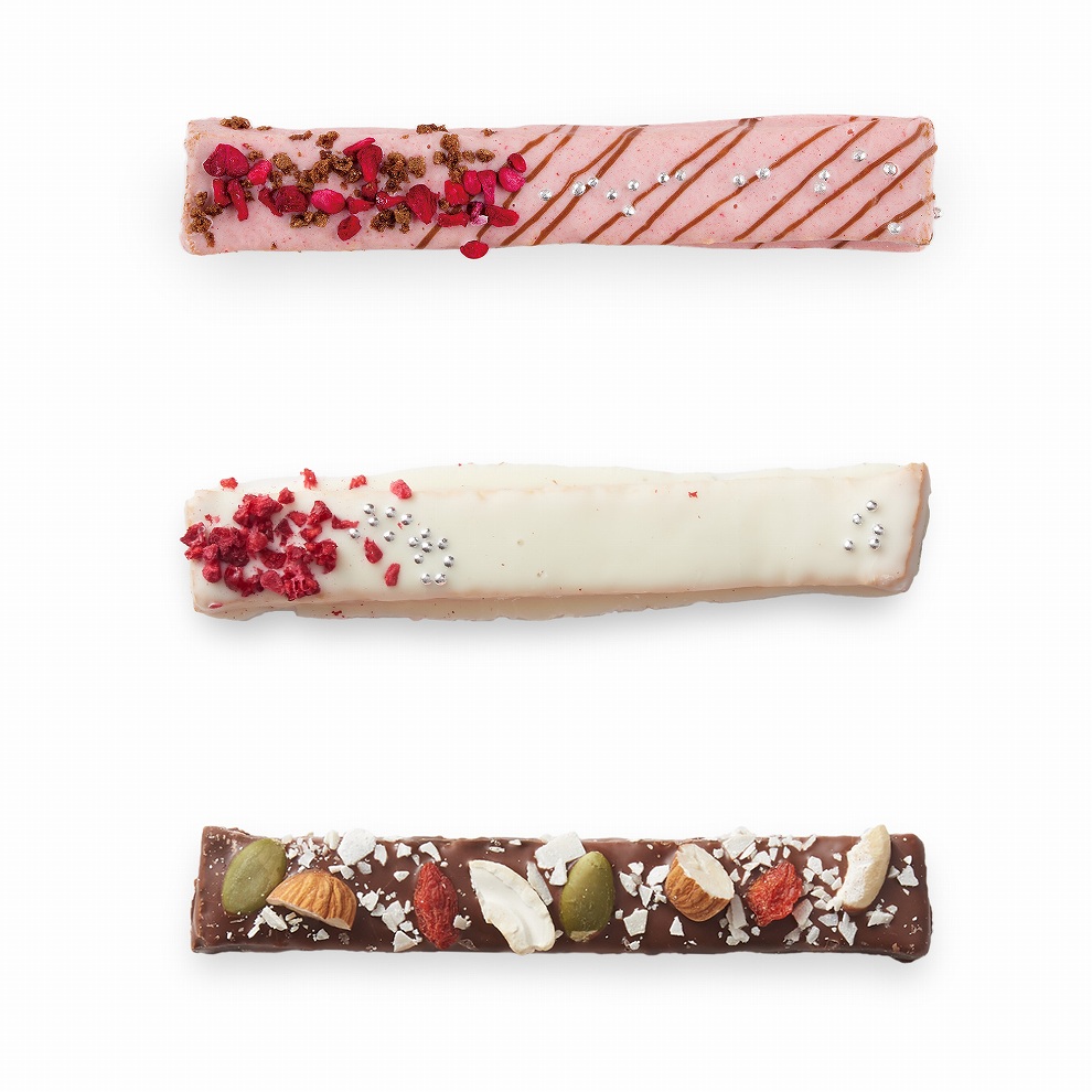 可愛くトッピングしたキラキラのピンクチョコレート、香ばしいナッツとお花を散らばせたデコレーションの3本入り。 フレーバーはストロベリーピンクチョコ、ラズベリーホワイトチョコ、ナッツミルクチョコの3種をご用意しました。