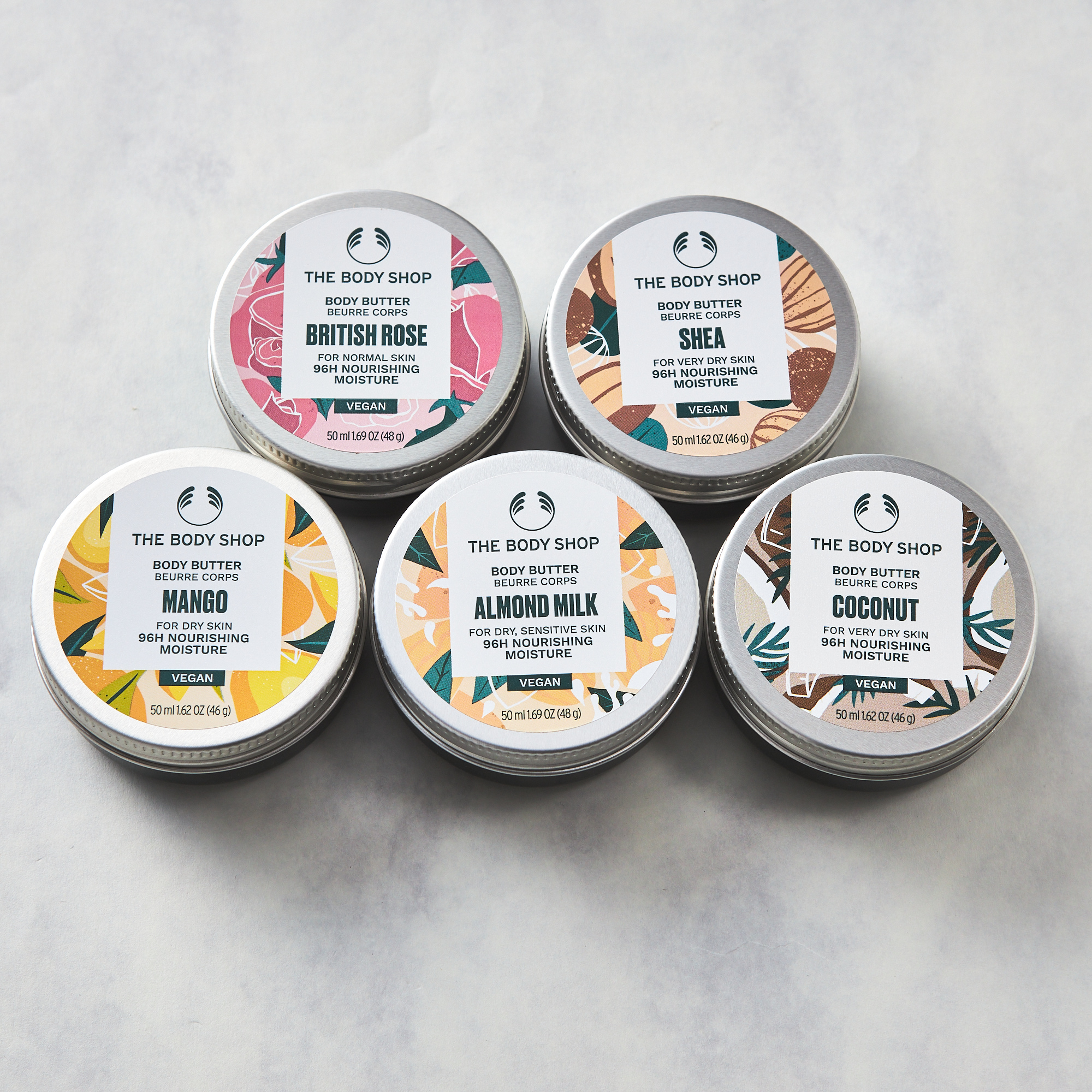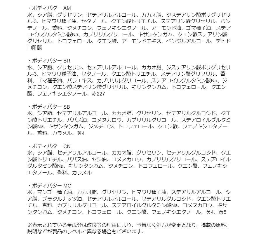 ・ボディバター AM 50mL(ボディクリーム) ・ボディバター BR 50mL(ボディクリーム) ・ボディバター SB 50mL(ボディクリーム) ・ボディバター CN 50mL(ボディクリーム) ・ボディバター MG 50mL(ボディクリーム) ・ギフトボックス サイズ(約):縦22.5cmx横23cmx高さ3.3cm