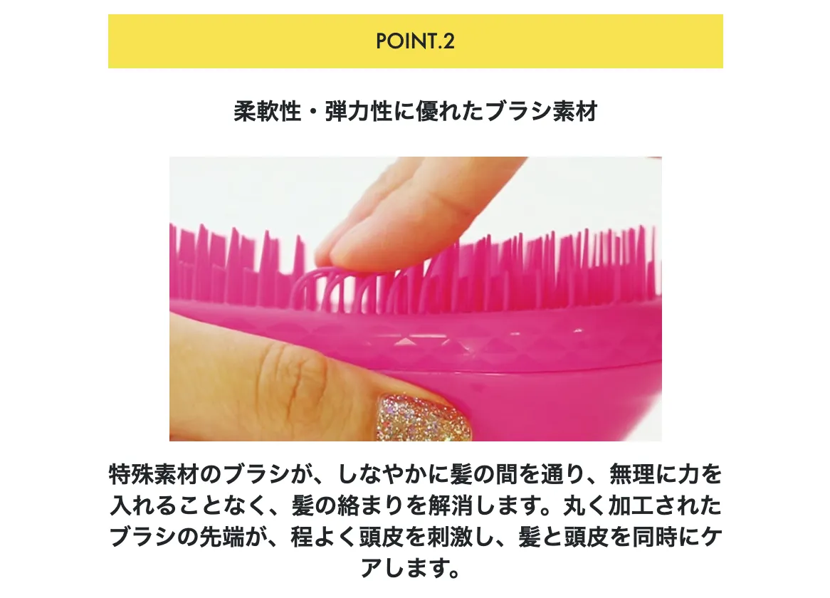 ブラシの毛は熱可塑性ポリエーテルエステルエラストマーという柔軟性に優れた素材のため、しなやかに髪の間に入り込み、髪を痛める心配がありません。キューティクルを整える長短交互の2段配列にはツヤ出し効果もあり、髪に優しい作りのブラシは小さなお子様の髪の毛にも優しく使えます。