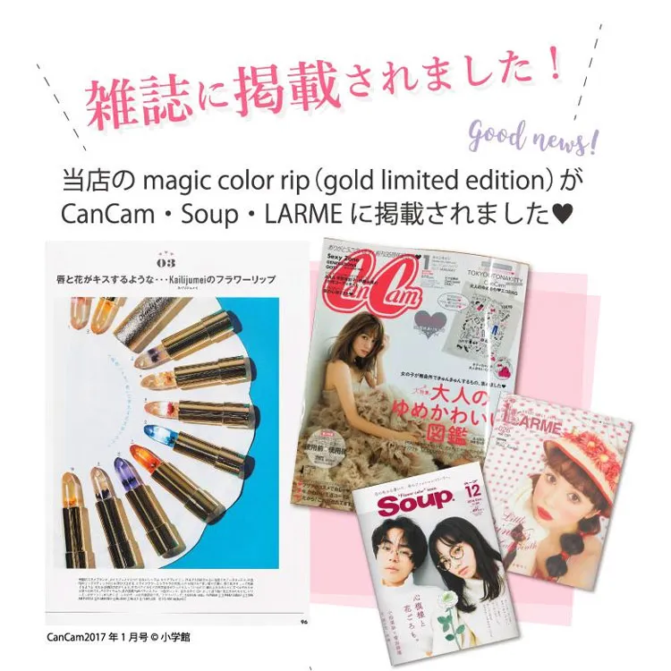 kailijumeiのリップは雑誌やテレビなど、様々なメディアで紹介されています。トレンドをおさえたギフトでお相手様も喜ぶこと間違いなしです。