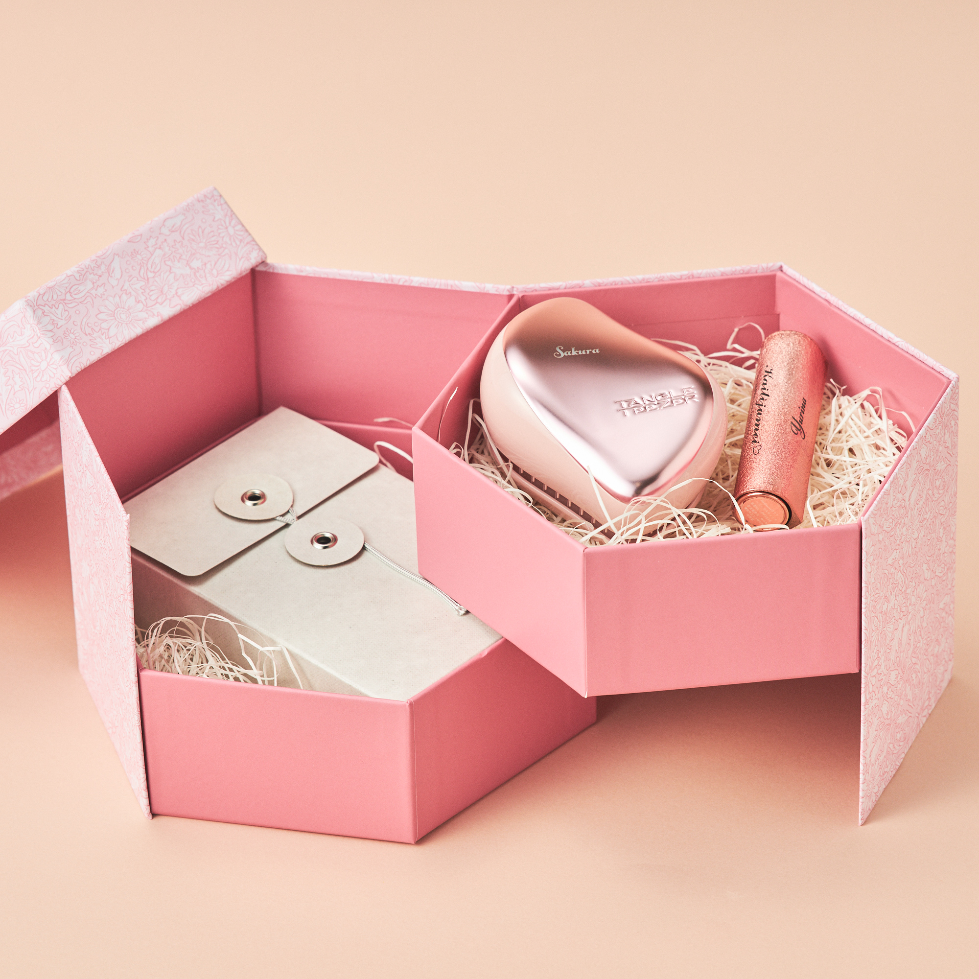 大口注文・法人のお問い合わせはこちらティントリップなので色落ちしにくく、自分だけの色に染まるフラワーリップとヘアブラシ、「HAA for bath」をプチギフトとして小箱に詰めた入浴剤。 3アイテムの美の贅沢をたくさん詰め込んだタンプ限定のギフトボックスです。 サプライズにぴったりな二段式のギフトボックスにラッピングしてお届けいたします。