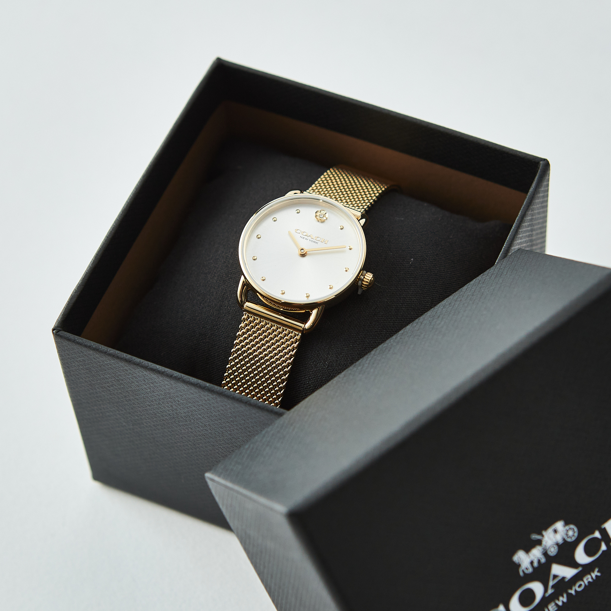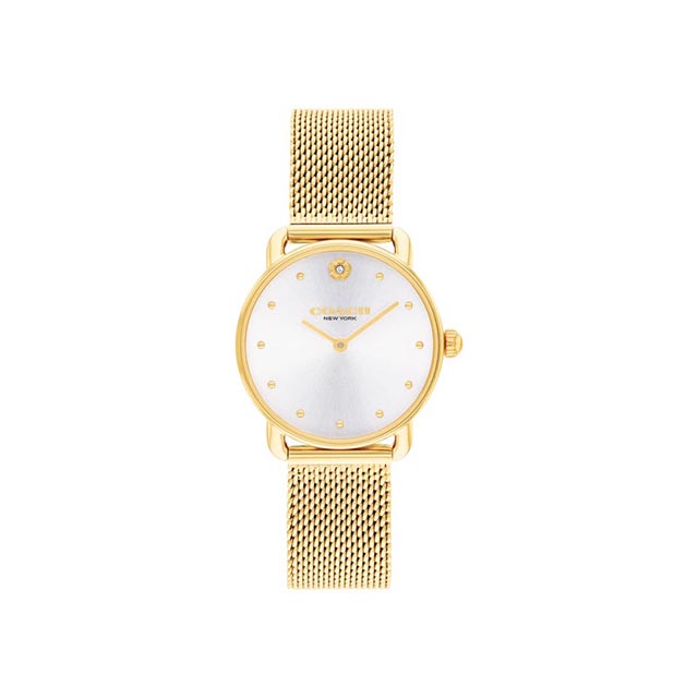 大口注文・法人のお問い合わせはこちらクリーンなラインとモダンなミニマリストの感覚を備えたエリオットは、仕事や週末にぴったりの本物のデザインクラシックです。 スリークなメッシュブレスレットで仕上げられたこのゴールドトーンのラウンドウォッチは、ホワイトのサンレイダイアルにドーム状のマーカーと12時の位置にはコーチのティーローズのモチーフがディテールされています。 ゴールドトーンのケースとメッシュブレスレットが特徴です。
