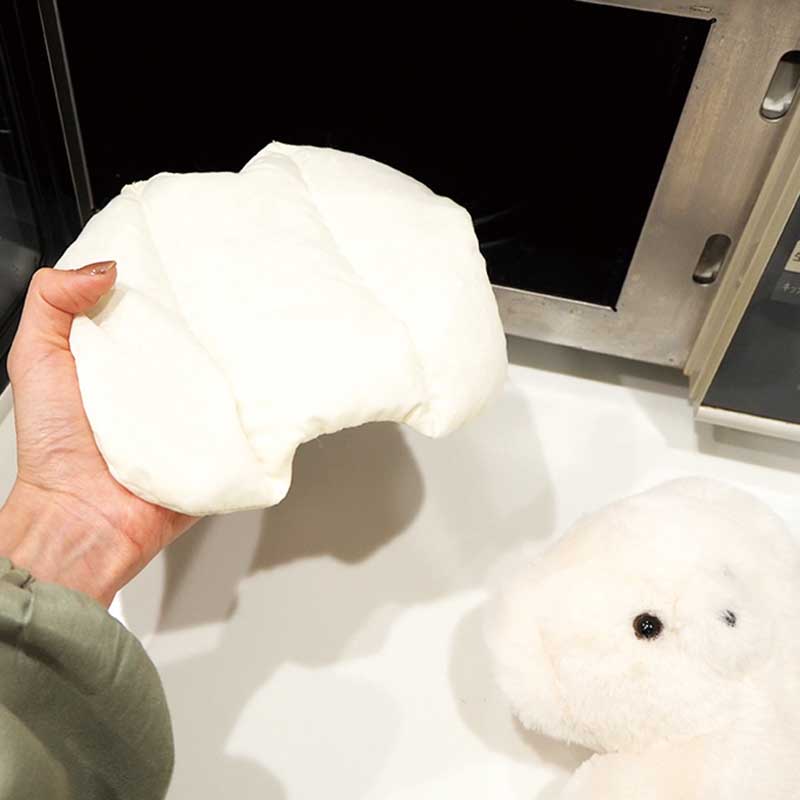 取り出した保温剤を耐熱皿などにのせて、レンジでチンして使います。くまのカバーは手洗いも可能。清潔に、繰り返し使うことができるエコなアイテムです。 ※画像はテディウォーマーLの保温剤です。