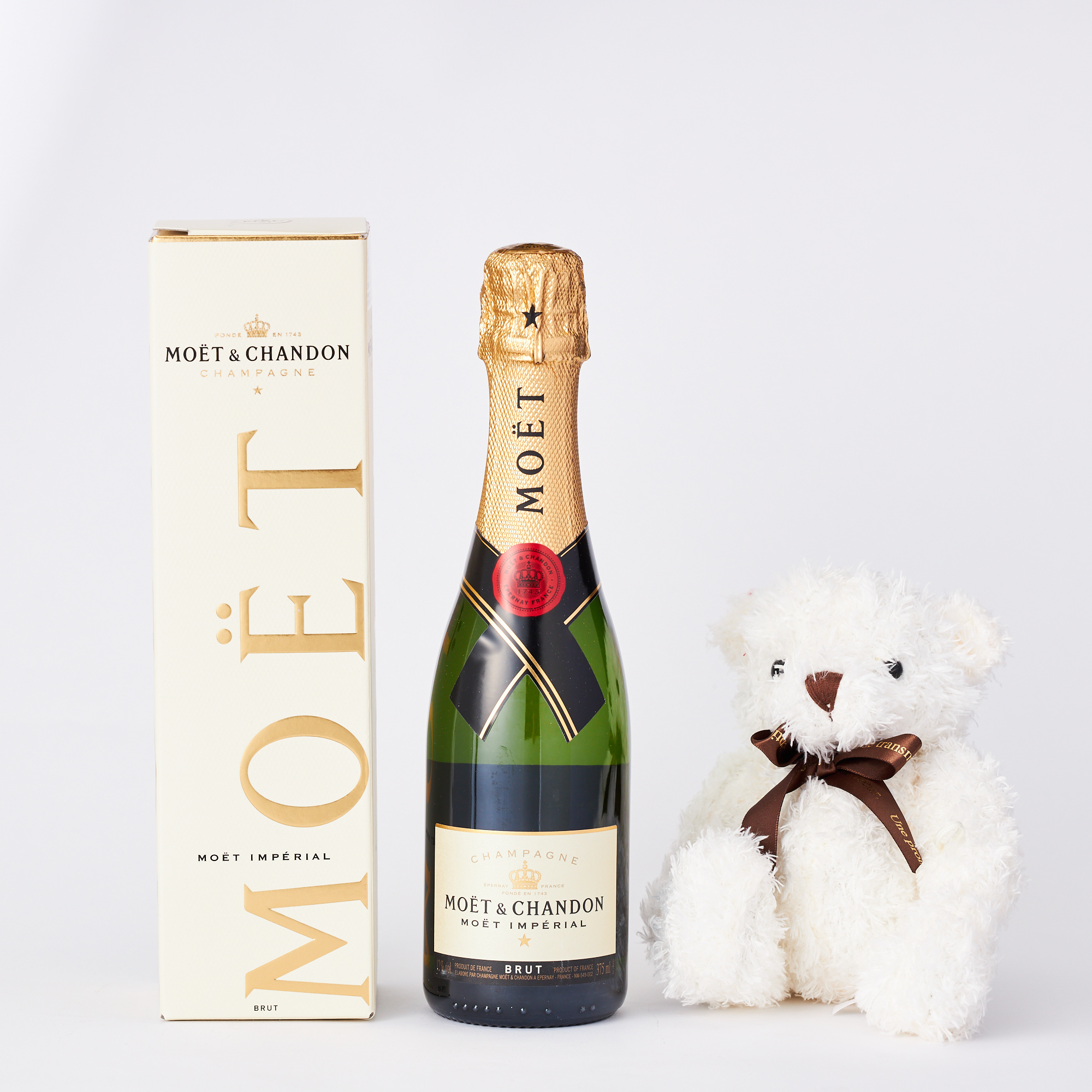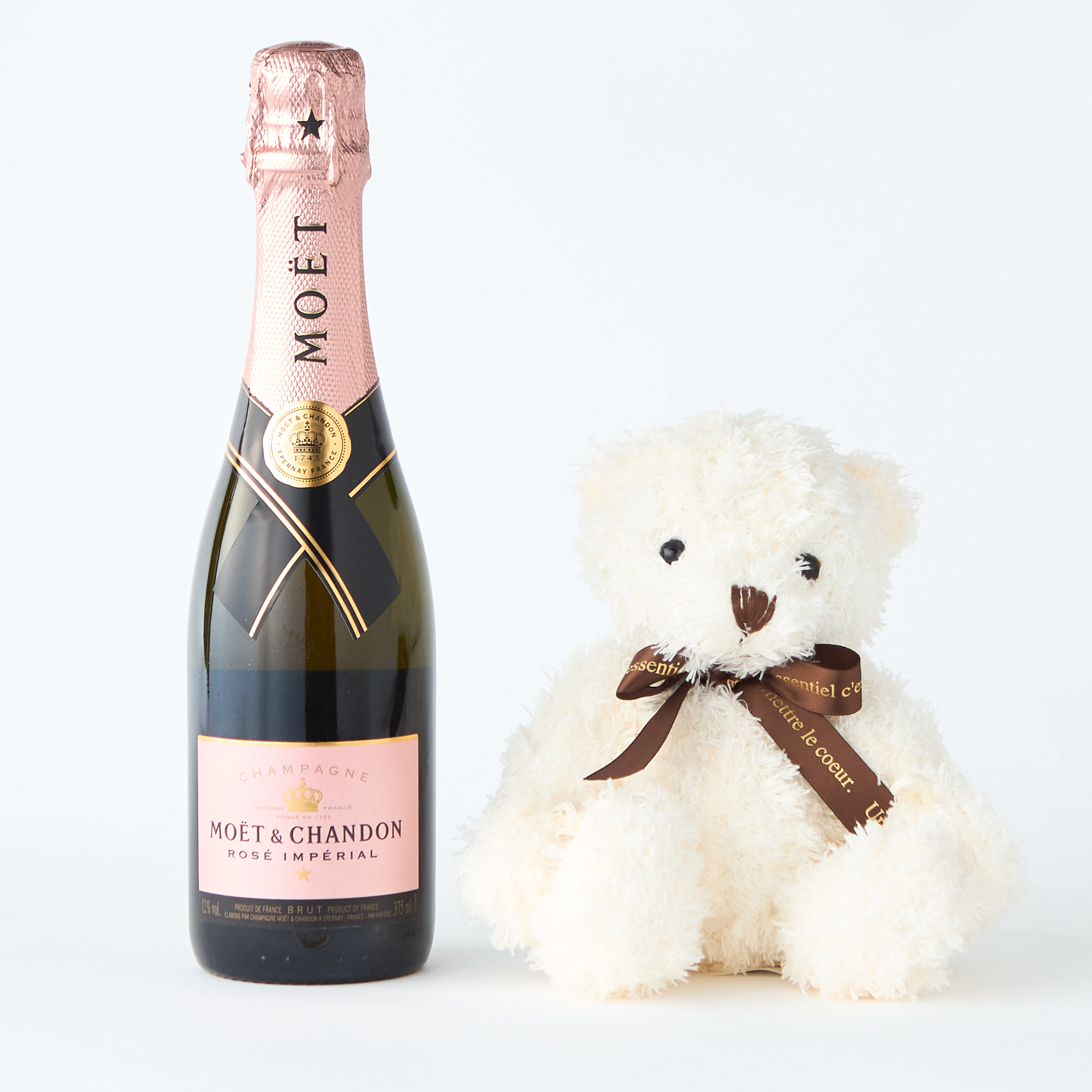 世界中で絶賛されるこのシャンパン。バランスのとれたエレガントな味わいは、どの料理とも完璧なハーモニーを奏でます。前菜からデザートまで、食事の全コースでお楽しみいただけます。 贈りやすいハーフボトルです。 *テディベアはオプションです