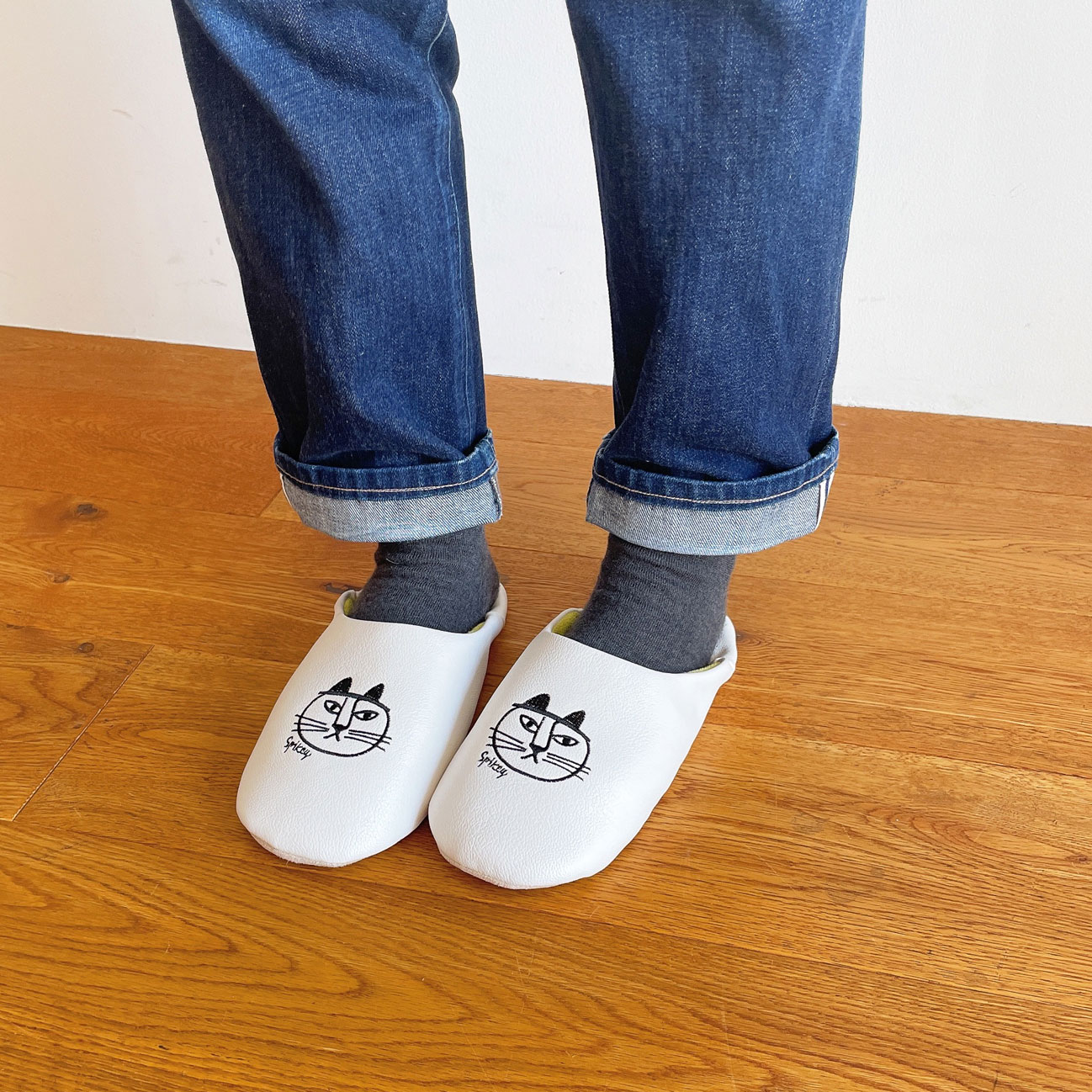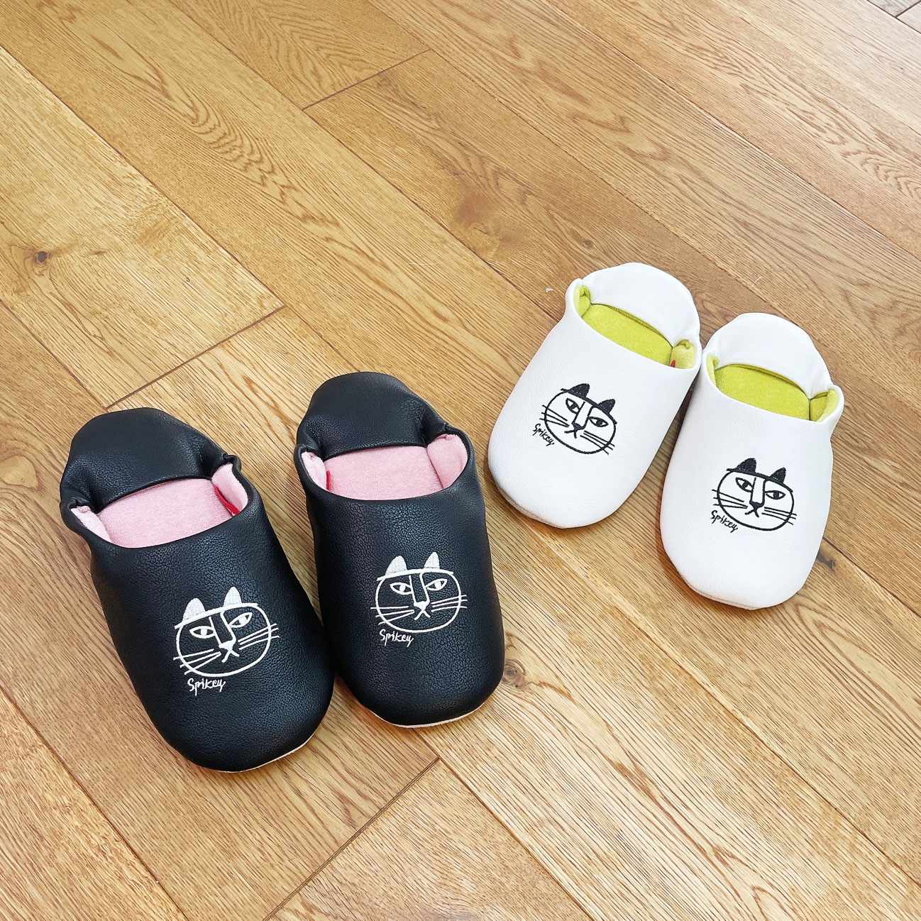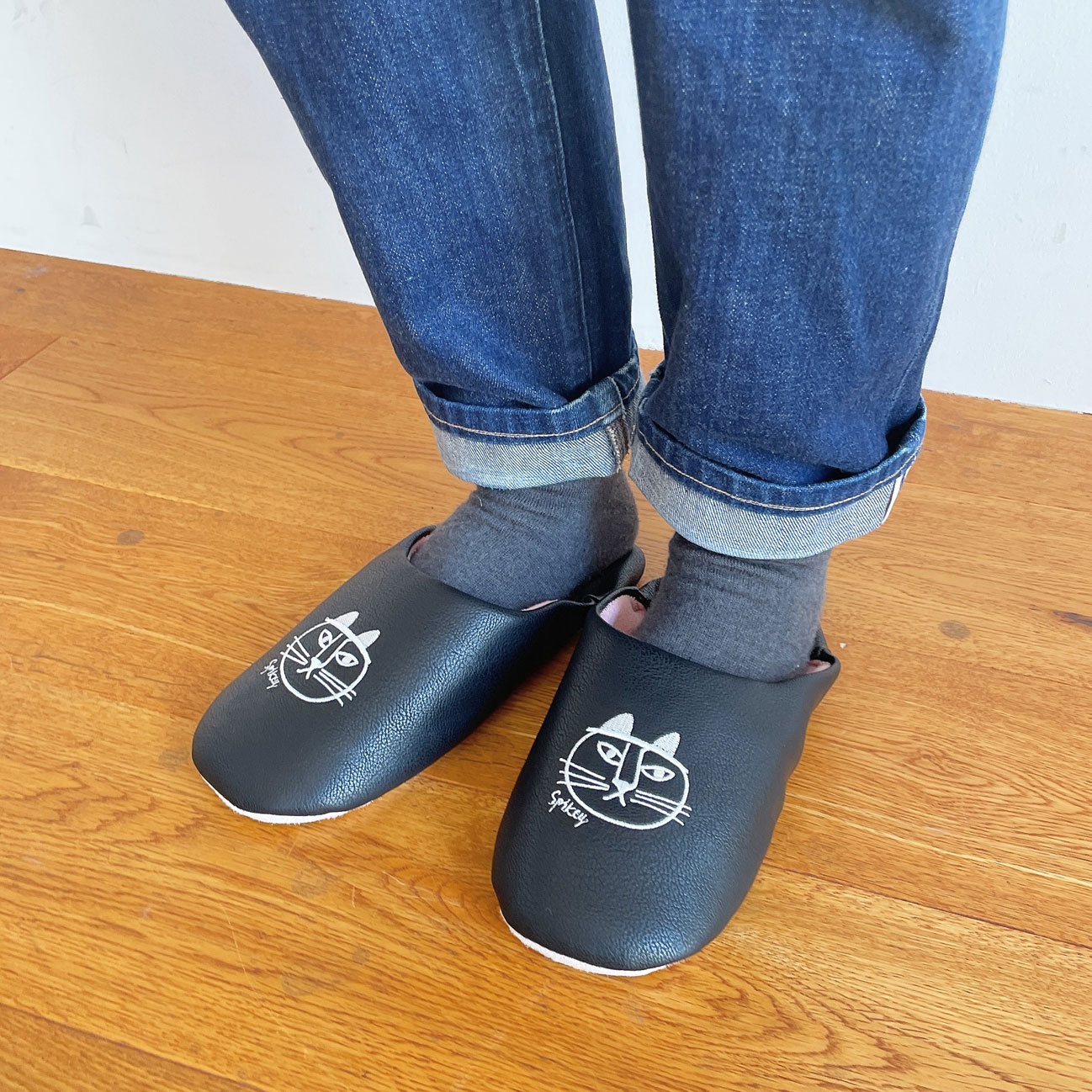 リサのアイデアスケッチのねこたちは作品が生まれるときのキラメキを真空パックにしたような「大人のため」のシリーズです。中でも人気のスパイキーをシンプルなスケッチ刺繍で描いたバブーシュ。鮮やかなパイルの中敷が目を惹くデザインです。合皮素材で、汚れても拭いて簡単にお手入れできます。