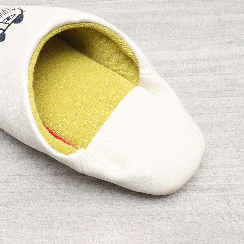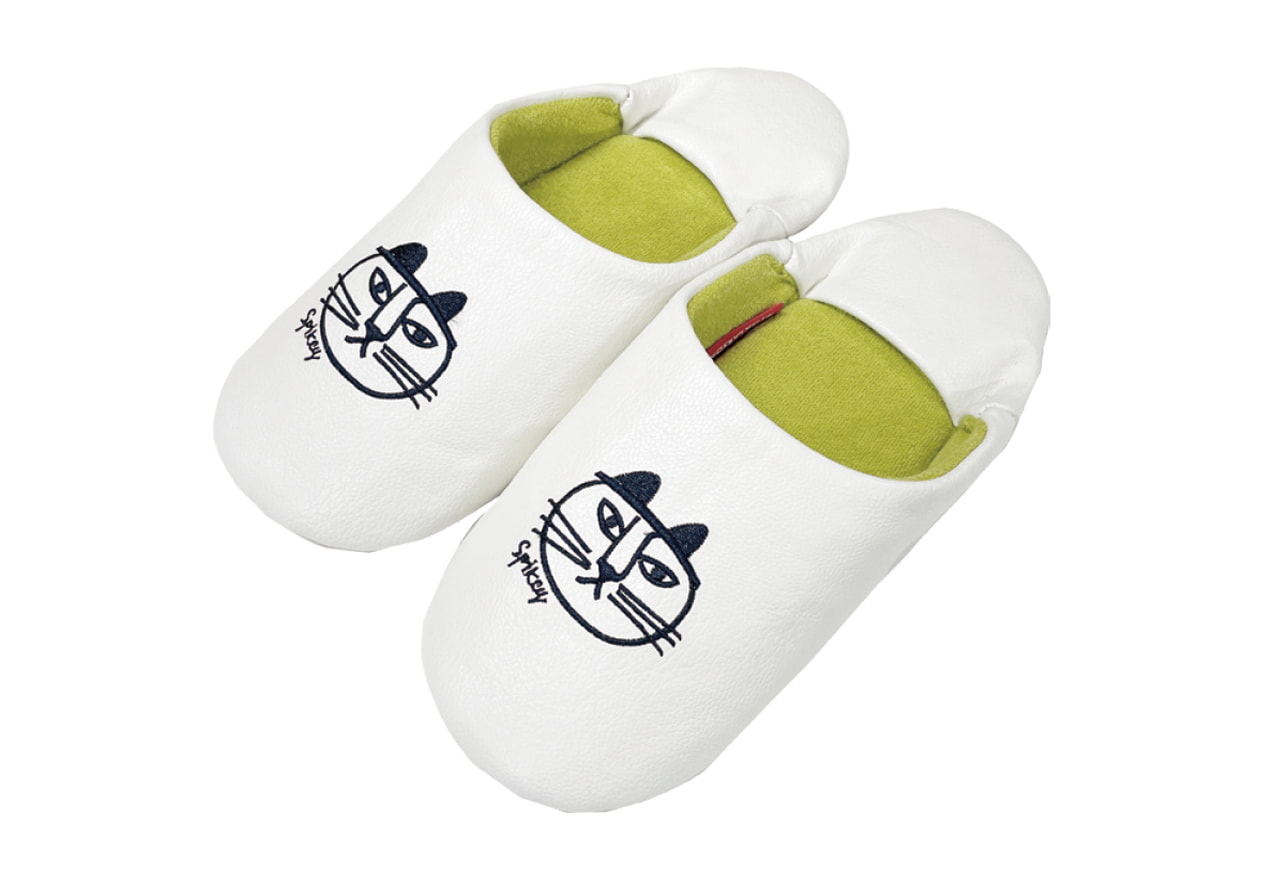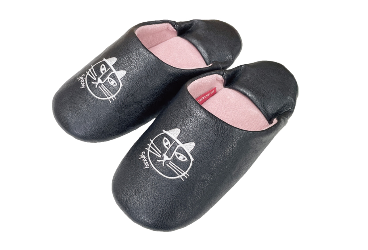 リサのアイデアスケッチのねこたちは作品が生まれるときのキラメキを真空パックにしたような「大人のため」のシリーズです。中でも人気のスパイキーをシンプルなスケッチ刺繍で描いたバブーシュ。鮮やかなパイルの中敷が目を惹くデザインです。合皮素材で、汚れても拭いて簡単にお手入れできます。