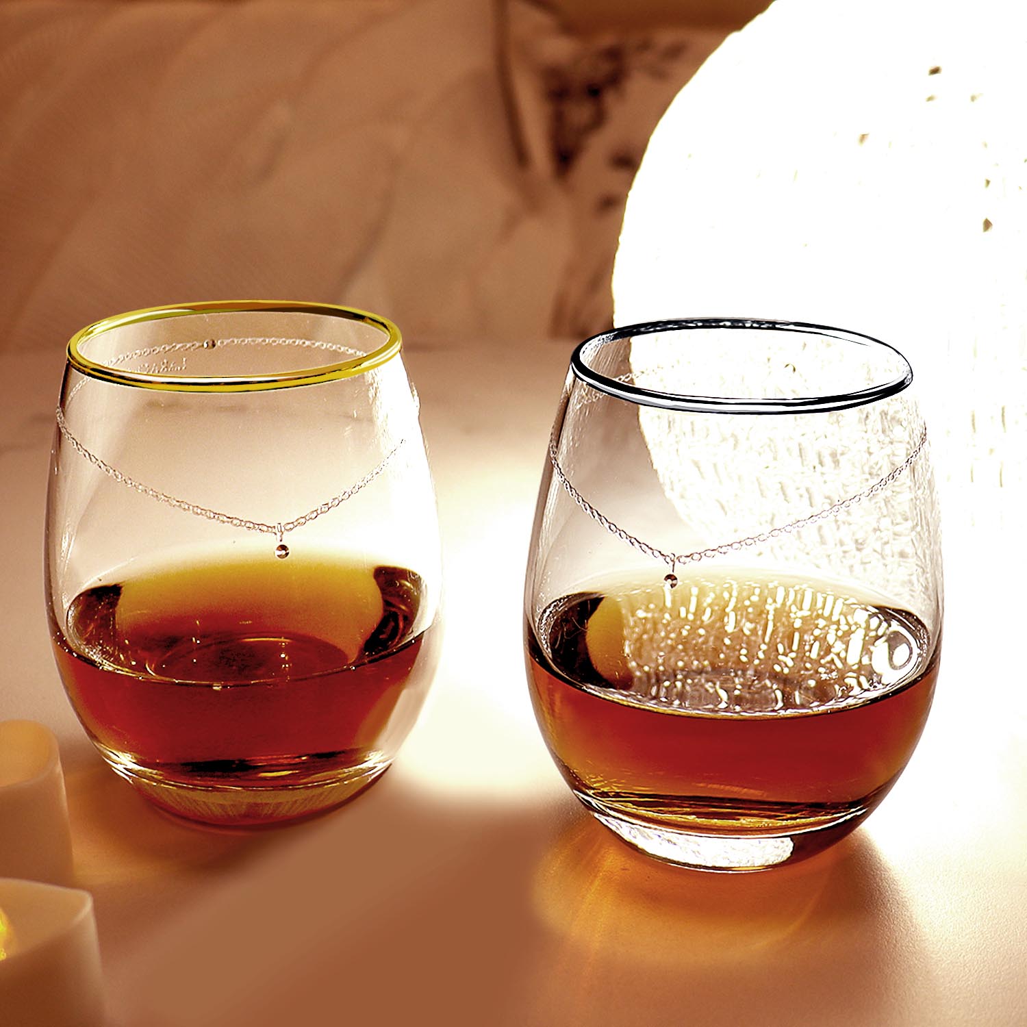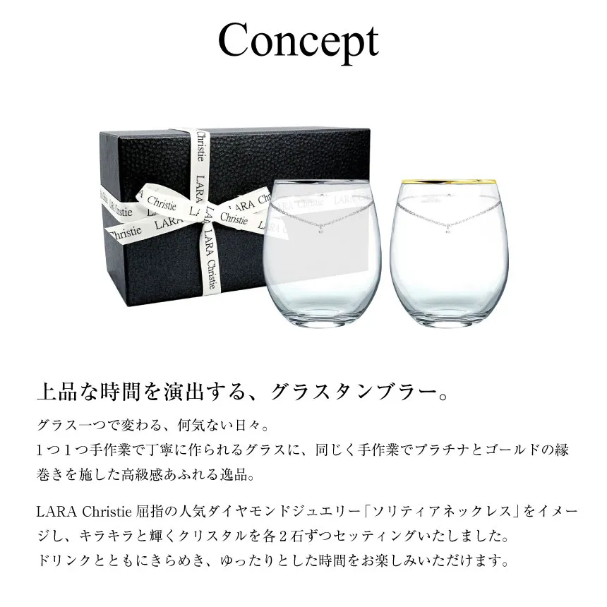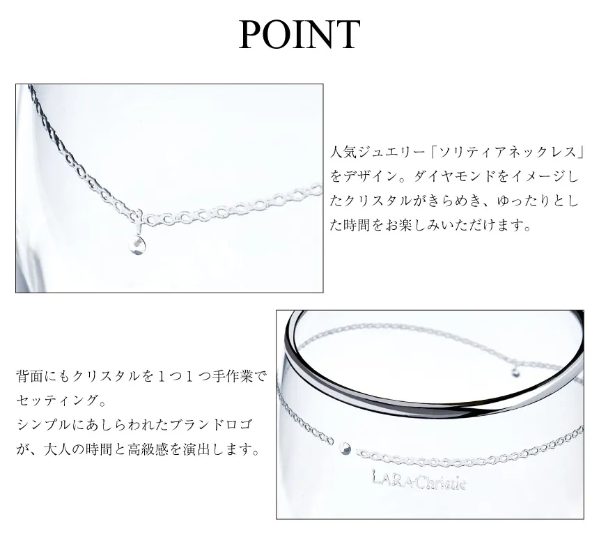 手作業で施したプラチナとゴールドの縁巻きと、LARA Christie屈指の人気ダイヤモンドジュエリー「ソリティアネックレス」をイメージしたデザインに、クリスタルを各2石ずつセッティング。ドリンクとともにきらめき、ゆったりとした時間をお楽しみいただけます。