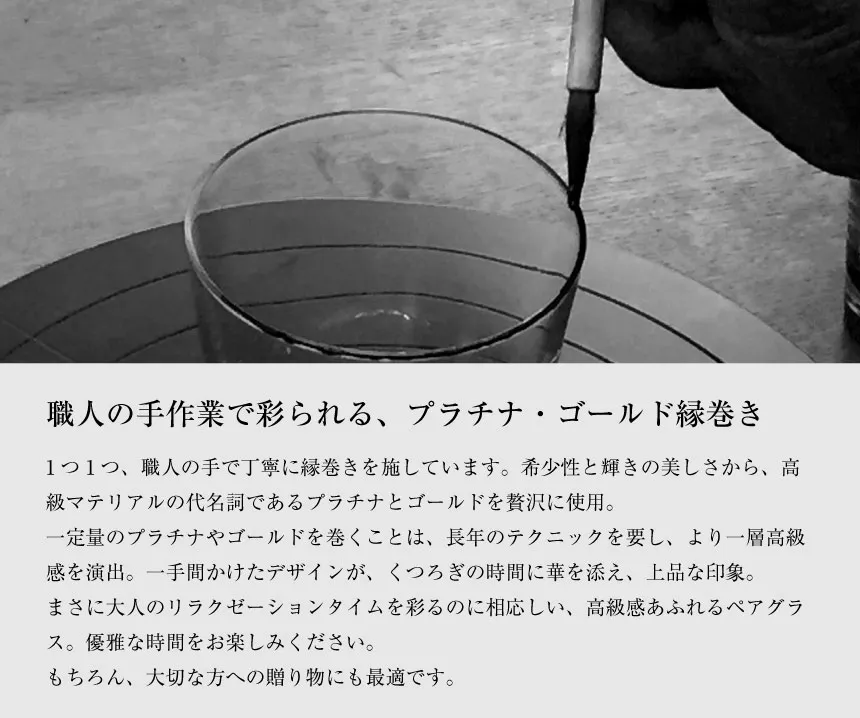 | サイズ | 【ペアグラス】 幅8.5cm×縦8.5cm×高さ9.8cm(口径6.6cm) 外装:ブランド専用化粧箱 幅18cm×縦10.5cm×高さ8.8cm |