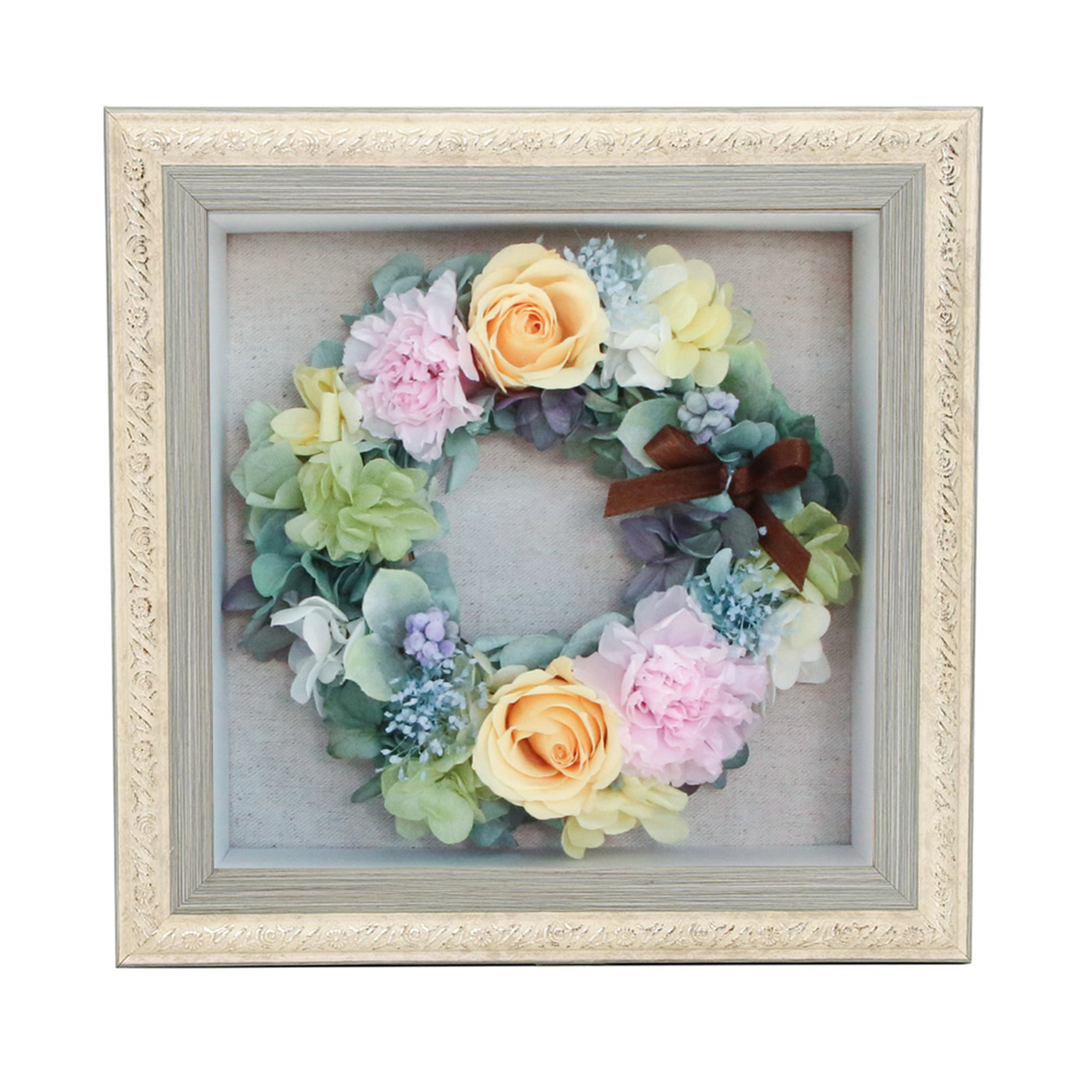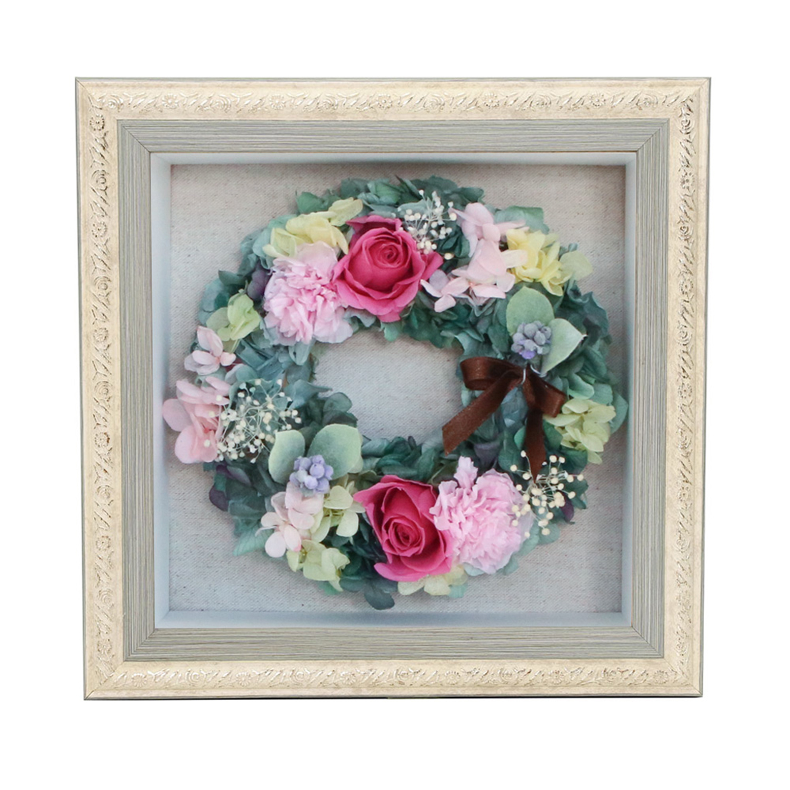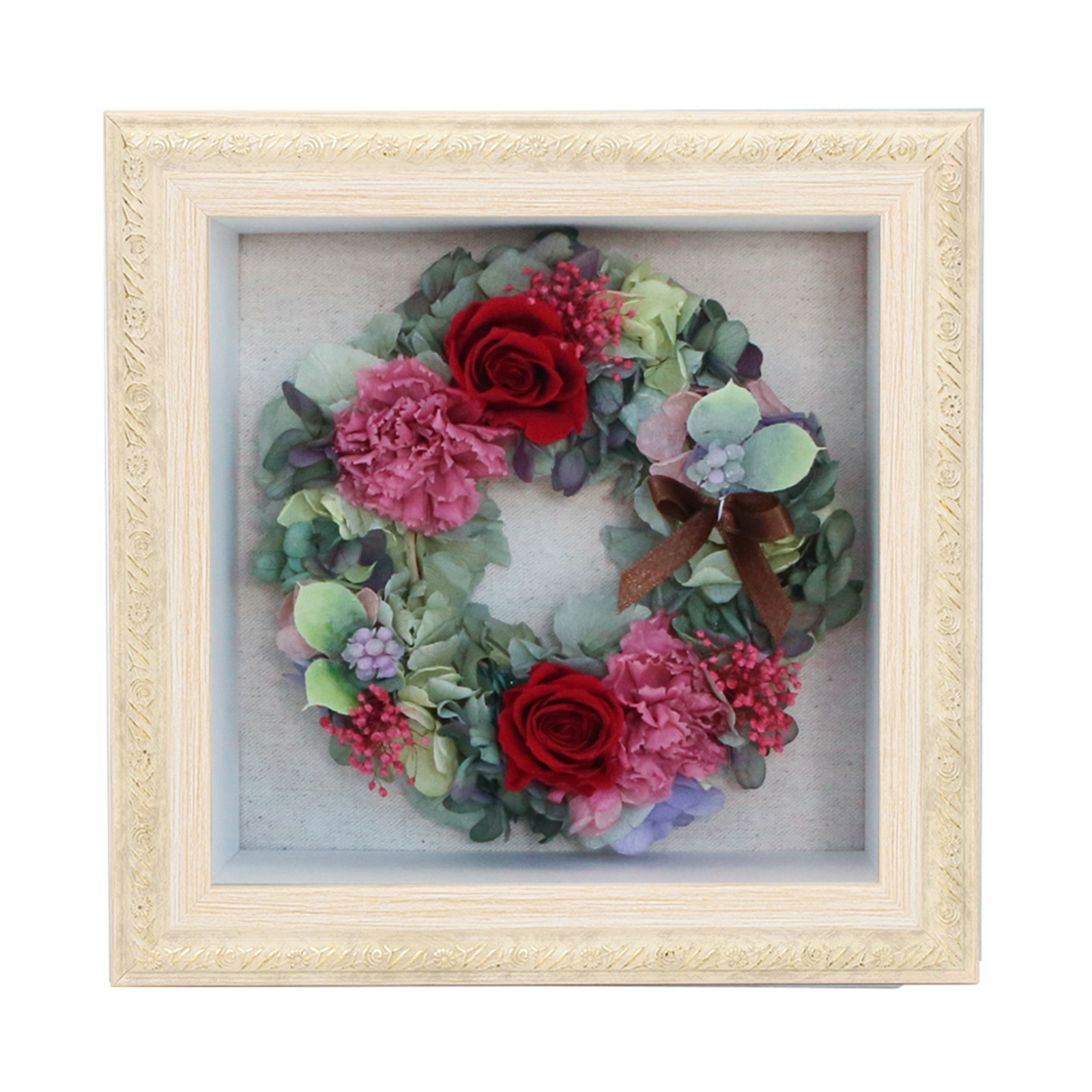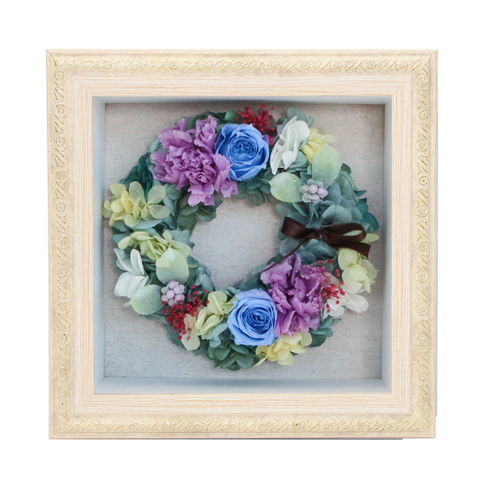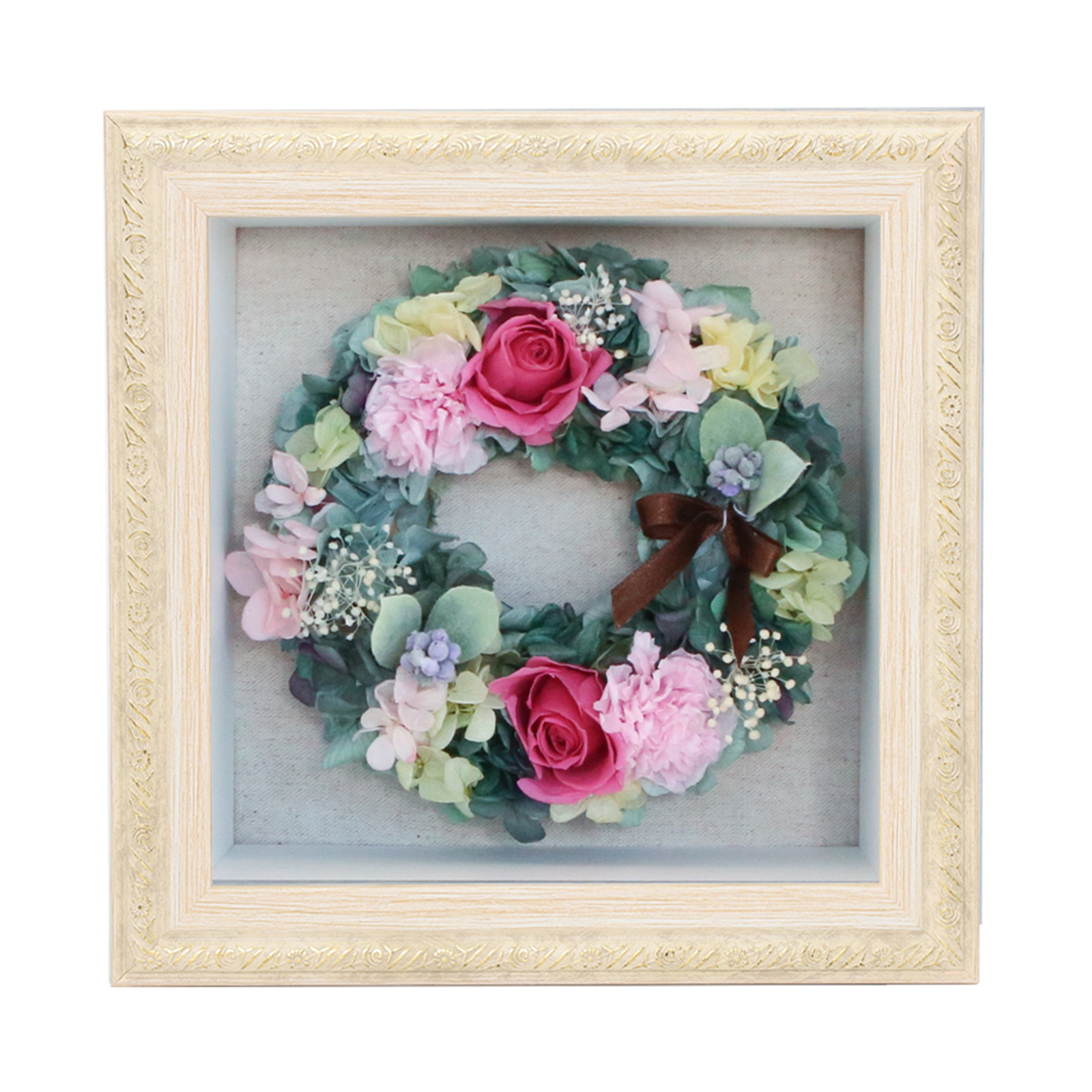 アンティーク調飾りフレームを用いたBOXにリースアレンジを納めました。ほこりや花粉の心配もなく、どこにでも飾っていただけます。