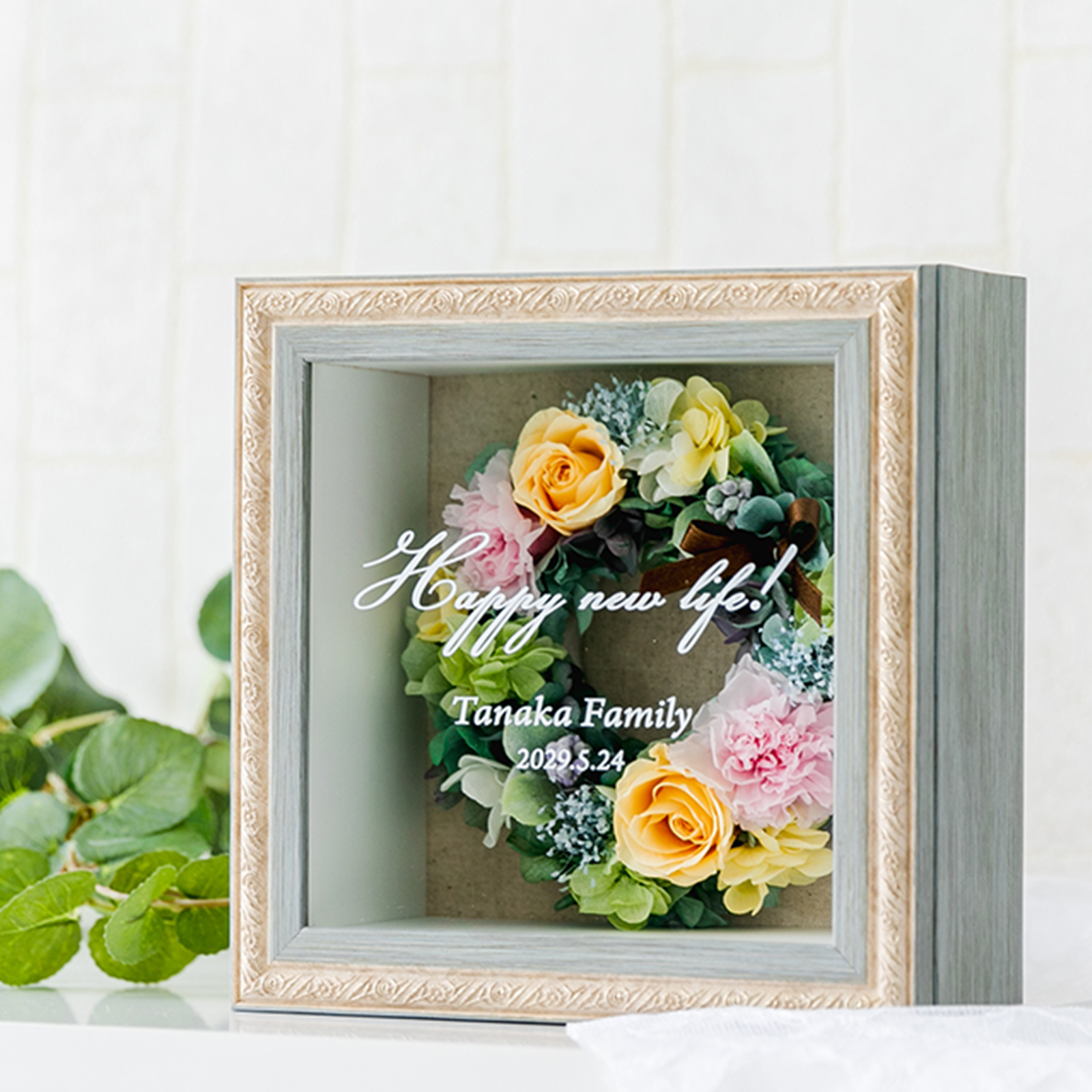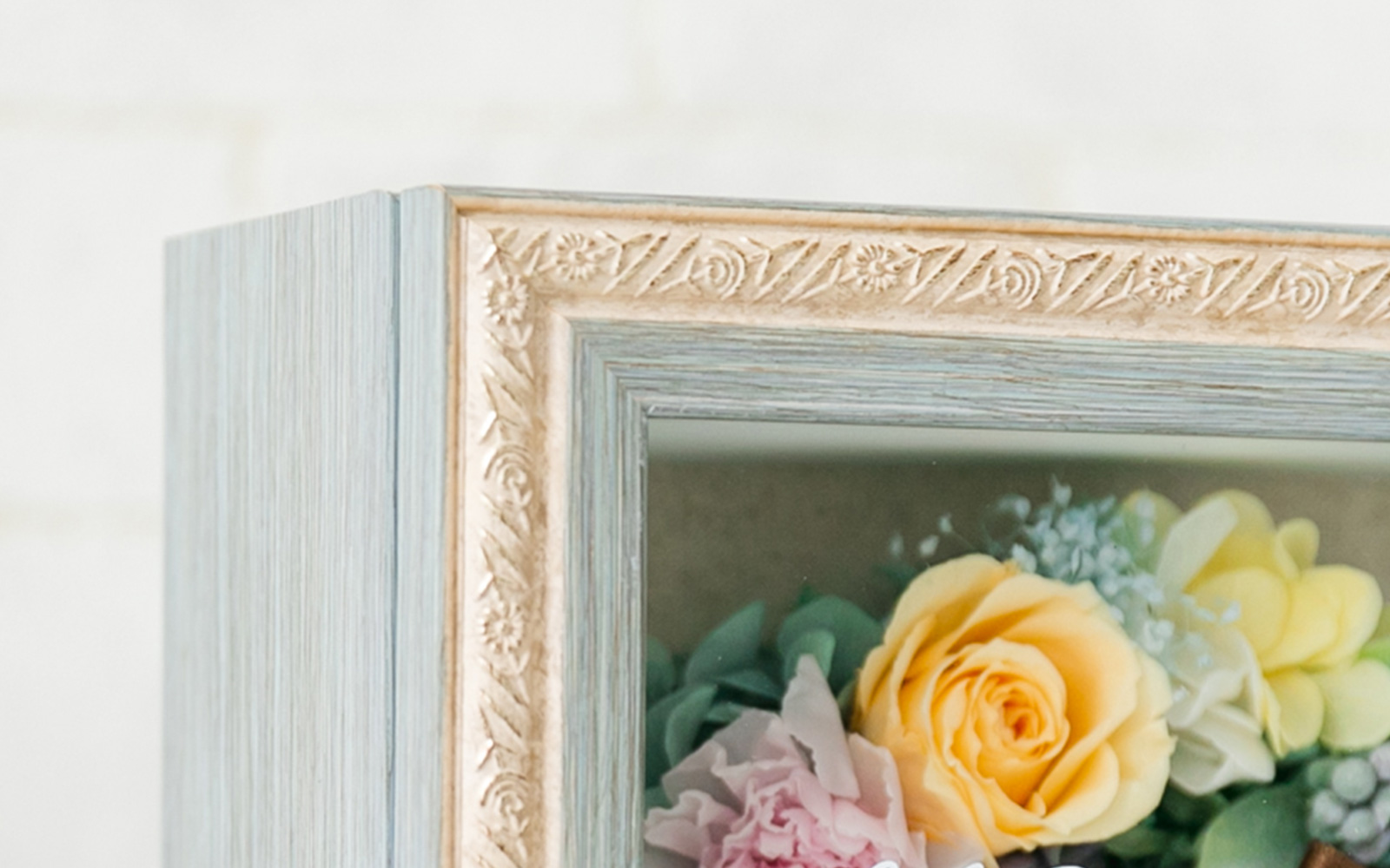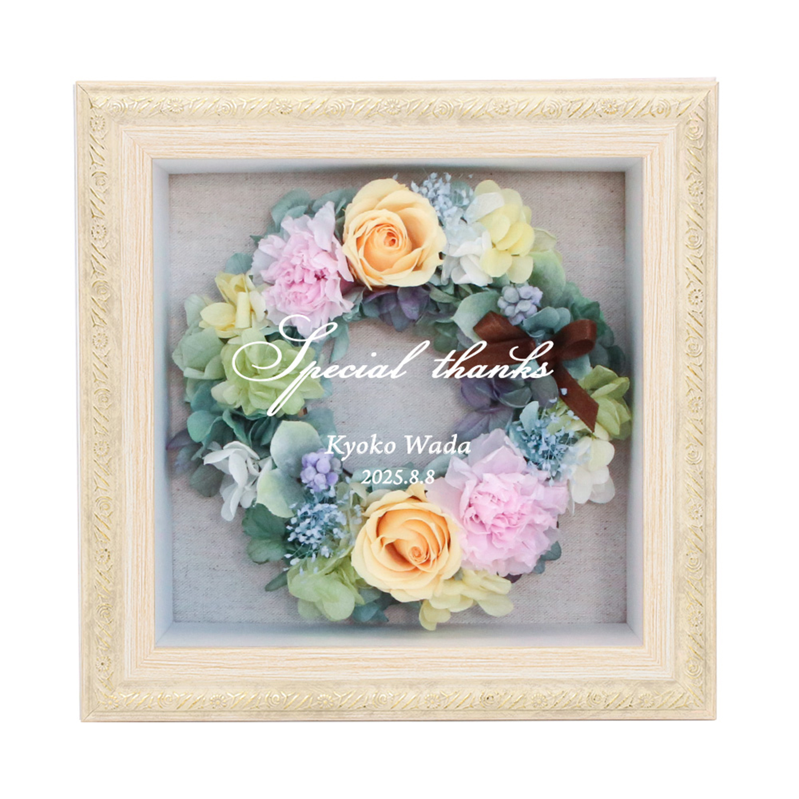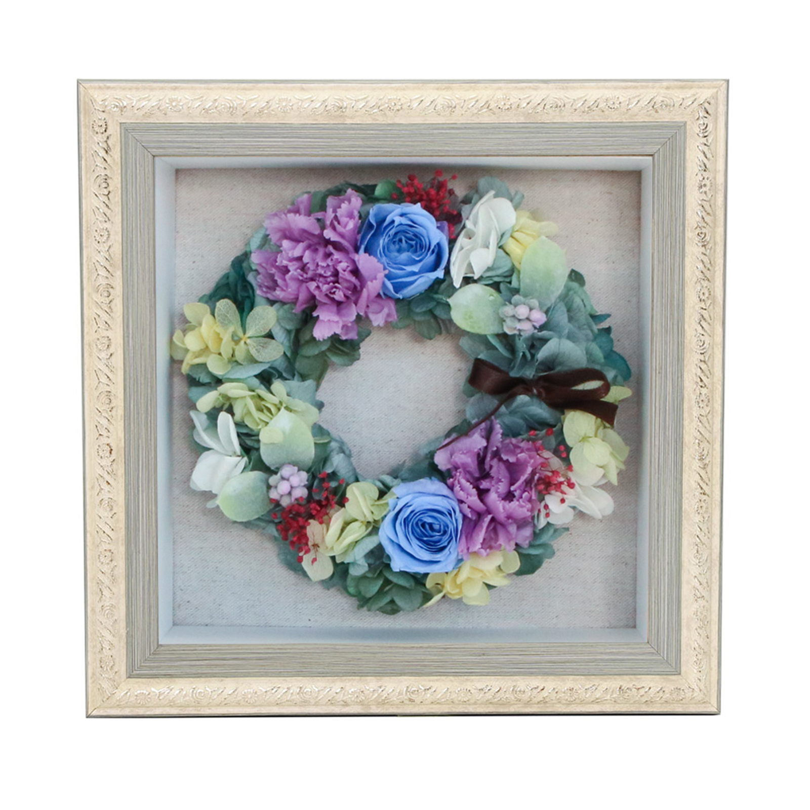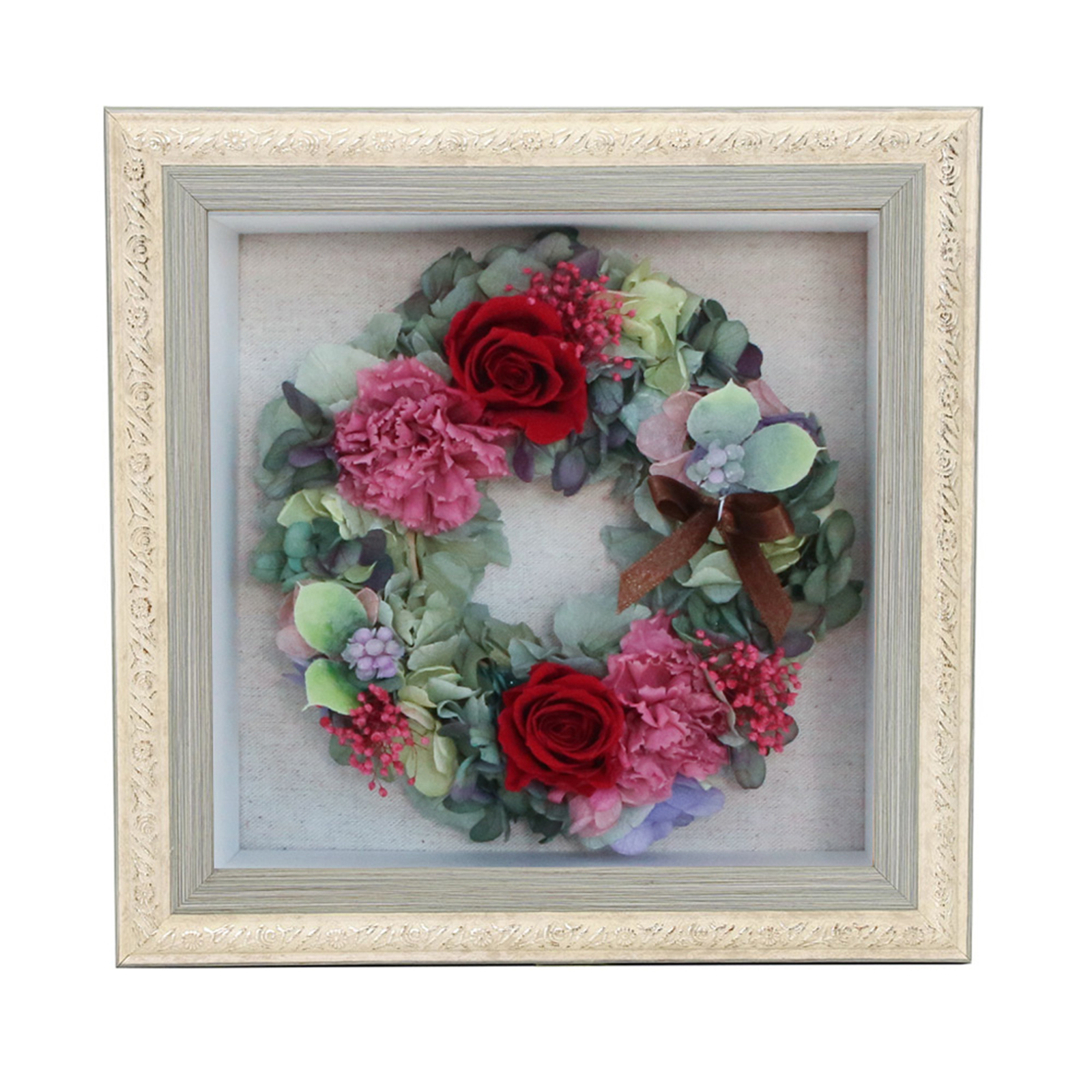 アンティーク調飾りフレームを用いたBOXにリースアレンジを納めました。ほこりや花粉の心配もなく、どこにでも飾っていただけます。