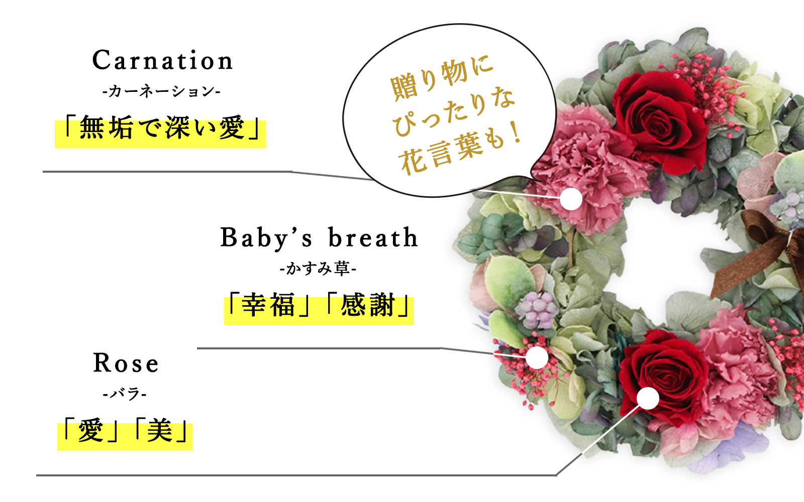 永遠の象徴であるリースを枯れないお花である"ブリザーブドフラワー"でアレンジしました。贈るお相手の幸せが永遠に続きますようにと願いを込めて、ずっと飾っていただけるアイテムです。