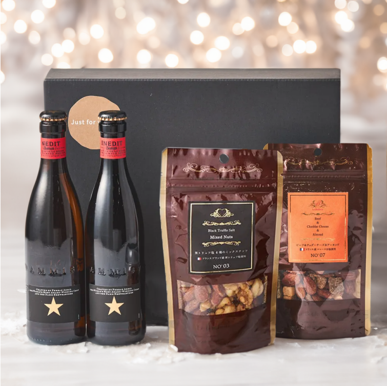 大口注文・法人のお問い合わせはこちら究極のビールとして名高いイネディットと贅沢なトリュフやビーフジャーキーも入ったミックスナッツをセットにしました。