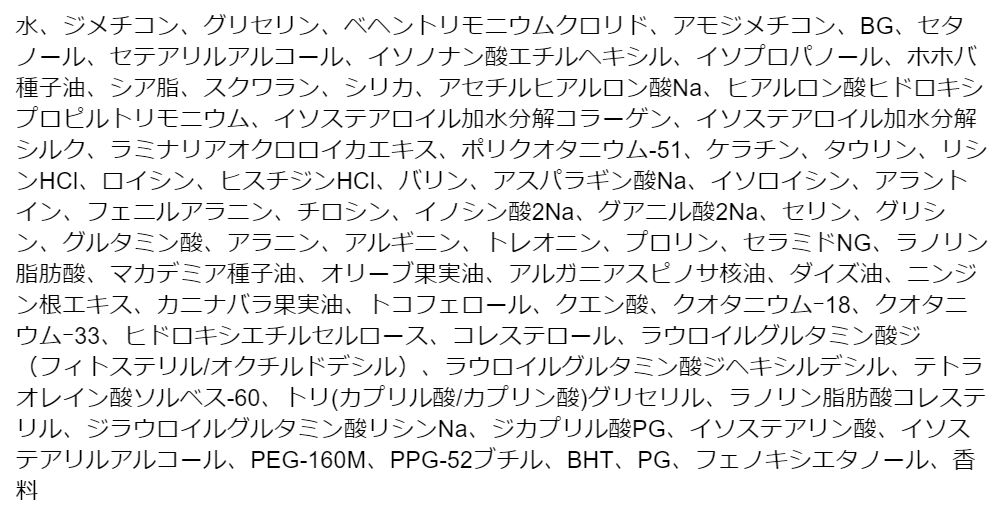 | ご使用上/安全上の注意 | ・お肌に異常が生じていないかよく注意して使用してください。 ・お肌に合わないとき即ち次のような場合には、使用を中止してください。そのまま化粧品類の使用を続けますと、症状を悪化させることがありますので、皮膚科専門医等にご相談されることをおすすめします。 (1)使用中、赤味、はれ、かゆみ、刺激等の異常があらわれた場合 (2)使用したお肌に、直射日光があたって上記のような異常があらわれた場合・傷やはれもの、湿疹等、異常のある部位にお使いにならないでください。 ・目に入った時は、すぐに洗い流してください。 ・高温や直射日光に当たる場所、幼小児の手の届く場所には保管しないでください。 ・天然由来成分を配合しているため、温度の変化等でまれにオリや沈殿物が発生することがありますが、 製品の品質や安全性には問題ありません。 |